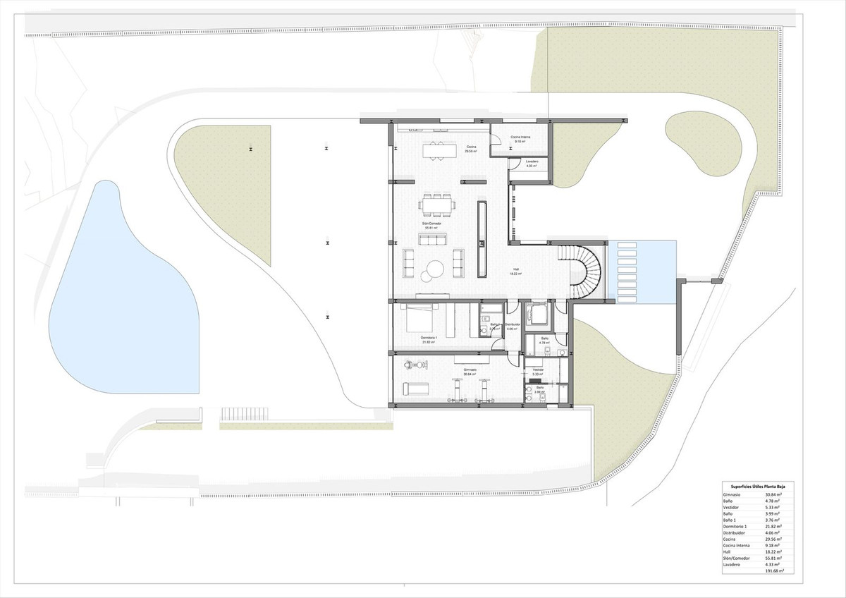 The project includes five large bedrooms, including a generously sized master suite, several living areas, a private gym, service areas, and an elegant central staircase as a key architectural feature.