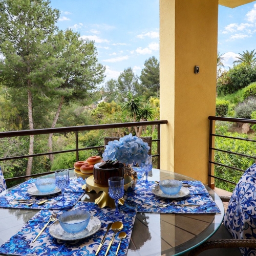 Den verkliga mittpunkten i detta magnifika hem är den spektakulära privata terrassen på 30 m². Med en elegant täckt matplats och utrustad med infällbara markiser för optimal klimatkontroll är det den ultimata platsen för underhållning utomhus. Gå direkt från din privata terrass ut på oklanderligt välskötta gräsmattor, som flyter ansträngningslöst mot den spektakulära gemensamma uppvärmda poolen – omgiven av mogna palmer.