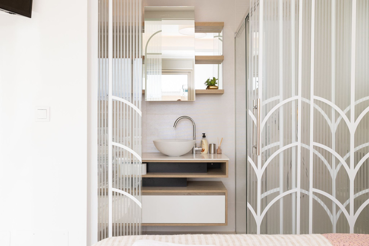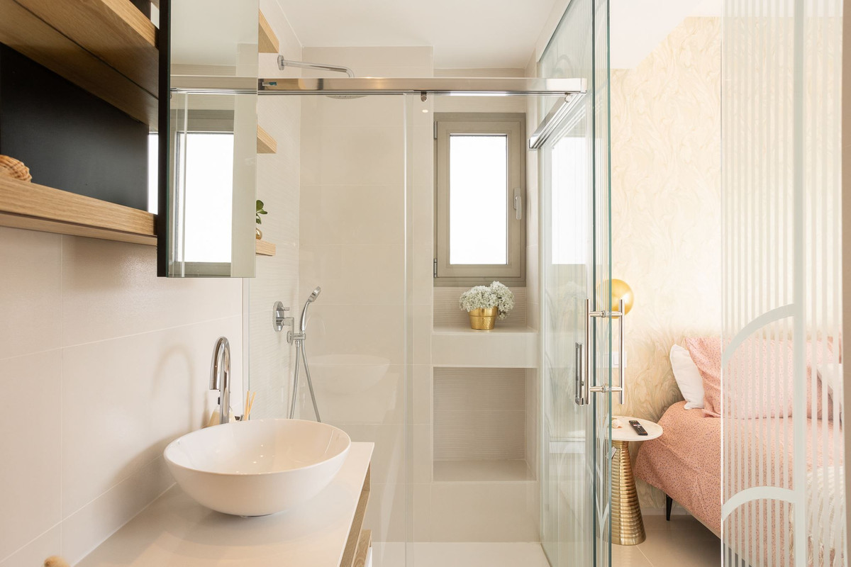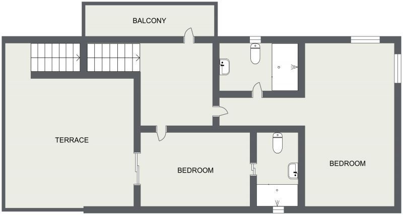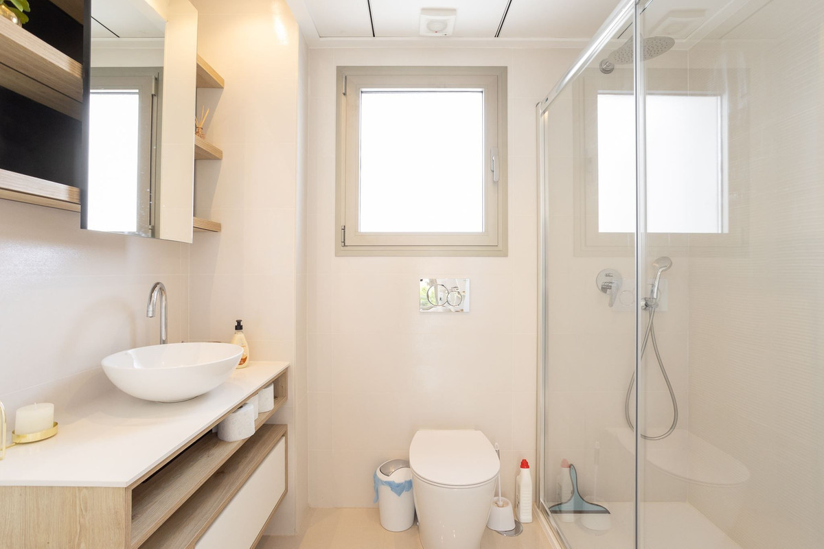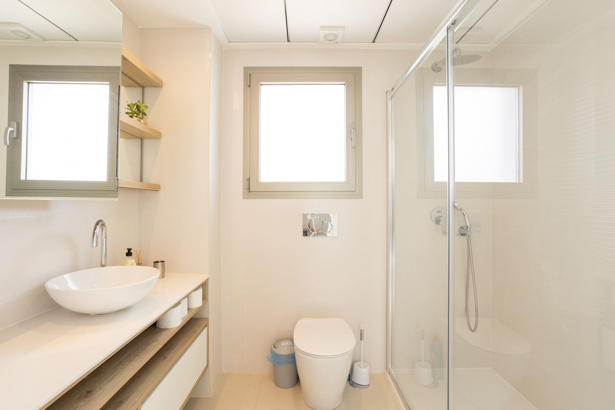De tre badrum är utrustade med toalett, handfat och dusch.