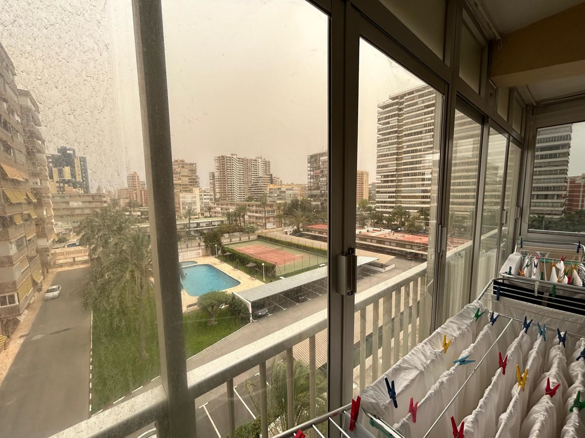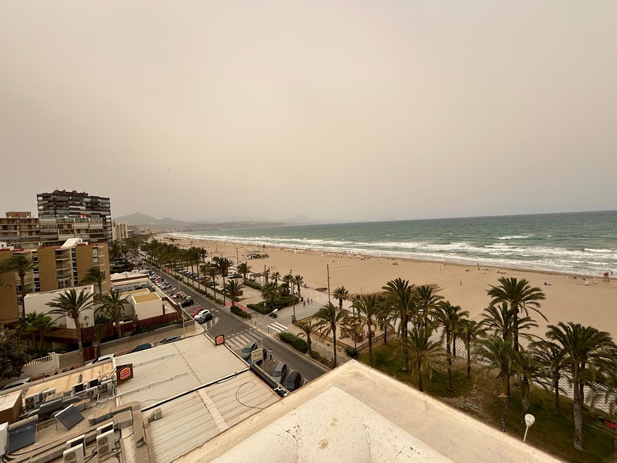 Från lägenheten och balkongen bjuds utsikt över det gemensamma poolområdet, Playa de San Juan och Medelhavet.