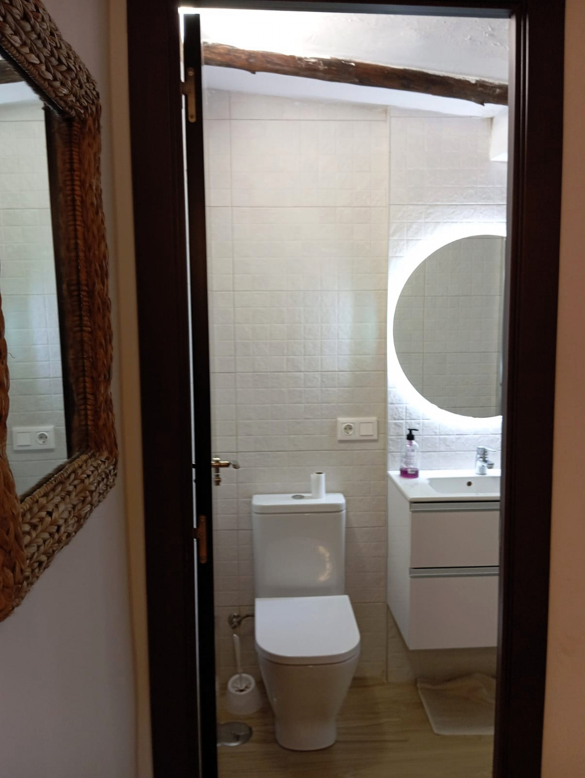 Ground Floor: Fully renovated with a modern touch. It features a welcoming entrance, a bright living-dining area with a high-quality pellet fireplace for cozy winters, and a stylish kitchen with a pantry. The floor is finished with elegant wood-effect porcelain tiles. There is also a modern bathroom with a walk-in shower.