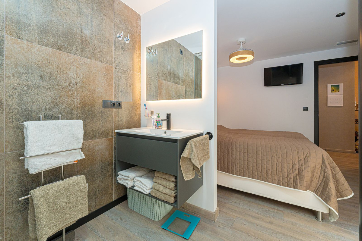 Next to the kitchen, a door leads to the master bedroom, which also has an en-suite bathroom and direct access to the terrace. Both bathrooms feature walk-in showers, black toilets, elegant bathroom furniture, and illuminated mirrors. In short: an ideal apartment for permanent living, holidays, or a sunny winter escape.