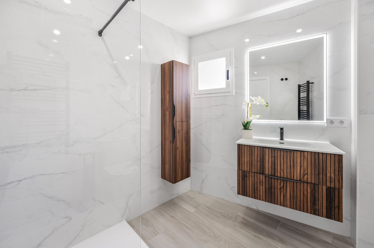 Inside, the apartment features a bright, updated interior with a practical layout. The entrance hall leads into a modernised kitchen, followed by a well-proportioned bedroom. The master suite includes its own bathroom and direct access to the terrace. The living and dining area is comfortable and well laid out, with sliding doors opening onto the terrace.