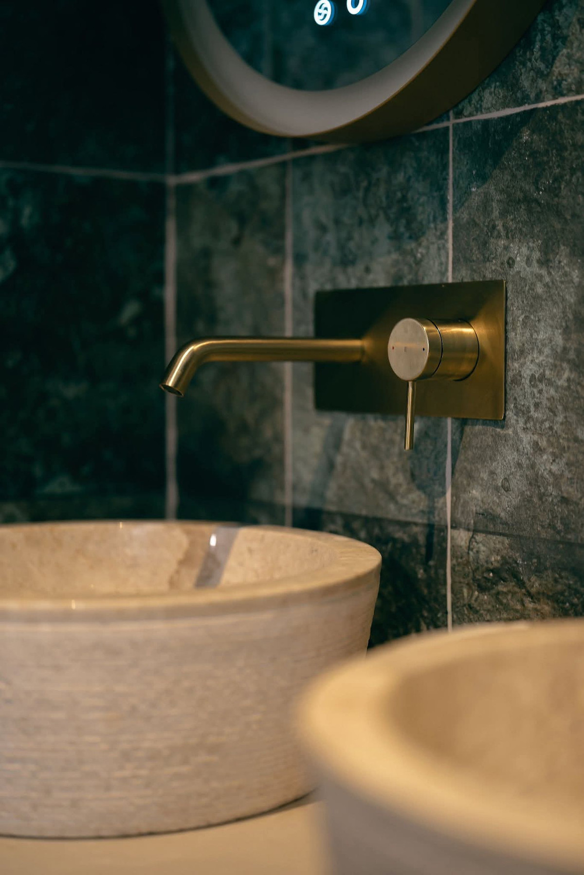 Two bathrooms with green emerald-like tiles complementing stone sinks and exclusive taps. The largest bathroom has double sinks.