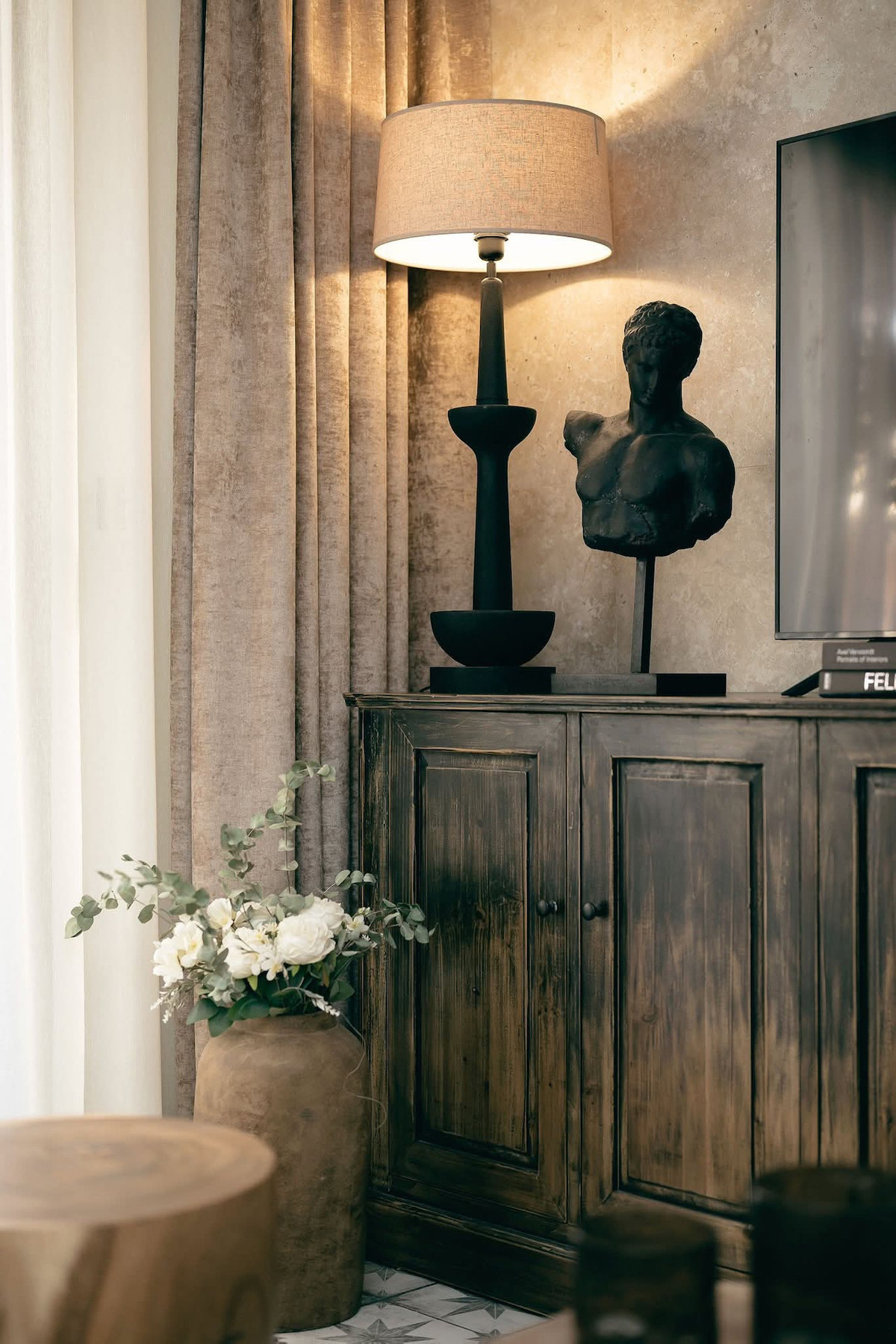 The living room with an exclusive sofa, wool rug and a vintage TV stand has access to the front terrace.