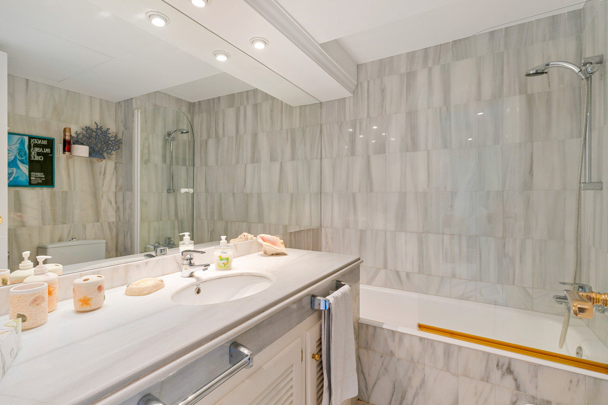 Rymlig tre sovrum bottenvåningen lägenhet ligger i den eftertraktade gemenskapen av Las Jacarandas, Bel Air, inom ett gated komplex med vackert anlagda trädgårdar, två gemensamma pooler och concierge service. Idealiskt beläget nära stranden och ett brett utbud av fritidsfaciliteter, inklusive golfbanor. Denna fastighet erbjuder en öppen plan levande och matplats med direkt tillgång till en privat terrass och trädgård; ett fullt utrustat kök med ett slutna verktygsrum; två gäst sovrum med tillgång till en privat terrass; ett gäst badrum; och ett sovrum med en-suite och tillgång till den privata trädgården. Ytterligare funktioner inkluderar varm och kall luftkonditionering, marmorgolv, monterade garderober och en privat parkeringsplats.