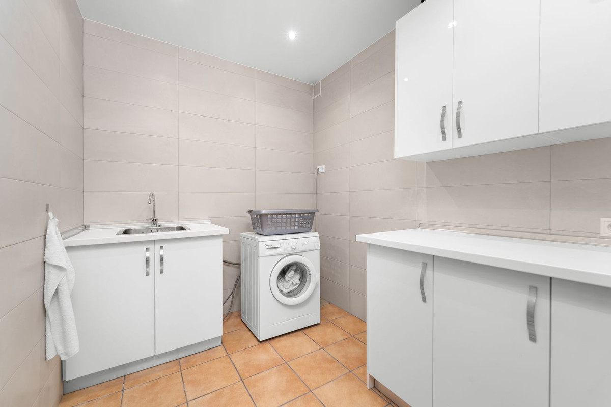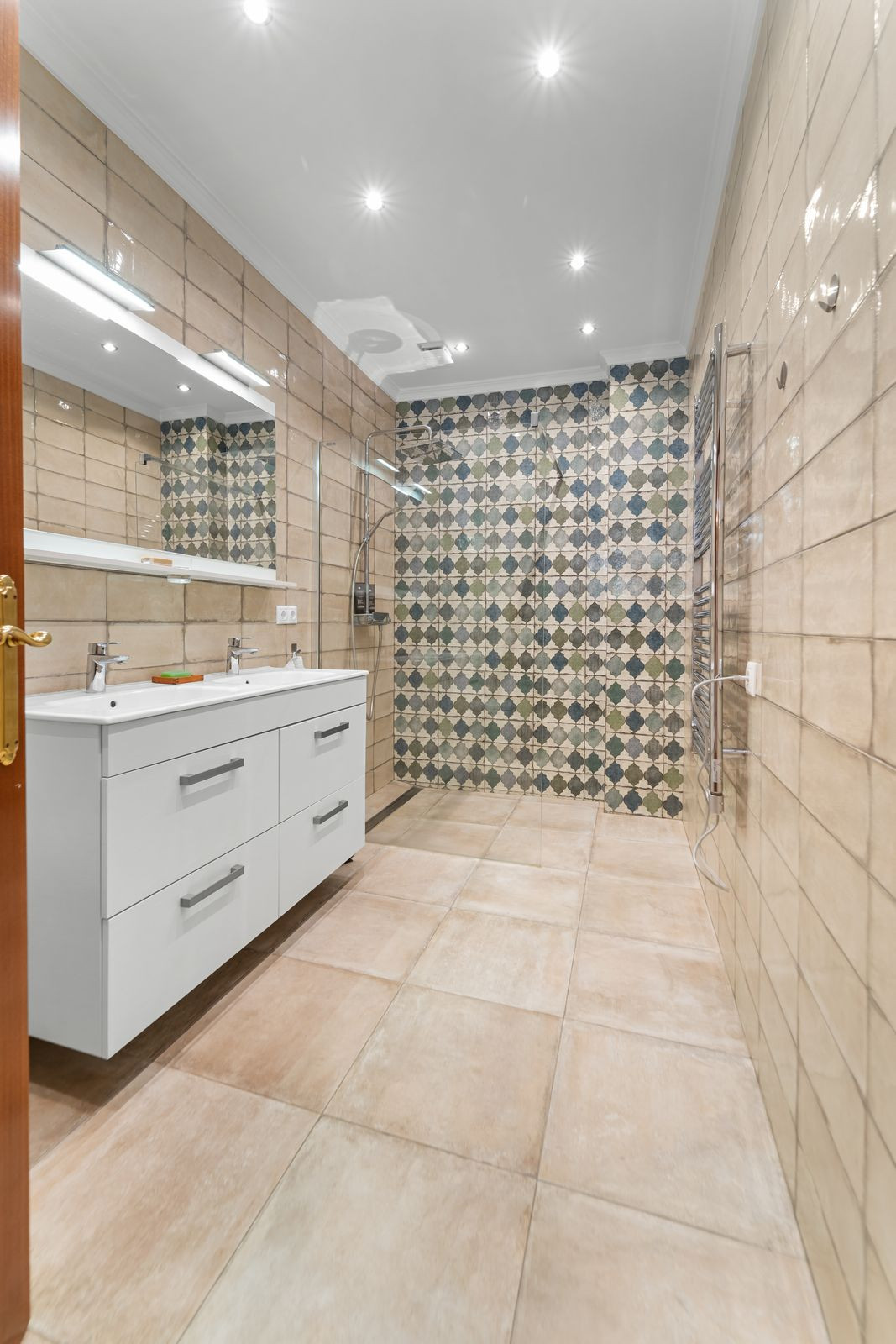 På nedre plan finns fyra sovrum, varav ett har direkt access till trädgård och pool, medan de övriga rummen är rymliga och ljusa.
