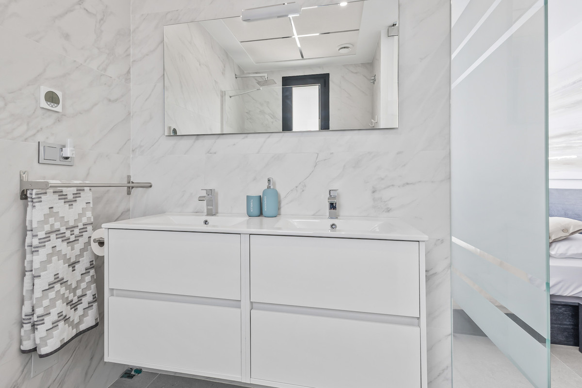 När du går upp till första våningen hittar du huvudsovrummet och gästrummet, båda rymliga och med egna badrum. Samma våning har dessutom en stor balkong med utsikt över poolområdet.