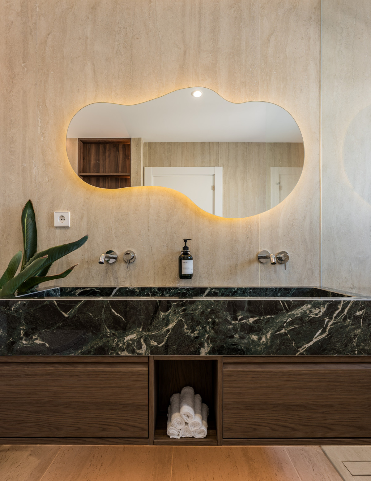 The kitchen is finished with refined Italian marble worktops and includes a custom-built wine bar. A guest bedroom with en-suite bathroom and private terrace completes this floor, providing comfort and privacy for visitors.