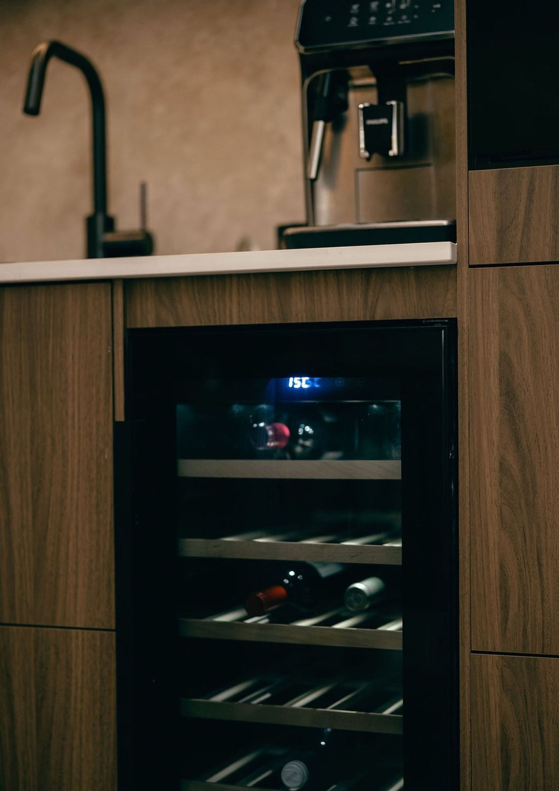 Köket är fullt utrustat med dubbla kyl- och frysskåp, vinkyl, integrerad fläkt och genomtänkta detaljer. Via skjutdörrar kan du enkelt öppna upp mot terrassen och sudda ut gränsen mellan inne och ute.
