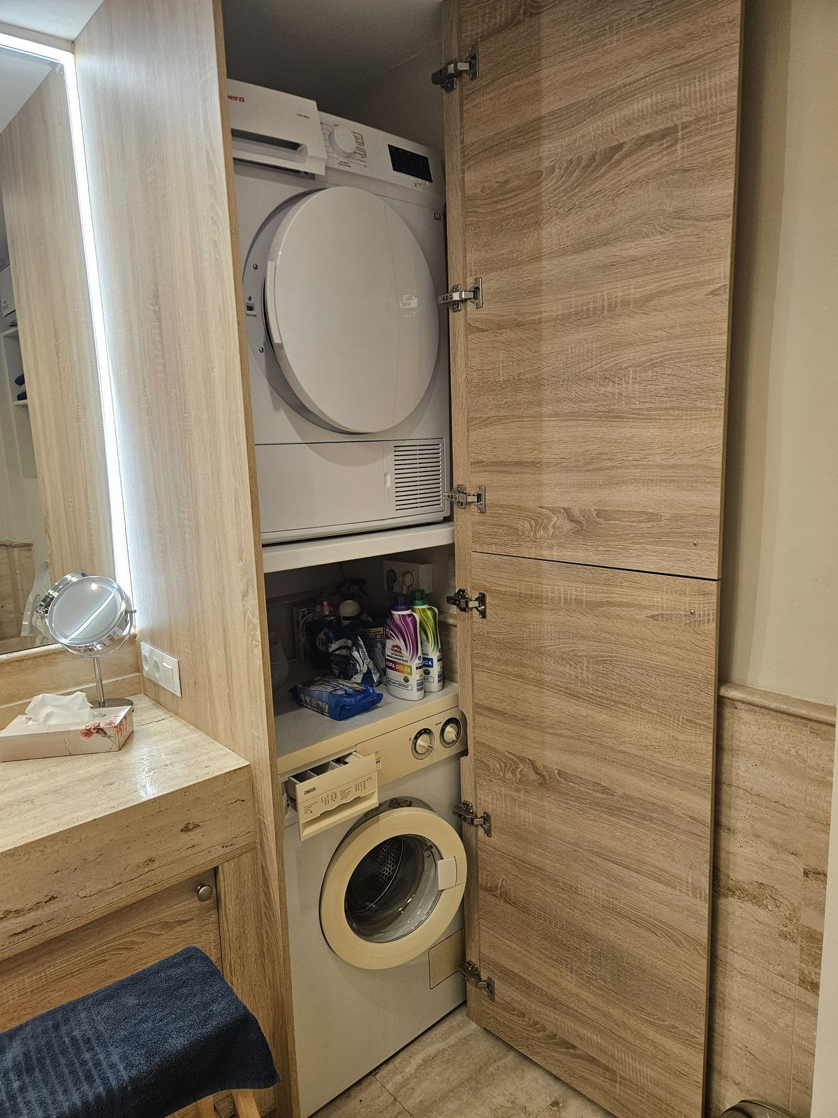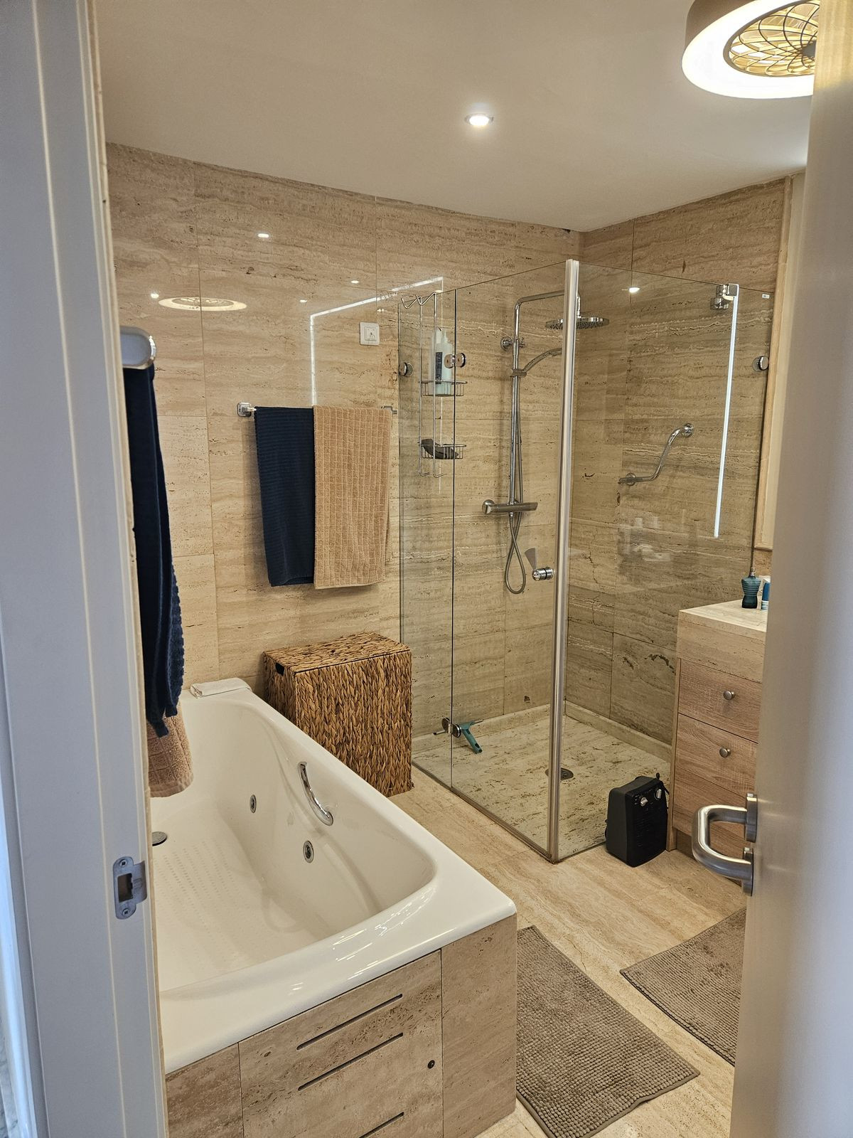 Lägenheten har 2 rymliga sovrum, båda med eget badrum för maximal avskildhet och komfort. Det stora sovrummet är utrustat med stora inbyggda garderober och har både en terrass på framsidan och baksidan – perfekt för att njuta av solen när som helst på dagen. Gästrummet har också en praktisk inbyggd garderob.