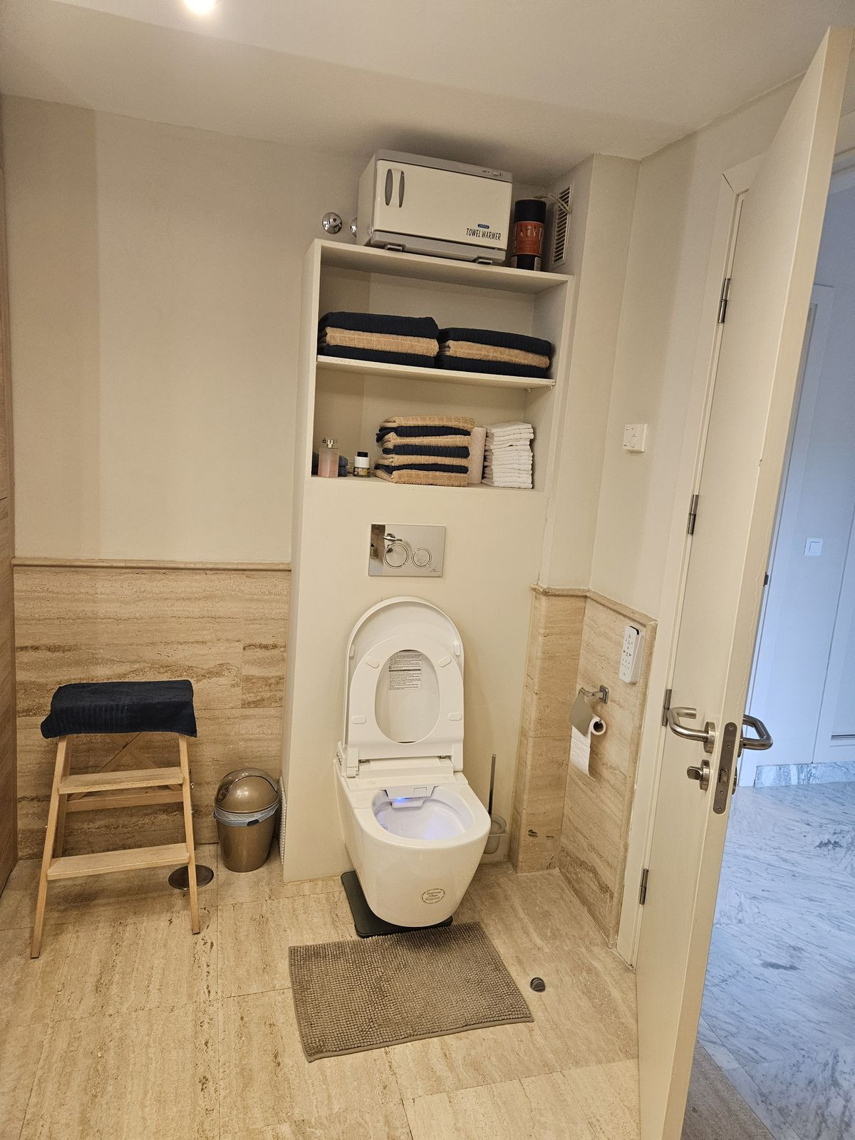 Det ljusa och rymliga vardagsrummet är indelat i en mysig sittgrupp och en separat matplats. Tack vare den moderna glasväggen som kan öppnas helt smälter inomhus- och utomhusutrymmet sömlöst samman. Den stora terrassen är en absolut tillgång, utrustad med infraröd uppvärmning, markiser och återigen en glasvägg som kan öppnas helt – perfekt för alla årstider. Vid klart väder kan du dessutom njuta av en hisnande utsikt ända till Malagas kust.