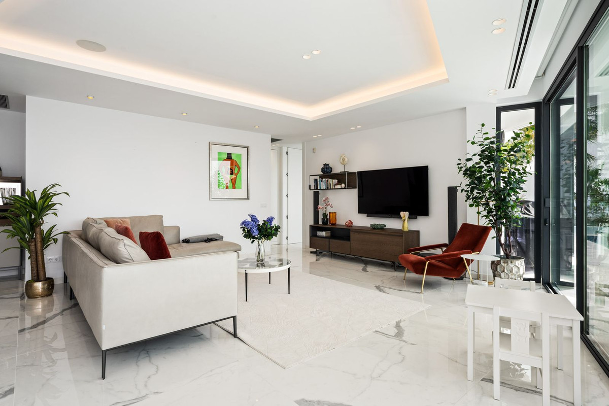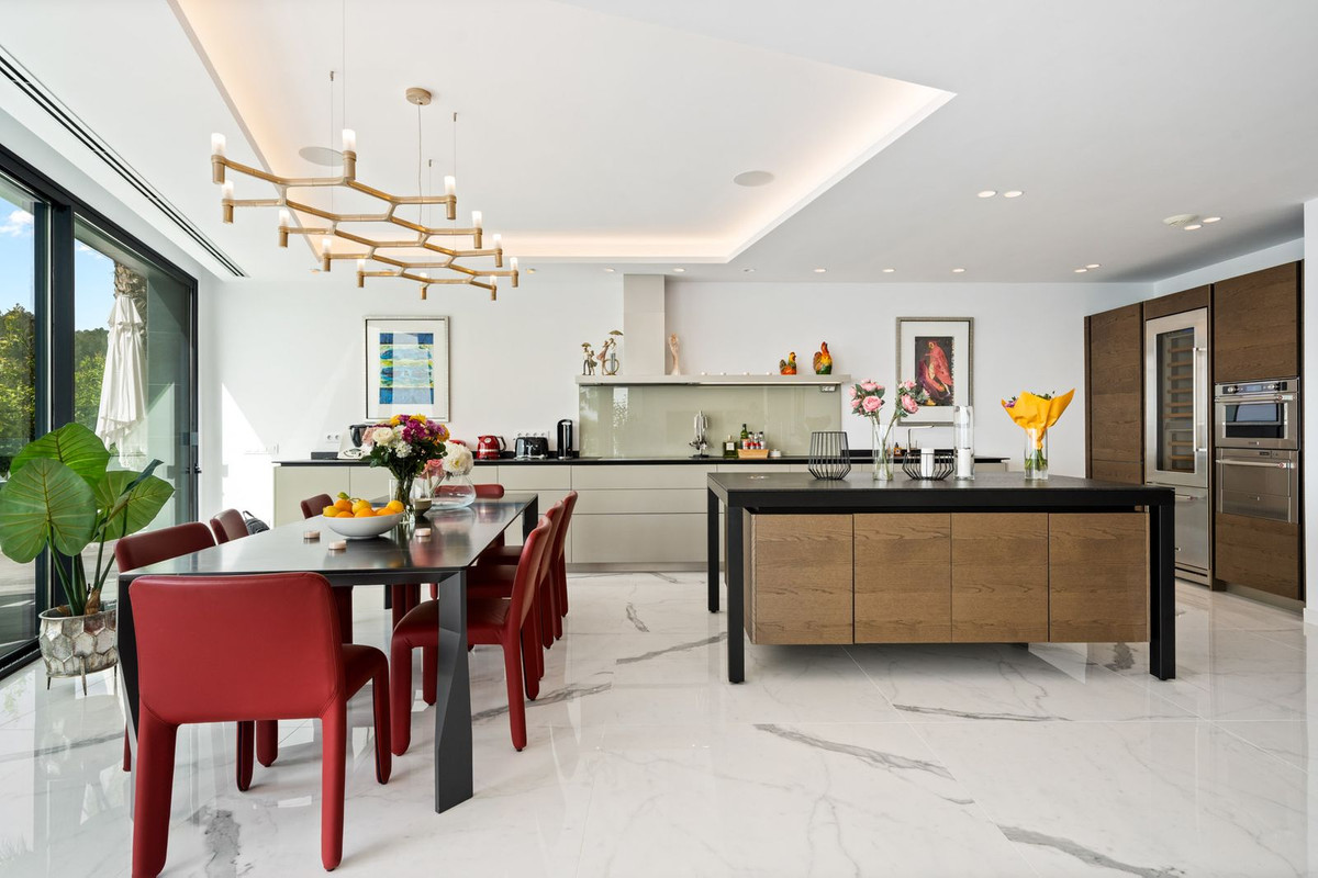 The elegant living area is a spacious, open-plan space, where the living room, dining room, and designer kitchen by Italian brand Molteni Dada create a cohesive, elegant whole. Exclusive Molteni & C furniture and top-quality finishing materials complete the design. A fully integrated Sonos audio system delivers outstanding sound throughout every room.