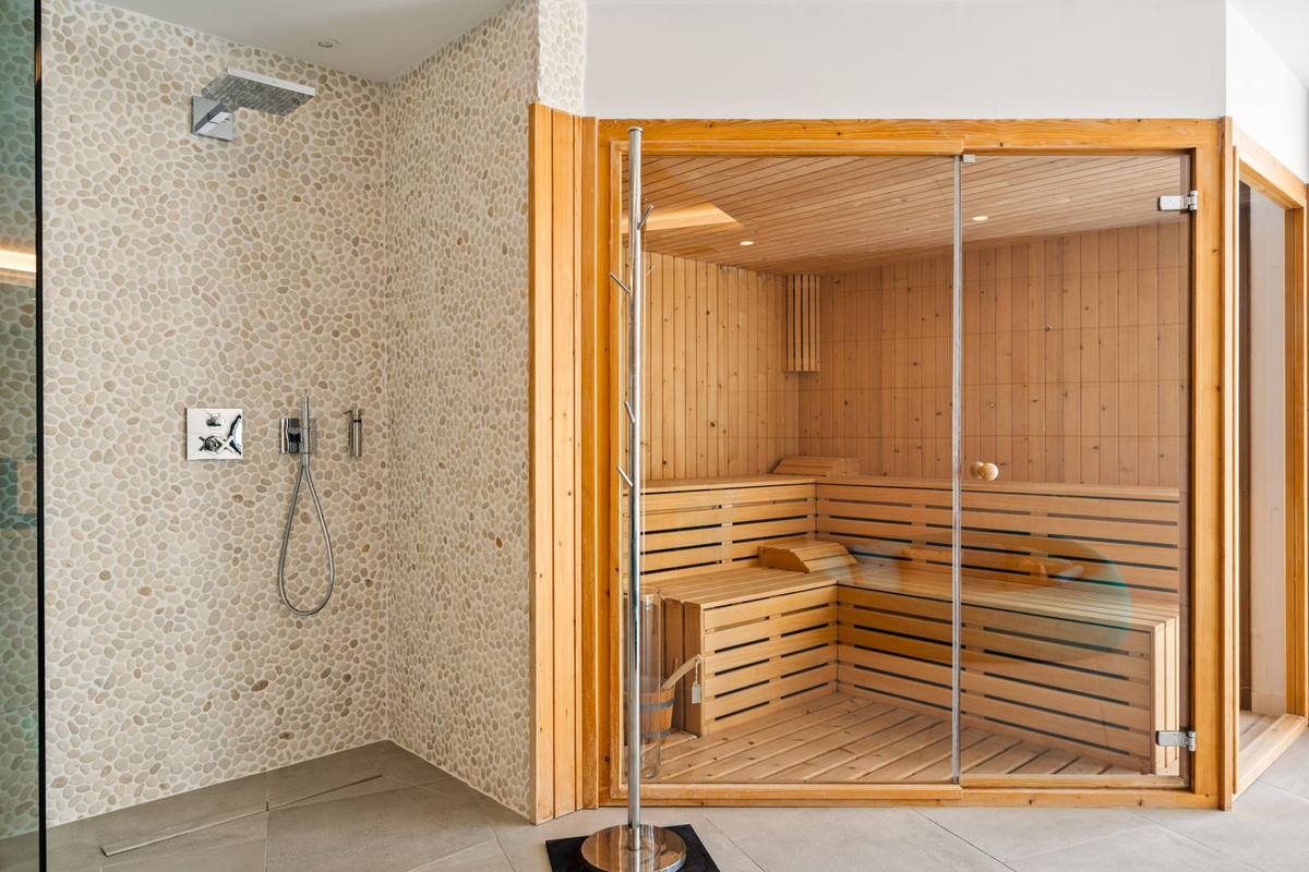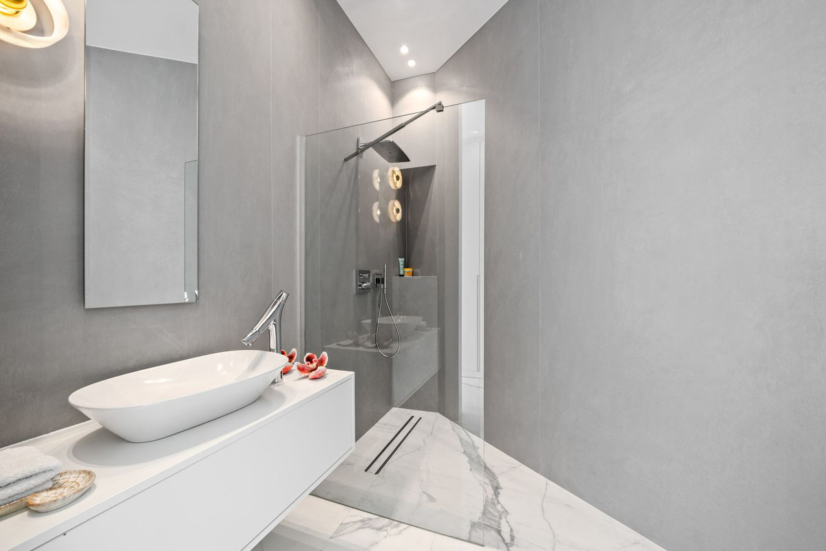 The upper level is a private night zone with three elegant bedroom suites, including an exclusive master bedroom. Each has its own ensuite bathroom finished to a premium standard – the residence features five bathrooms in total – and panoramic glazing opens the interiors to spectacular views. The views from each bedroom are an absolute highlight of the villa.