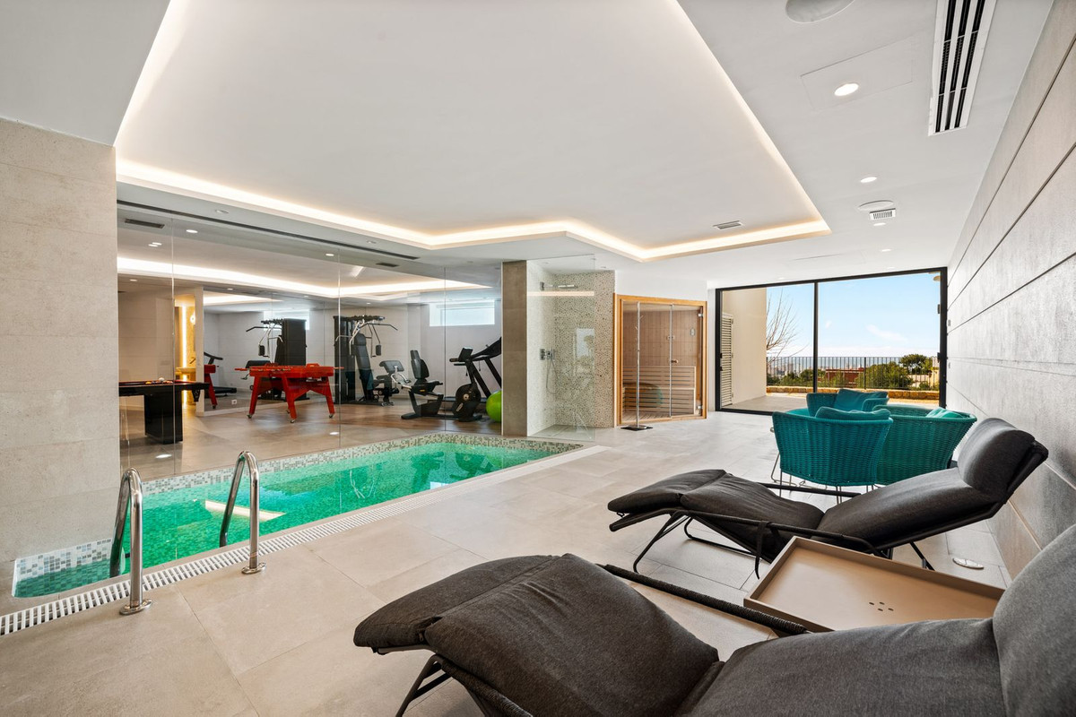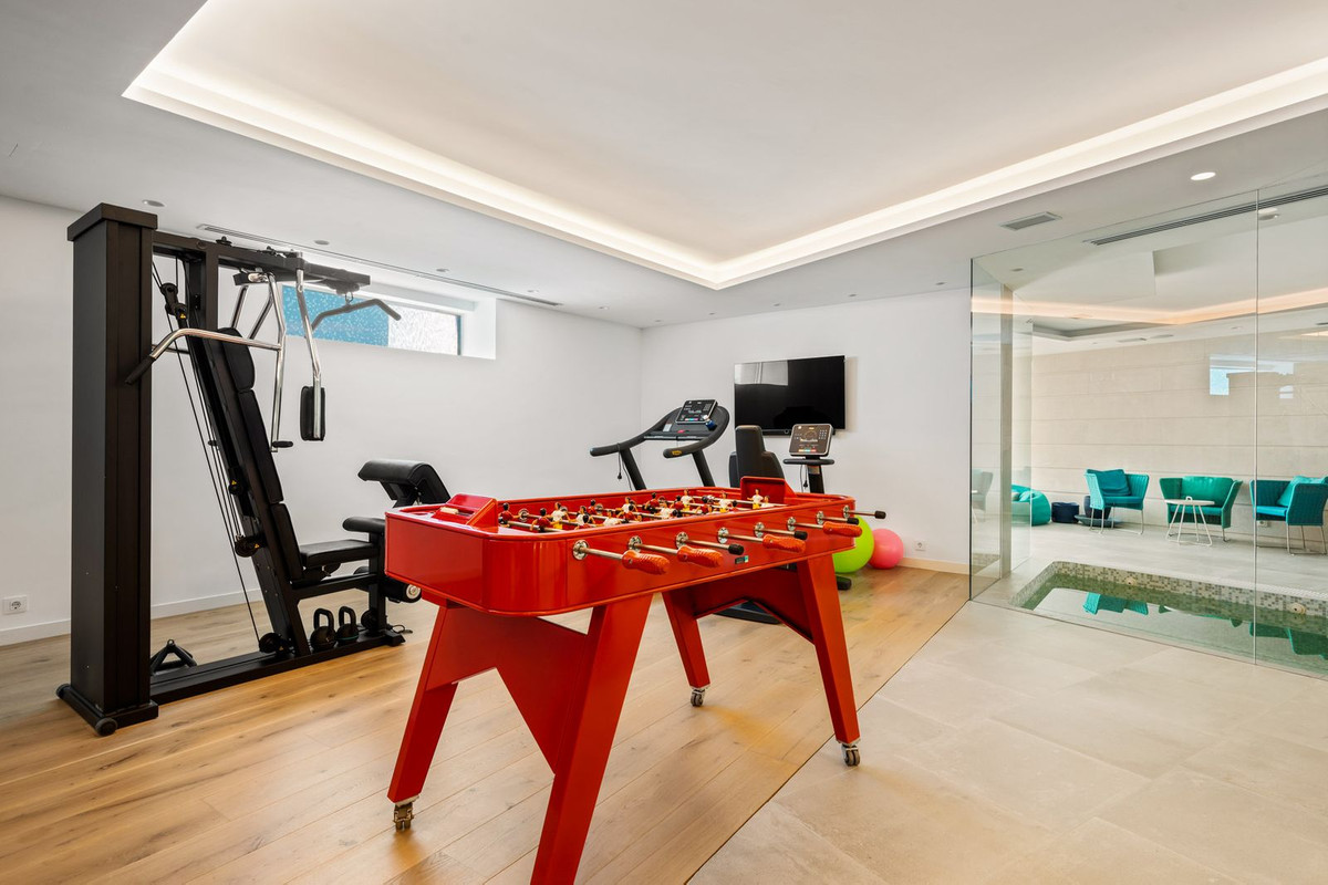 The lower level has been designed as a private wellness and entertainment area, including a fully equipped TechnoGym gymnasium, sauna, an elegant spa lounge furnished by Paola Lenti, and a recreation room with billiards, as well as technical and utility rooms.