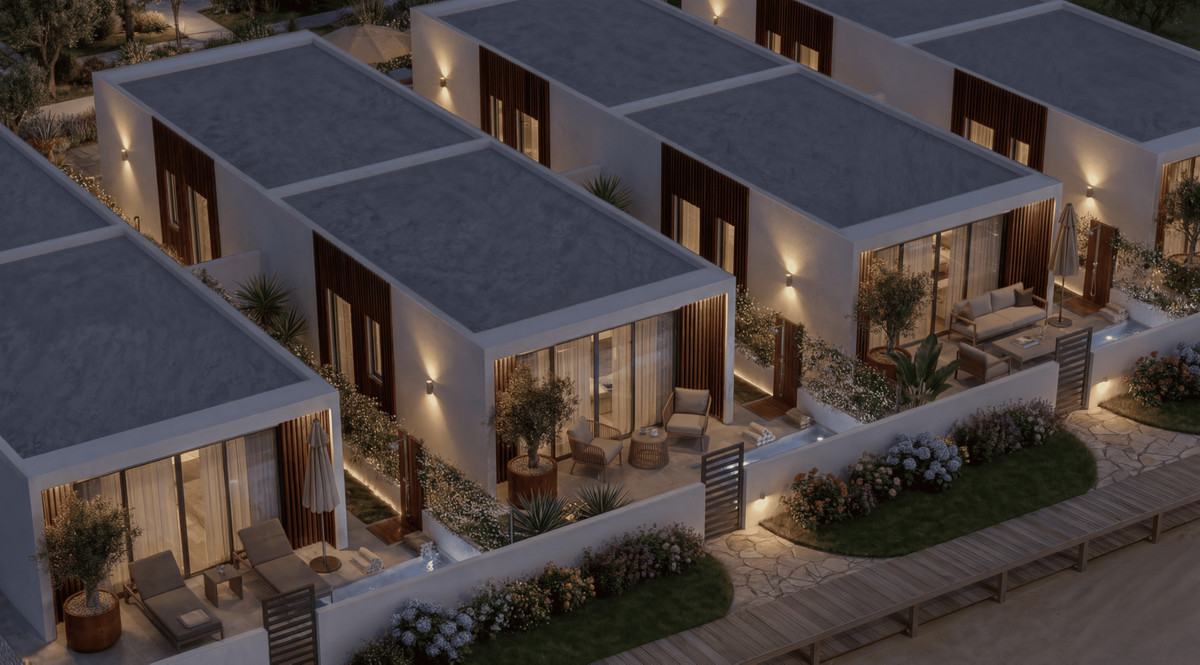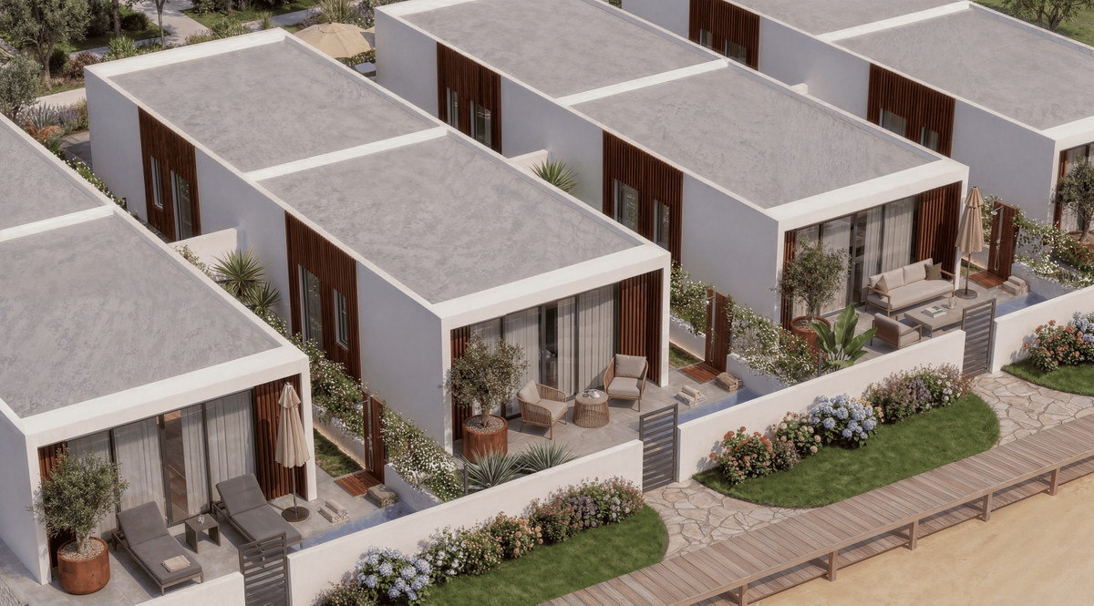 - Beach Villas: Belägna i det mest exklusiva området, i första linjen av komplexet och med utsikt över havet, har dessa bostäder en bekväm 2-sovrums layout. Som den ultimata uttrycket för exklusivitet inkluderar varje villa sin egen individuella privata pool och grillplats, vilket ger privilegiet att bo bara några steg från sanden med total oberoende och komfort.