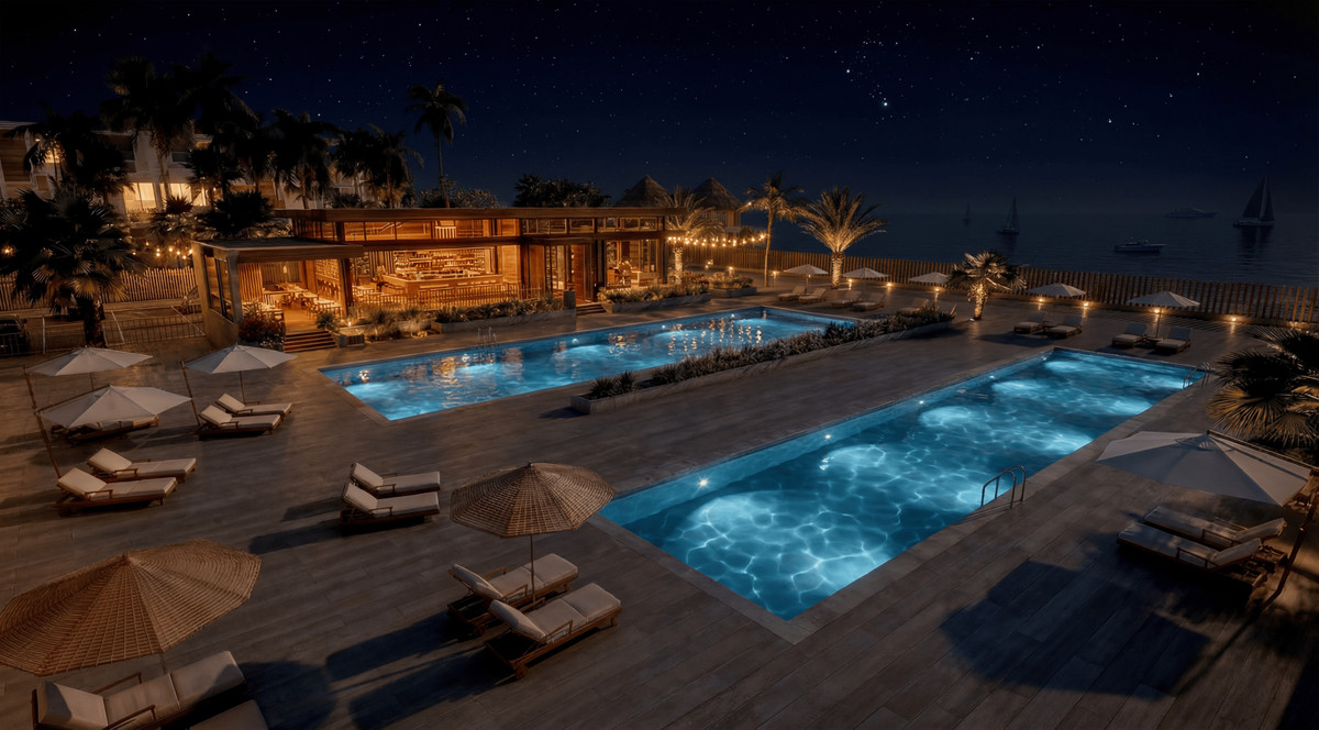 - Exklusiv Beach Club: Komplexets sociala hjärta är dess moderna och eleganta havsfrontsbyggnad. Detta utrymme integrerar en designer Beach Club med utvald gastronomi, tillsammans med faciliteter i världsklass inklusive gym, bastu, social club, business center, kids club och gaming center, och erbjuder en distingverad och funktionell atmosfär med utsikt över Medelhavet.