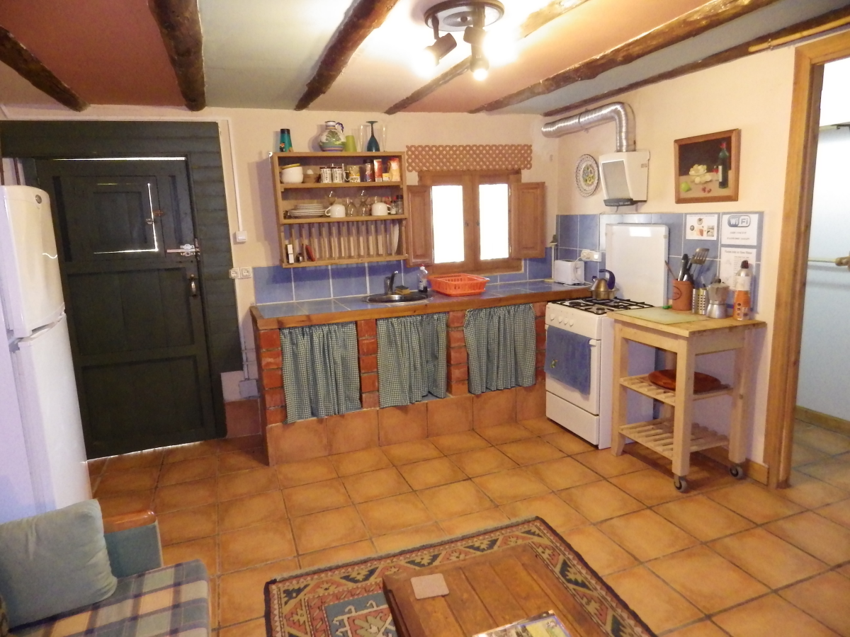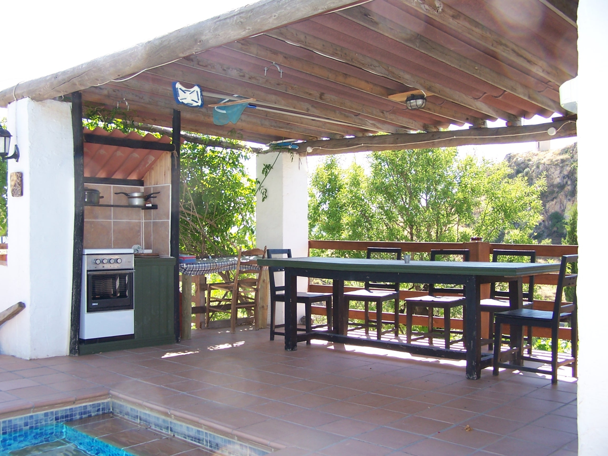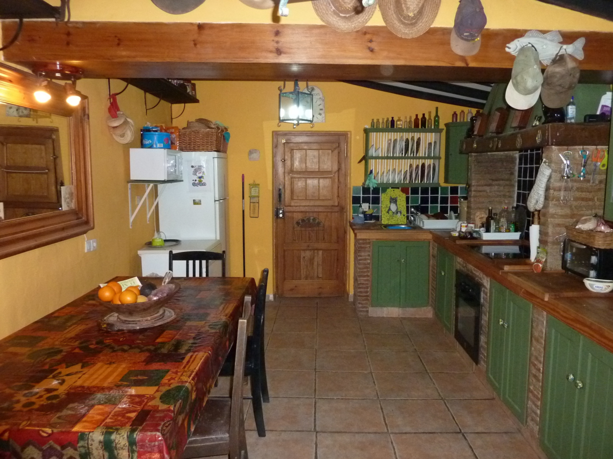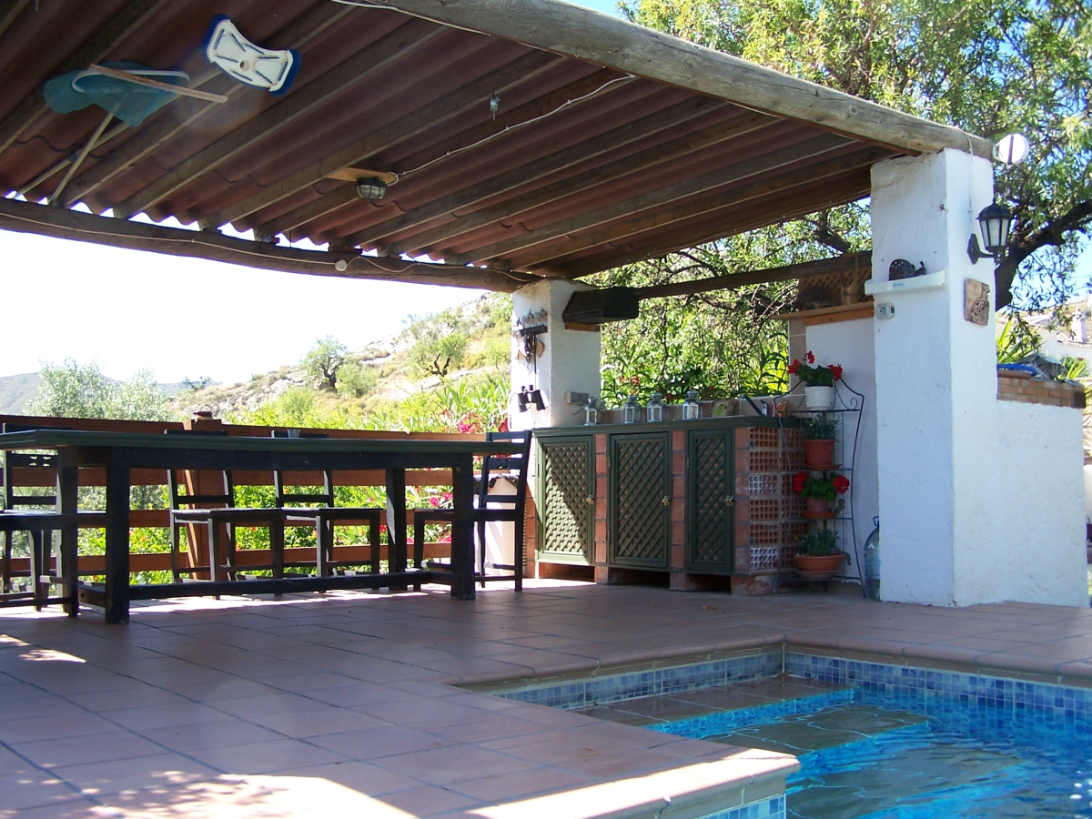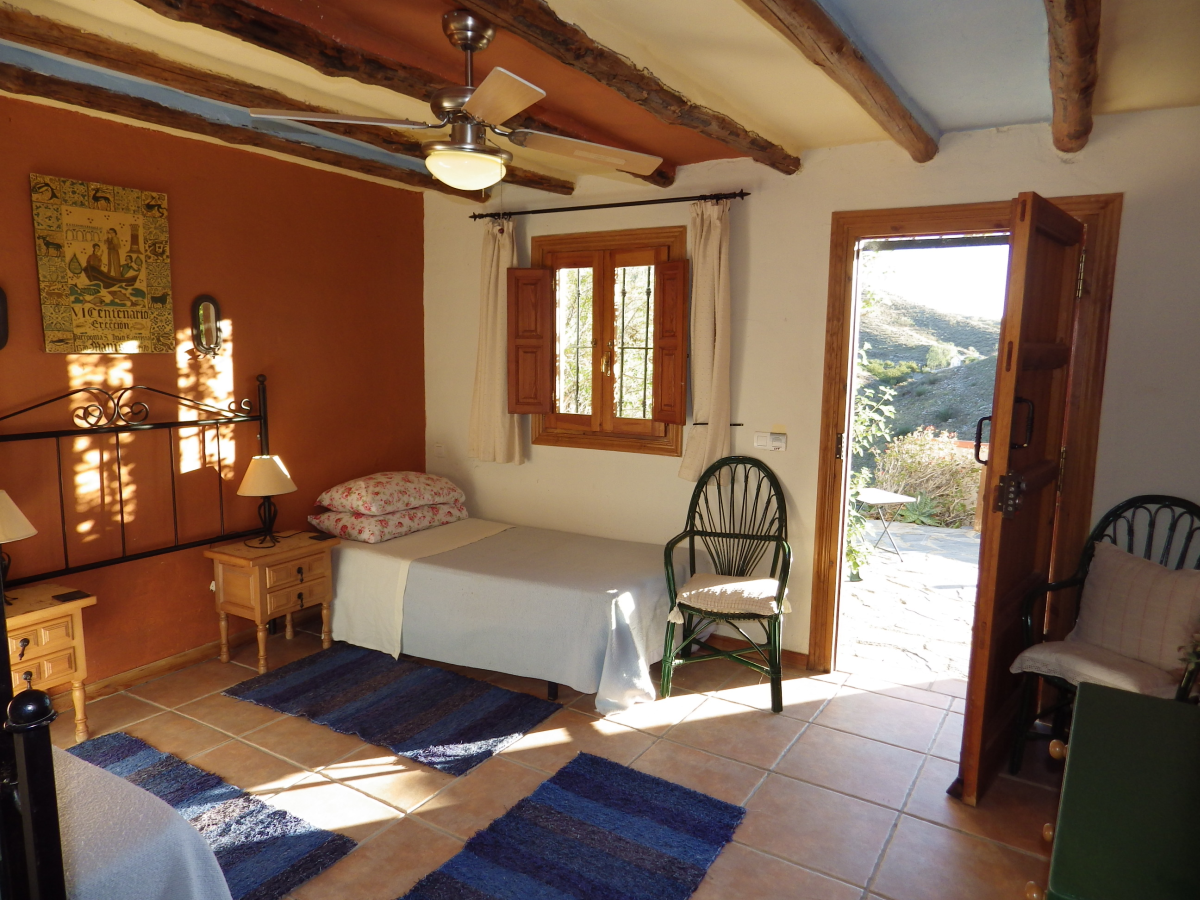 From inside the main entrance is a paved approach to the upper ground floor of the Cortijo with a plunge pool, converted from the original embalsa ( water reservoir) and an integrated pergola with facilities for “al fresco” dining with the heat of the summer sun cooled by the prevailing sea breeze ( the Levante). On a clear day the view to the east includes the Mediterranean, some 12 miles away as the crow flies. The upper floor of the Cortijo has been converted to a 2 bedroom apartment, with en suite bathroom and shower room, farmhouse kitchen and large sitting room.