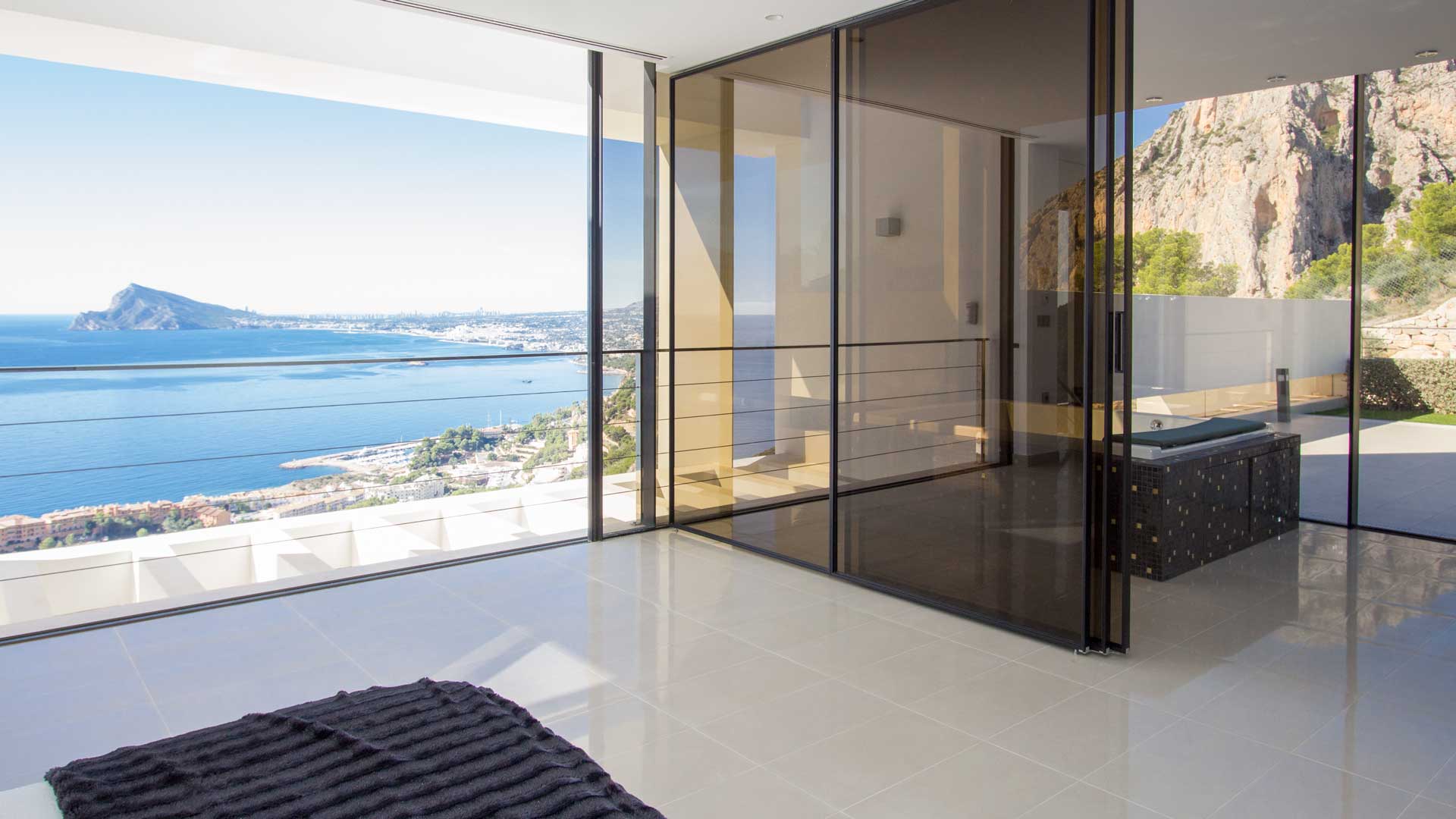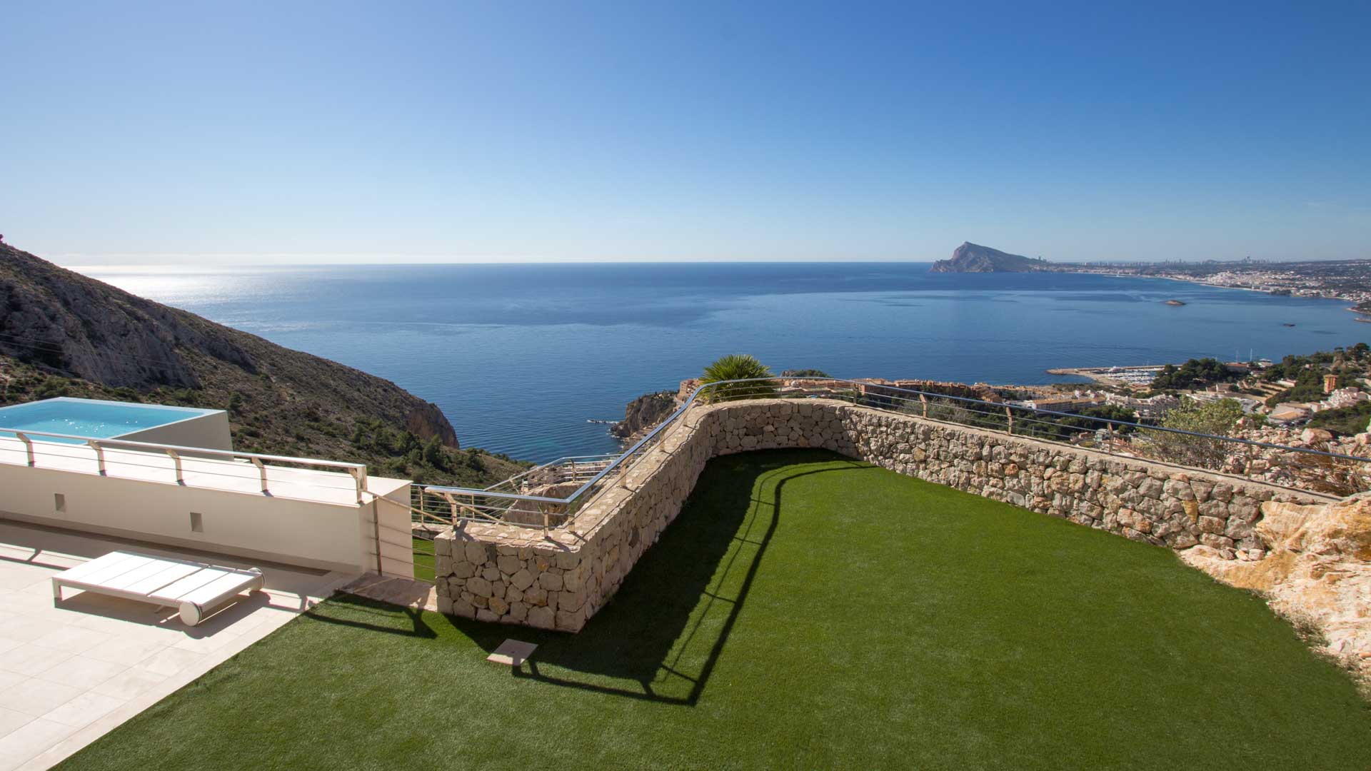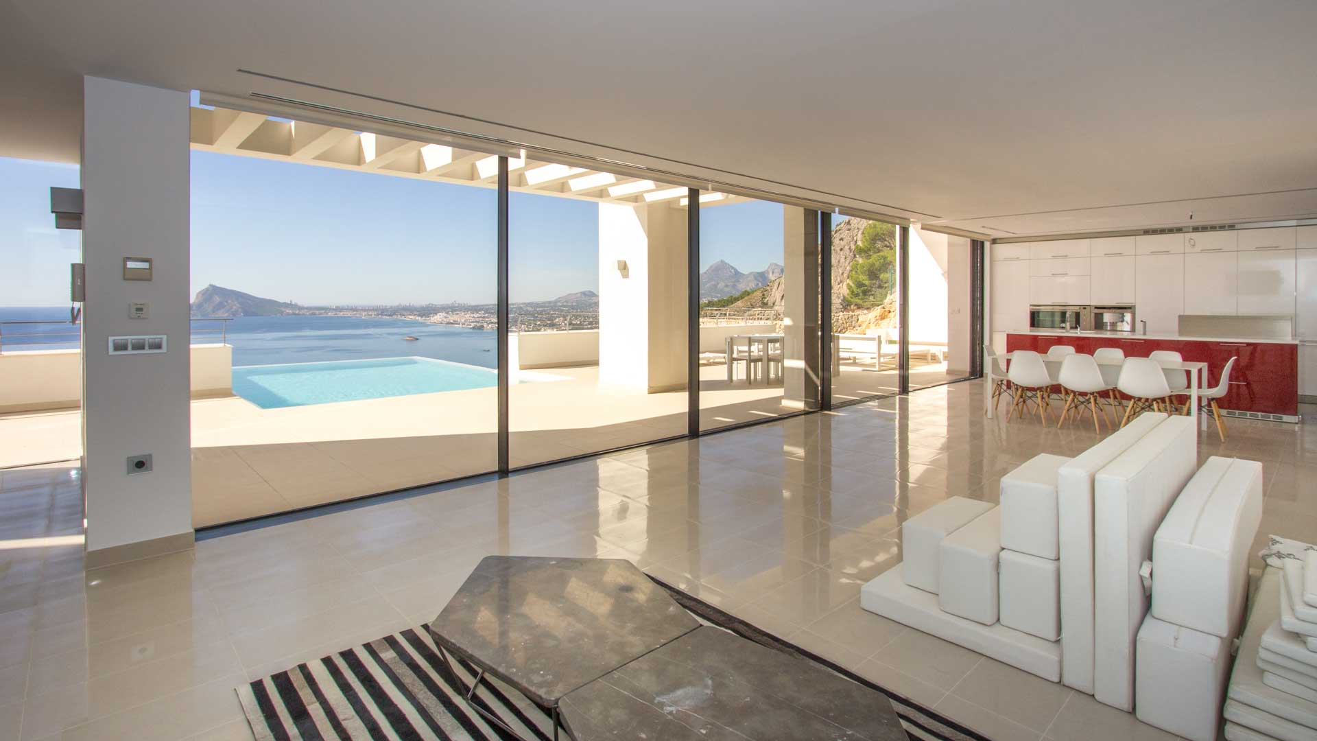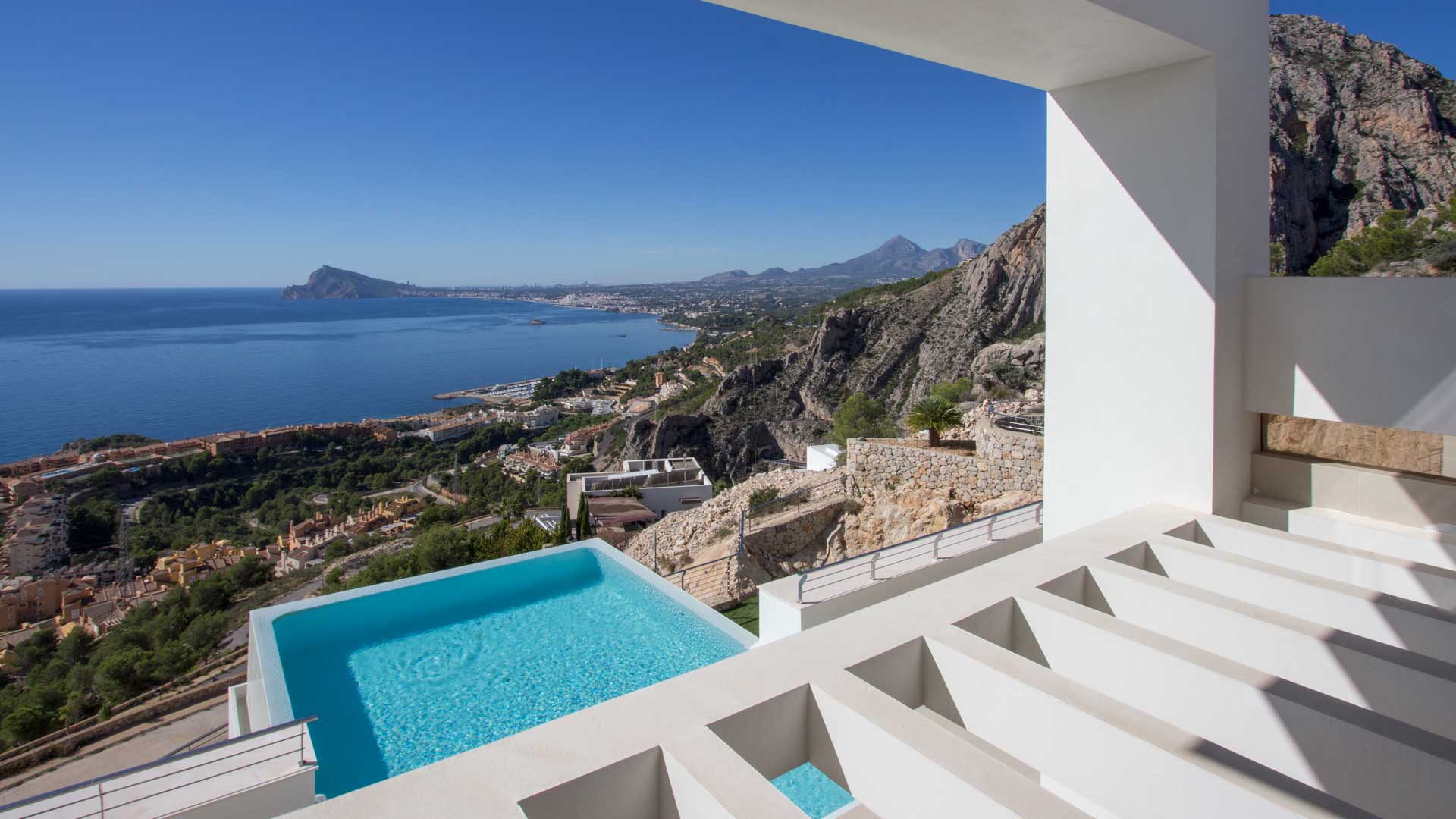 This spectacular villa stands on a higher location above and a spectacular natural landscape. Built in a modern architectural style with straight and slick lines, from this privileged position, it offers an unrivaled, south-facing panoramic view of the bay of Altea with the Mediterranean Sea in the background.