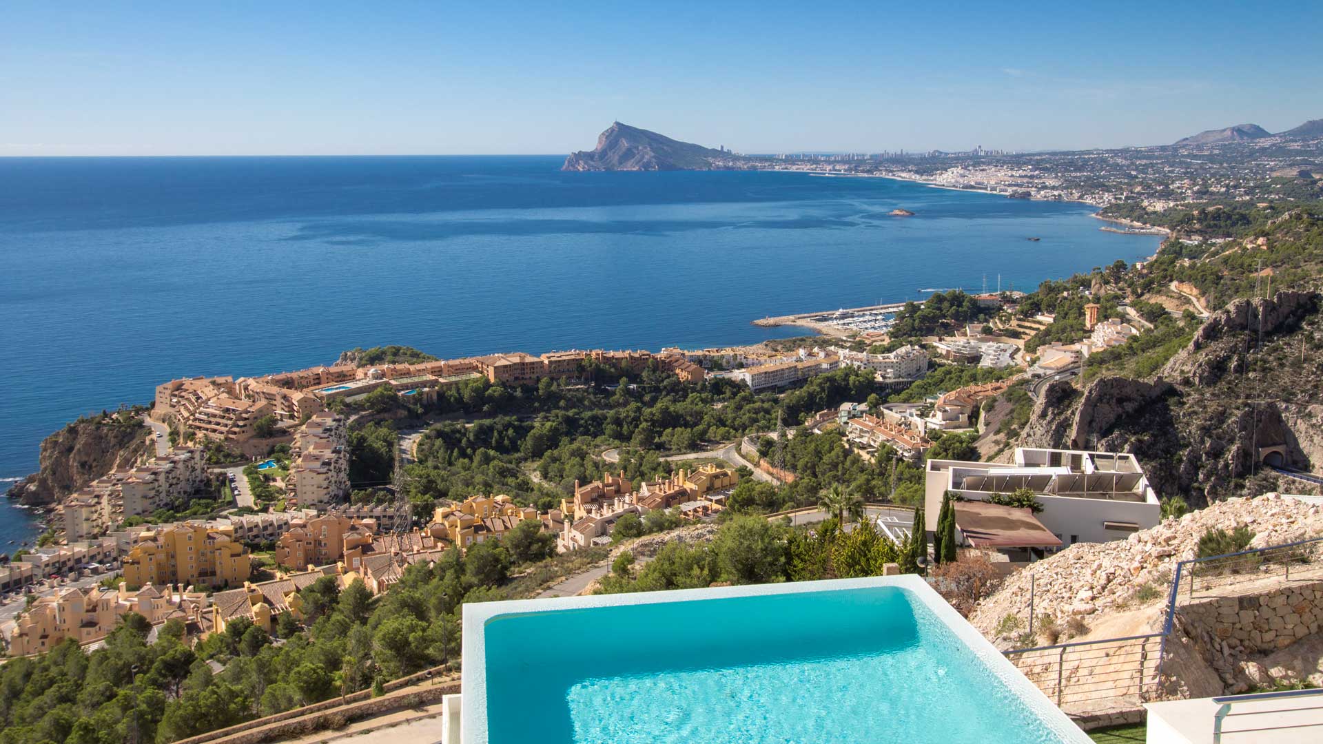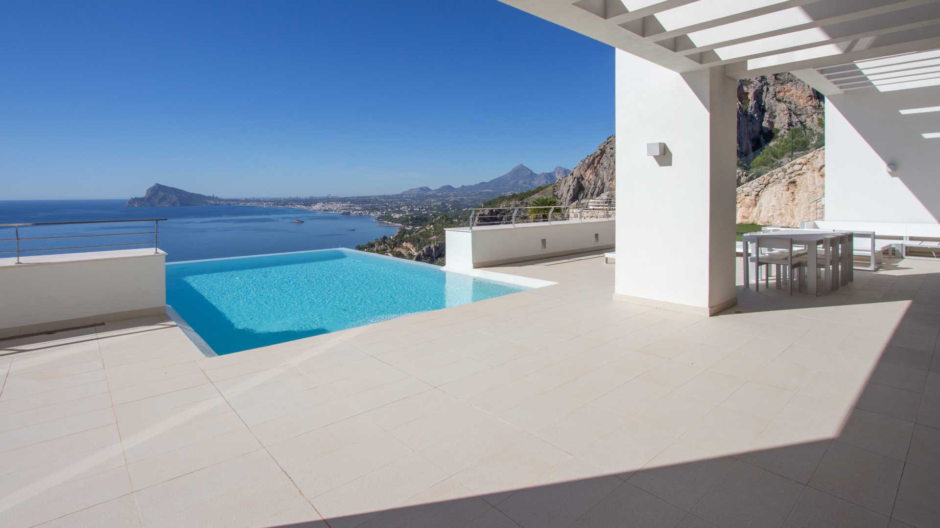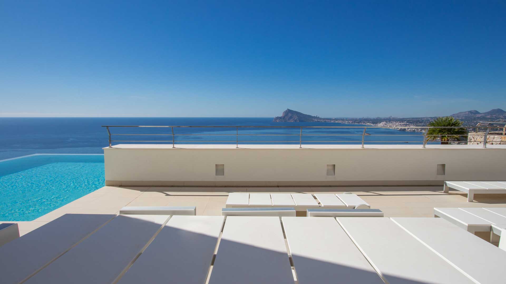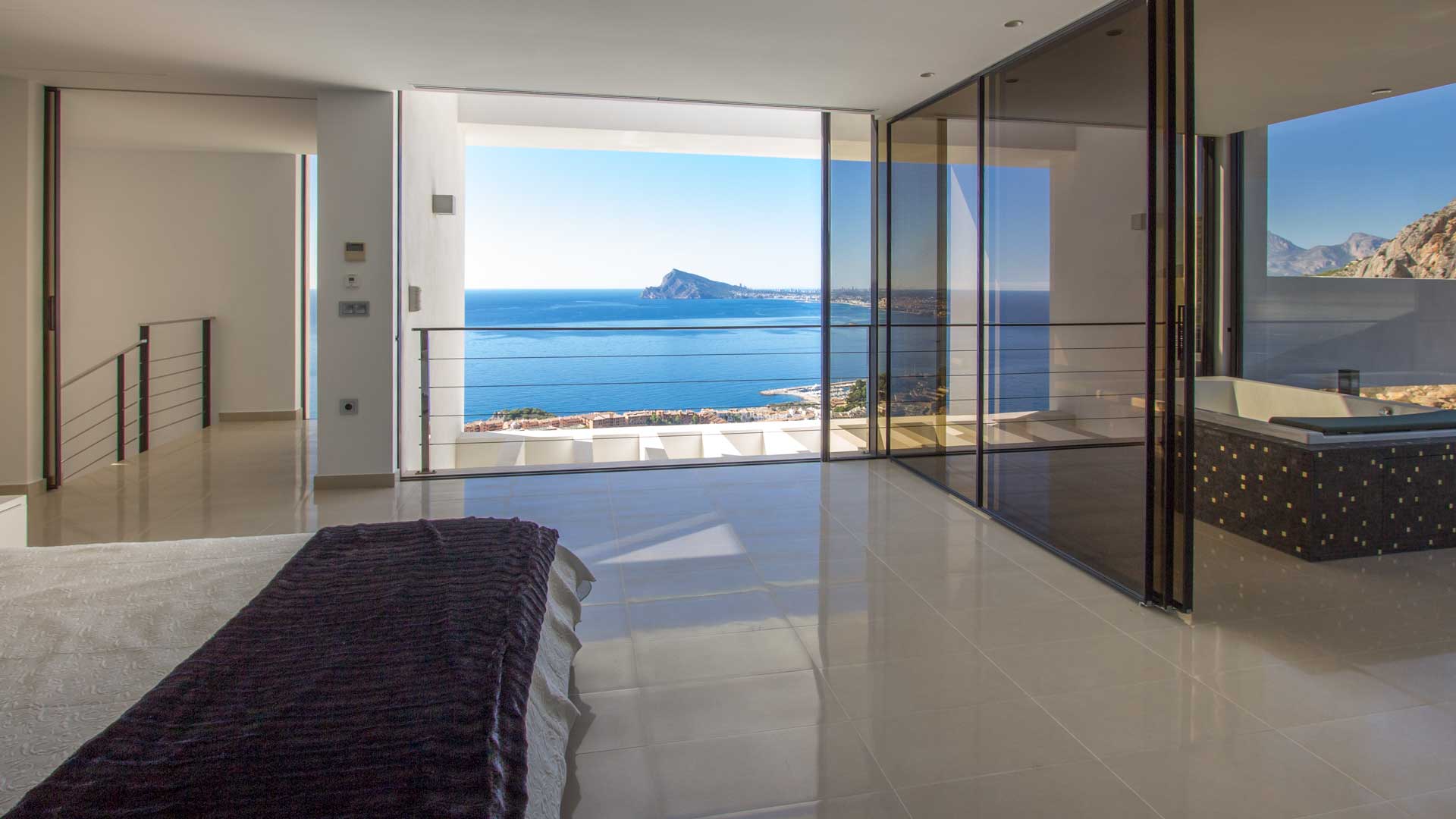 This spectacular villa stands on a higher location above and a spectacular natural landscape. Built in a modern architectural style with straight and slick lines, from this privileged position, it offers an unrivaled, south-facing panoramic view of the bay of Altea with the Mediterranean Sea in the background.
