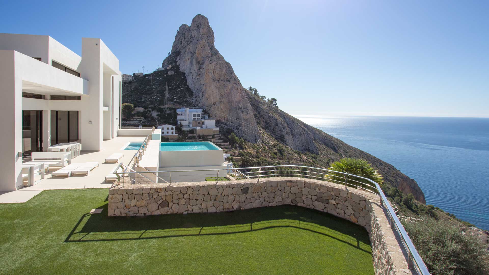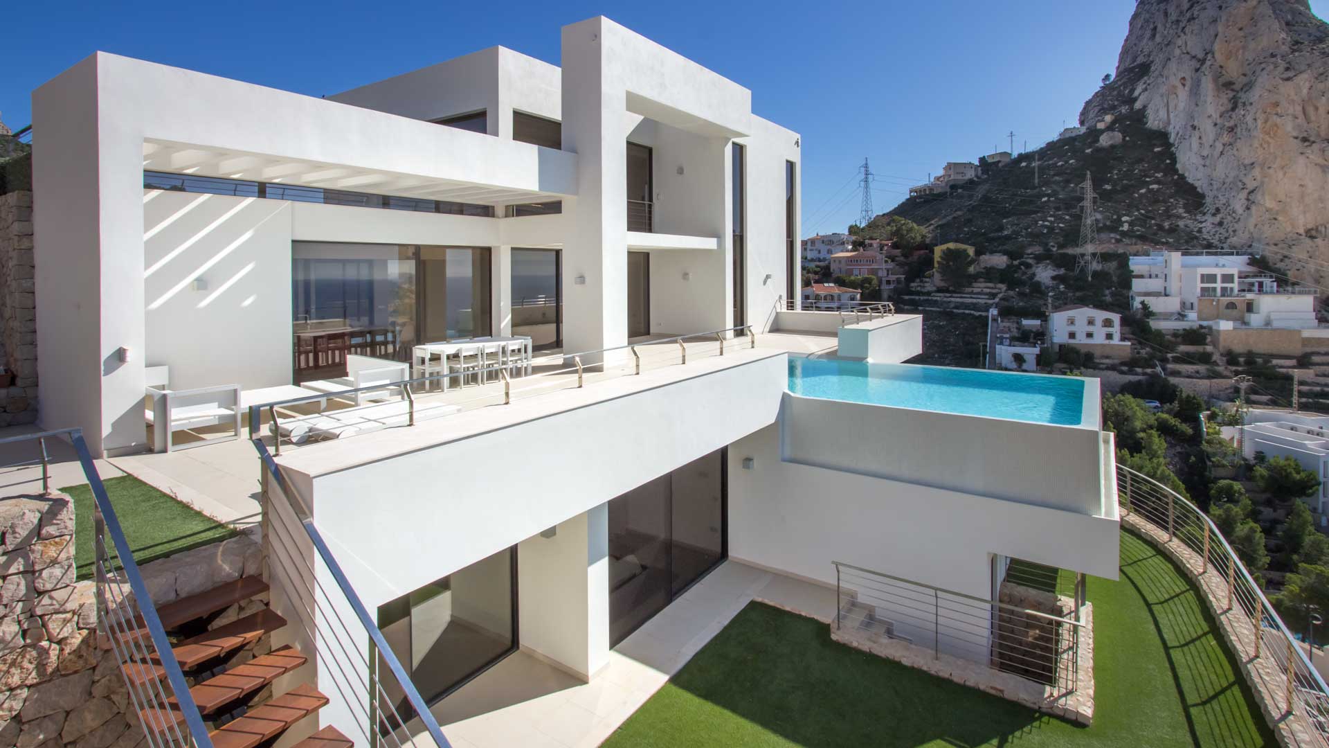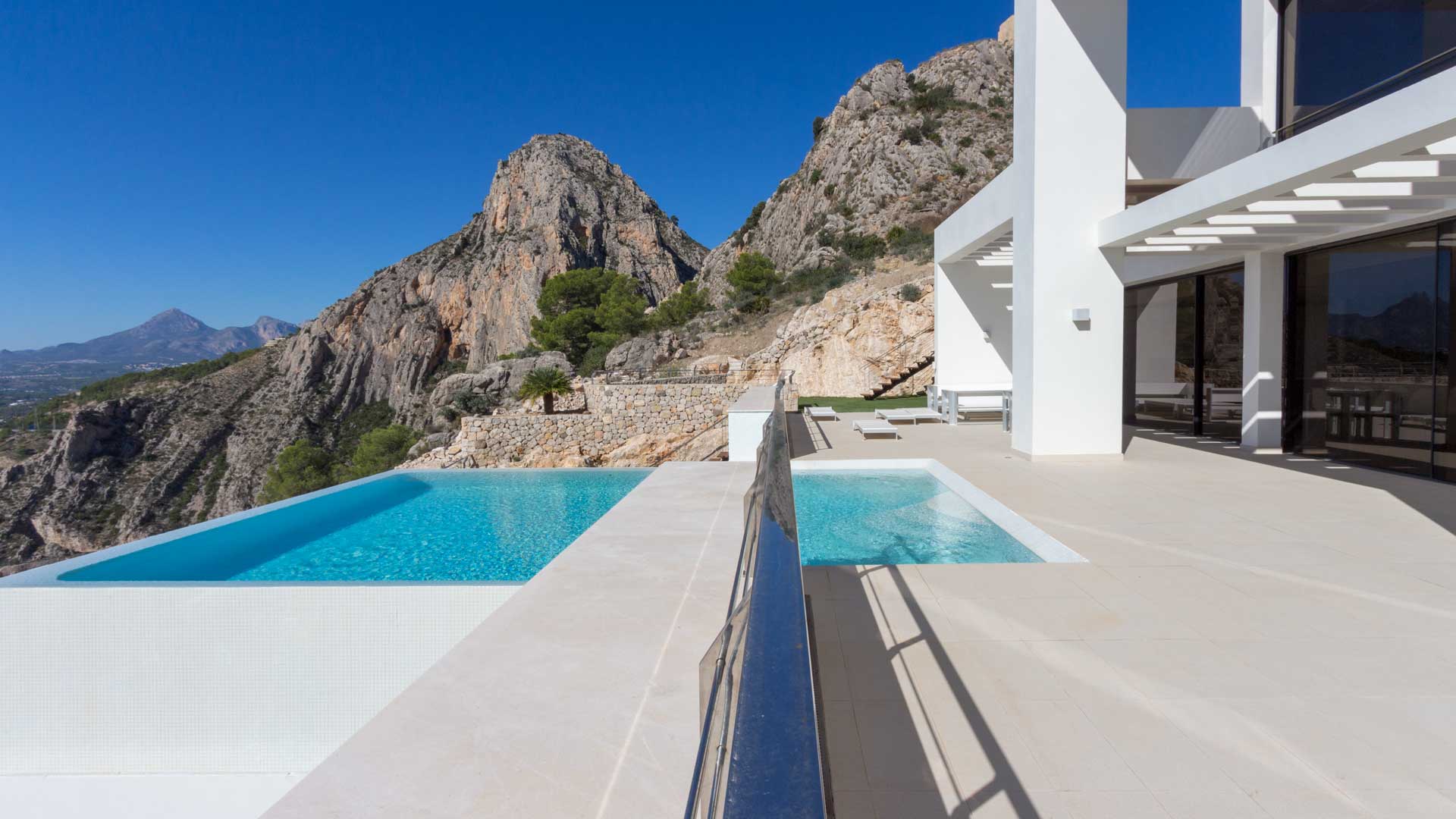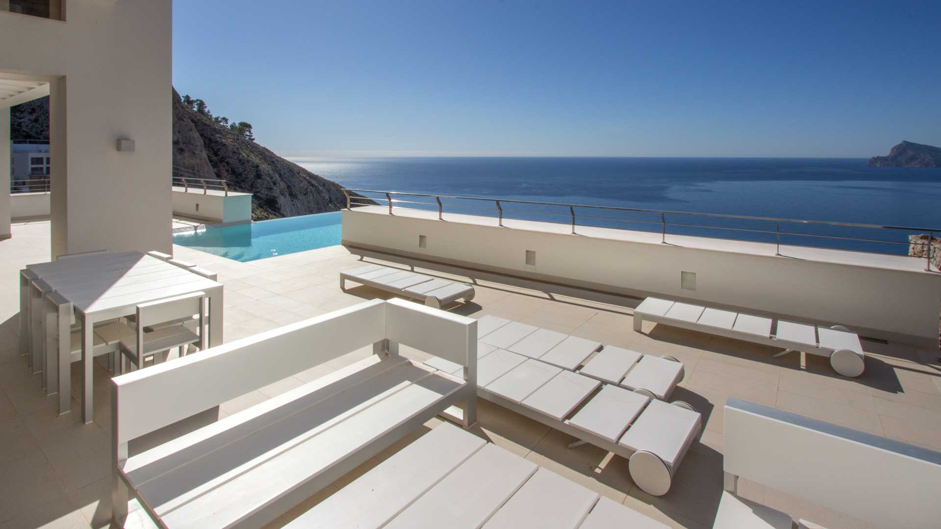 This spectacular villa stands on a higher location above and a spectacular natural landscape. Built in a modern architectural style with straight and slick lines, from this privileged position, it offers an unrivaled, south-facing panoramic view of the bay of Altea with the Mediterranean Sea in the background.