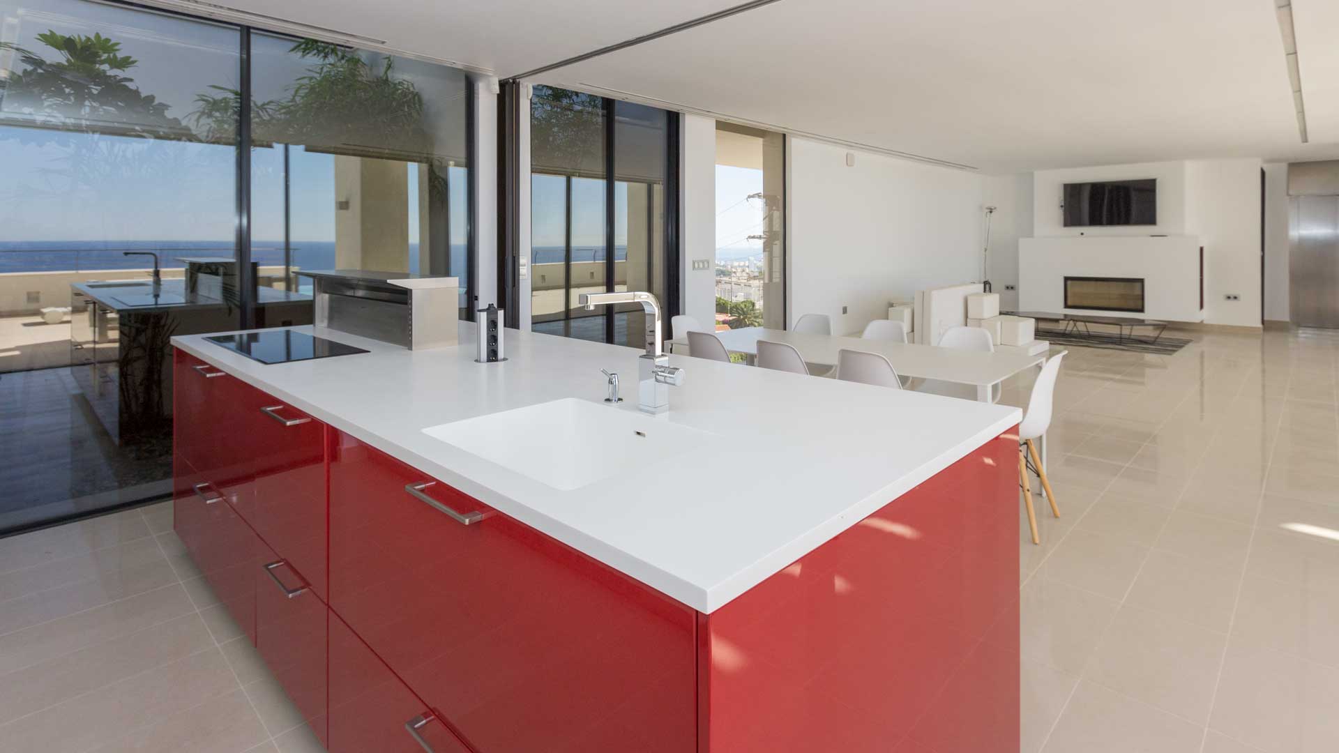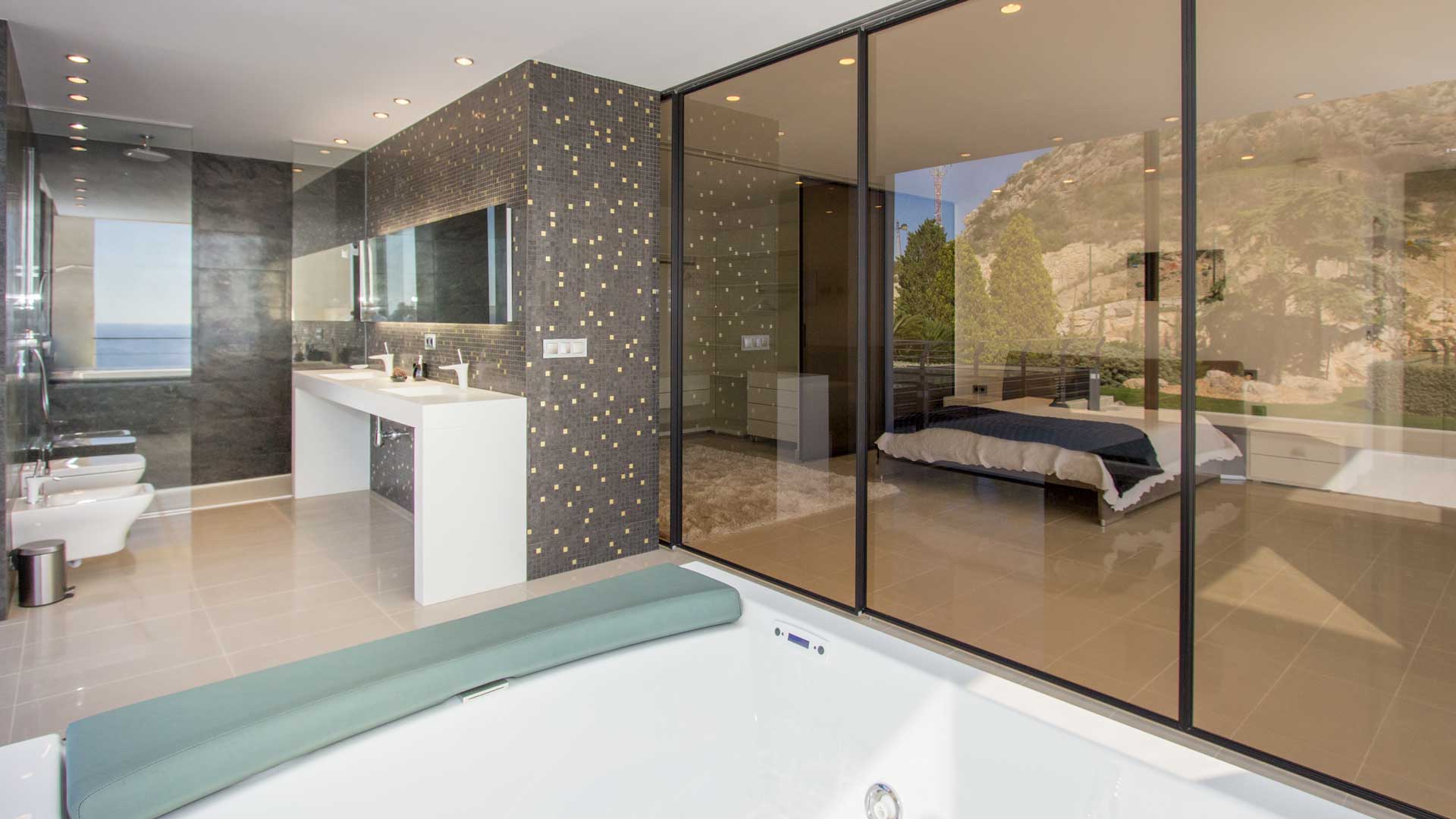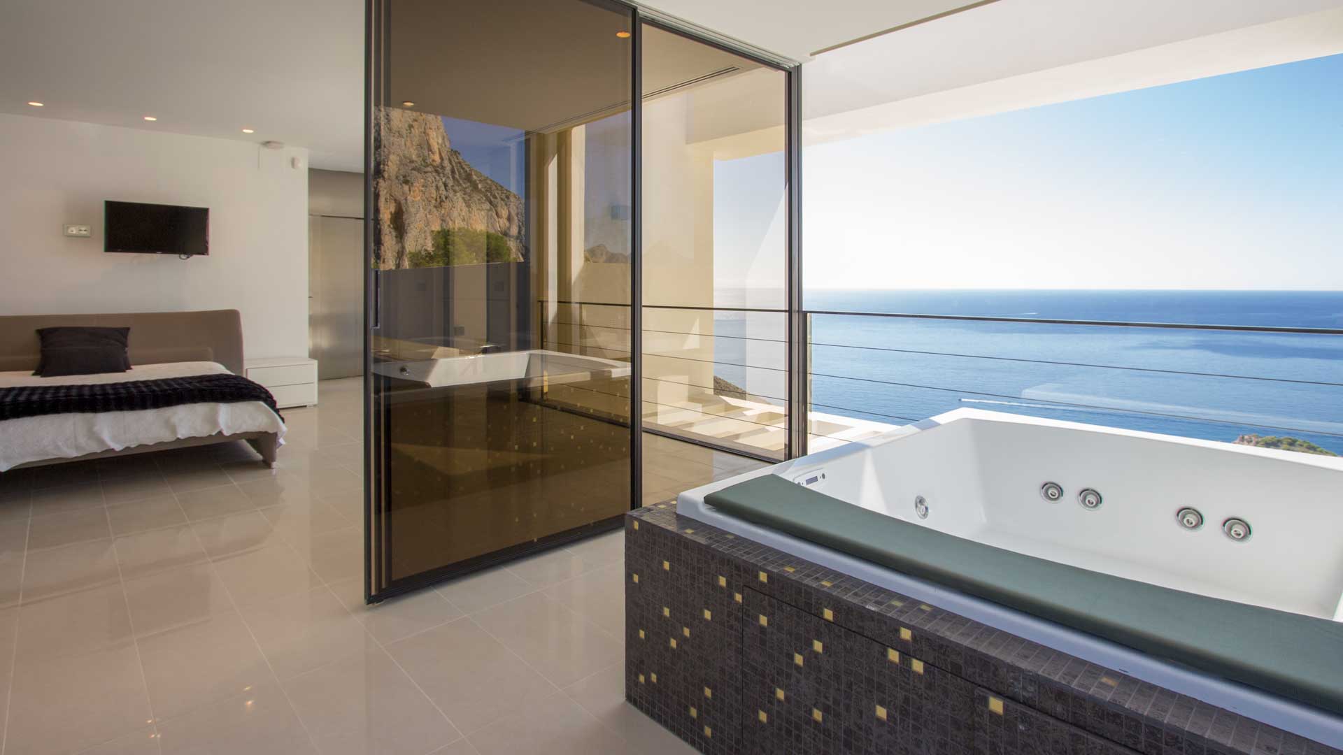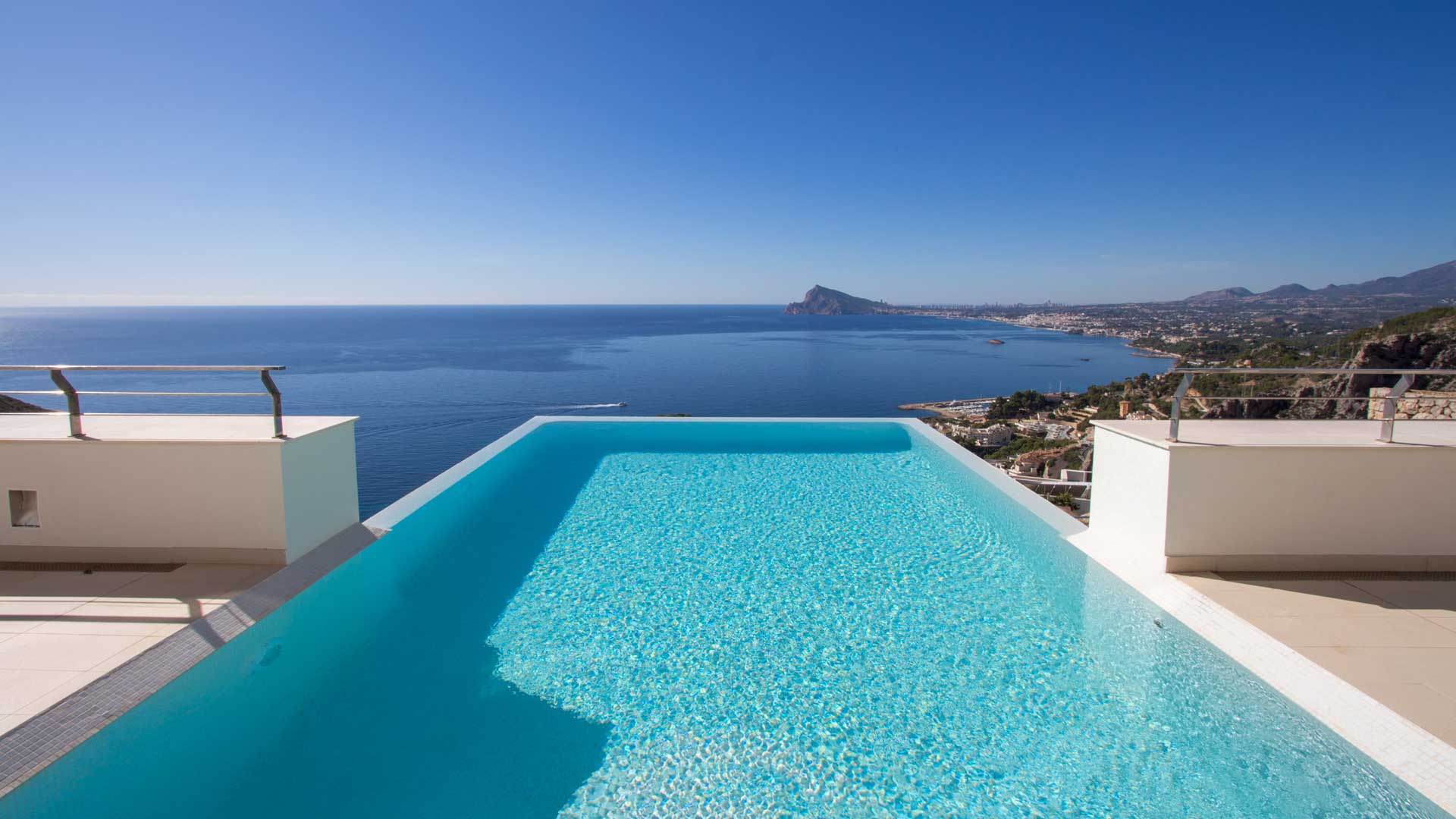This spectacular villa stands on a higher location above and a spectacular natural landscape. Built in a modern architectural style with straight and slick lines, from this privileged position, it offers an unrivaled, south-facing panoramic view of the bay of Altea with the Mediterranean Sea in the background.