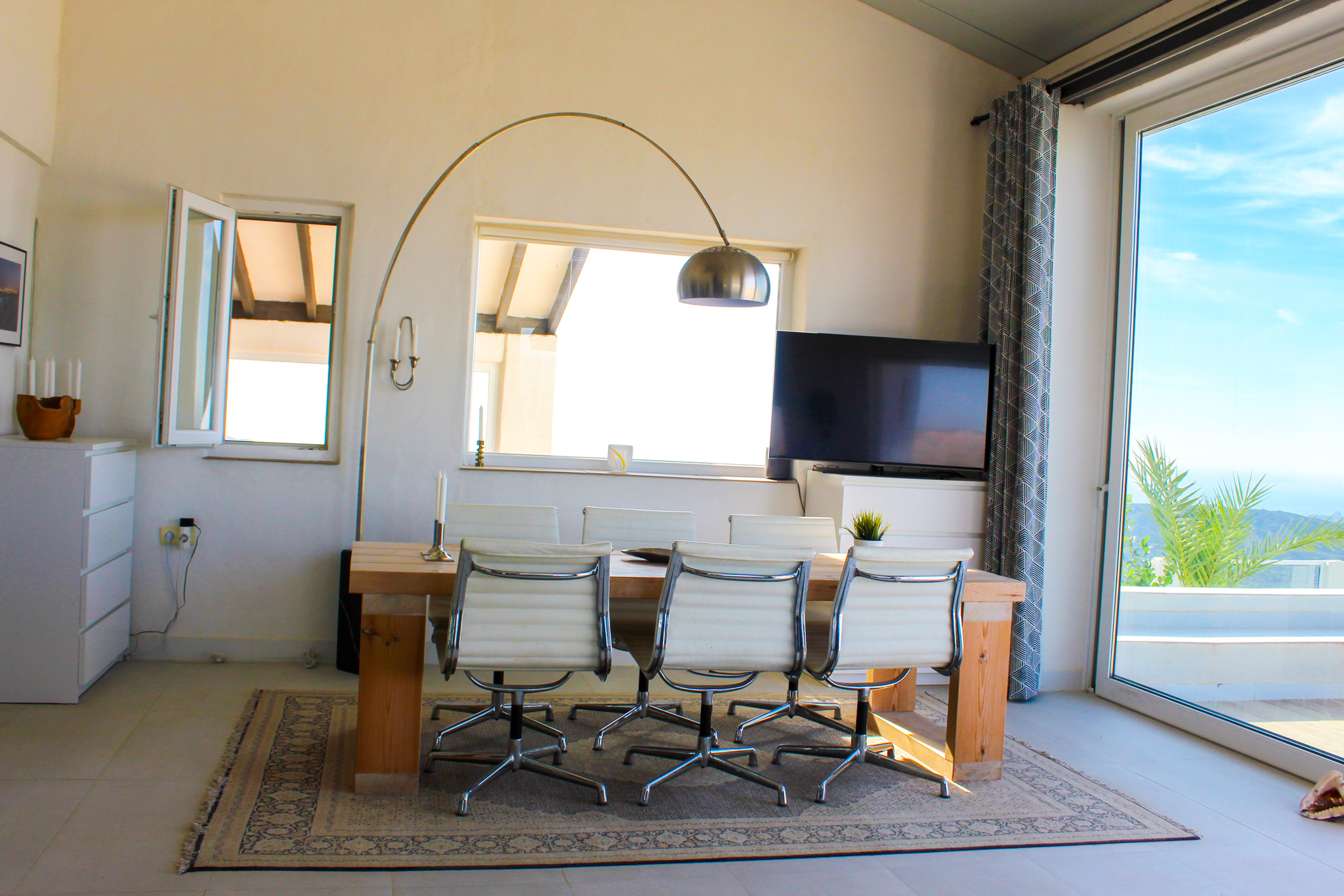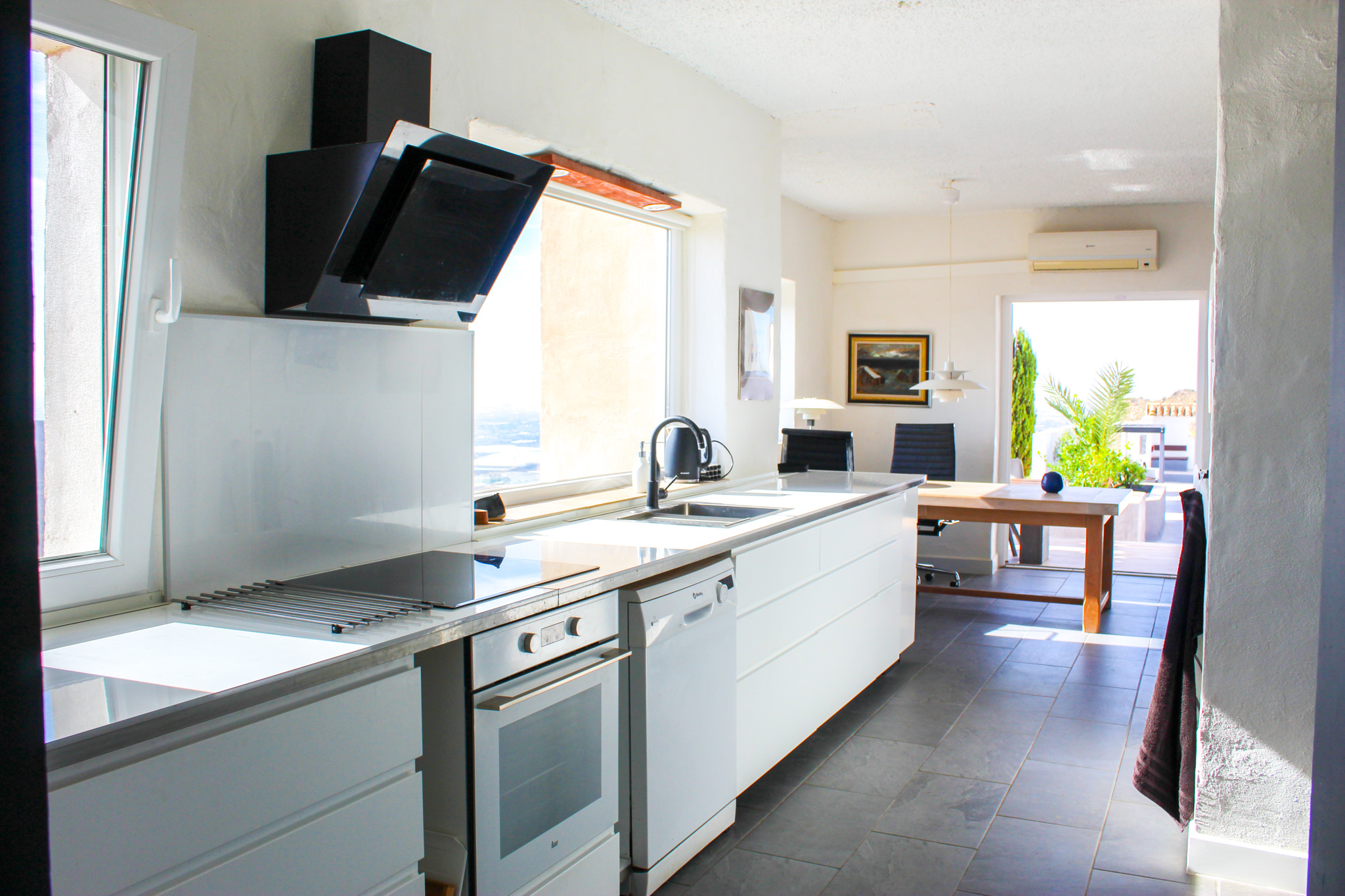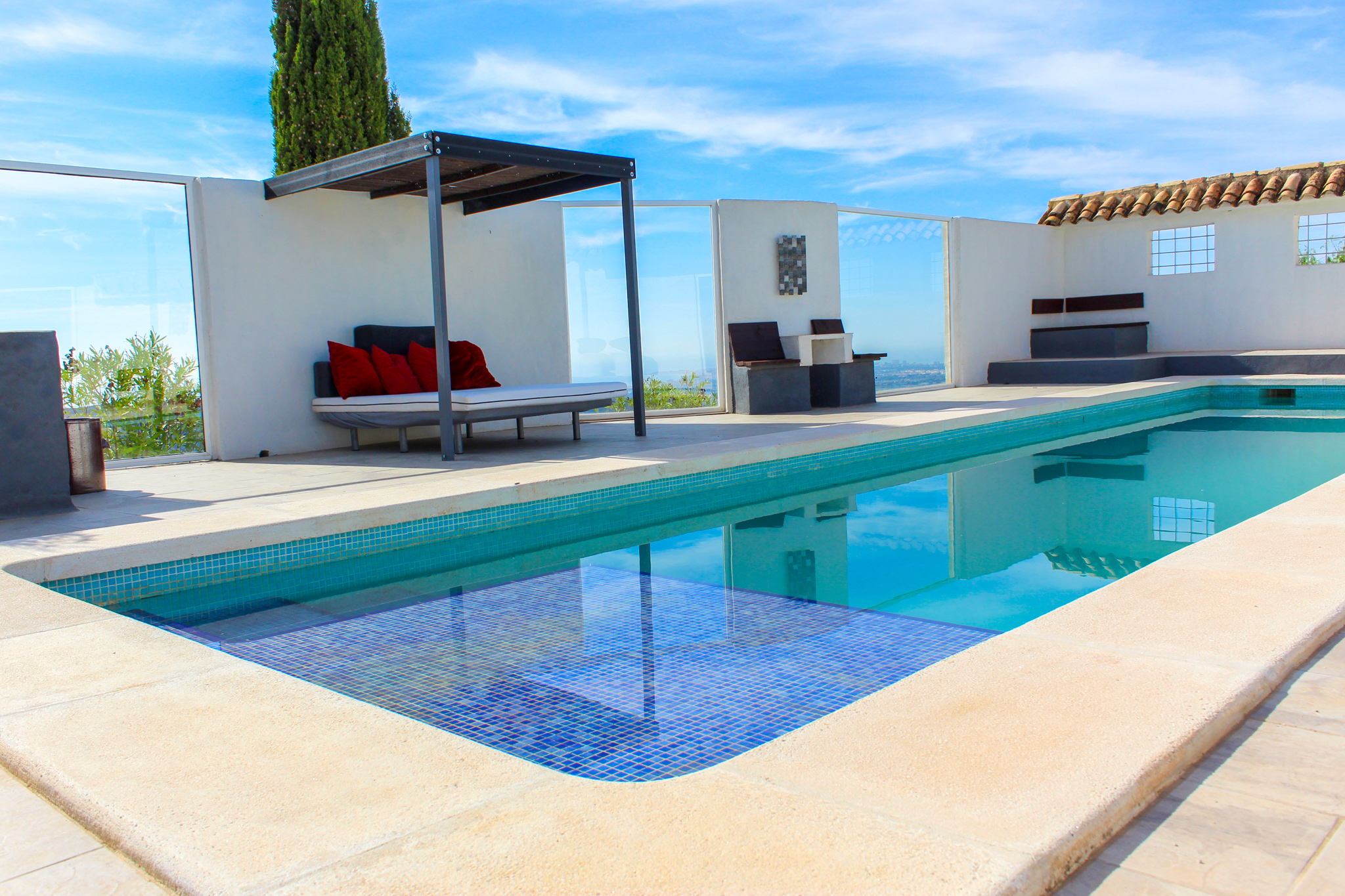 The current owners have completely renovated the villa with quality materials and in a way that preserves the charming details from the villa's origins combined with the Scandinavian style, including large windows, which provide a good light throughout the home. The glass sections that break the wall around the pool area also provide an openness with a view of the sea, mountains and the village while still being sheltered from the wind and having privacy on the terrace.