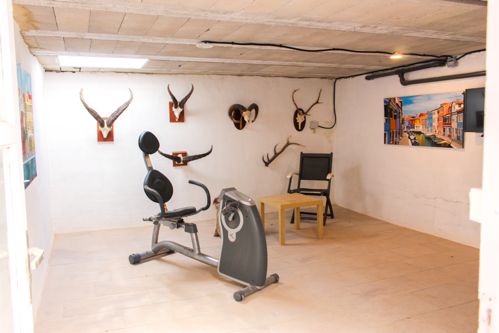 From the home's main entrance, you enter a large, bright entrance hall with entrance to the guest bathroom and entrance to a studio which can also be used as a bedroom. From the entrance there is also access to the kitchen, dining room and living room. From the large, bright kitchen there is also access to the utility room and a large, covered terrace. The dining room with open connection to the house's cozy living room, is super bright thanks to the large window with sliding doors, which leads out to another large terrace with access to the pool area. From the entrance hall and the living room you have access to the lower floor of the house, which consists of 3 spacious rooms, 2 of which have a bathroom en-suite. There is also a basement with a large storage room, workshop and leisure room. From the basement there is also access to the 5th room, which has its own entrance from the driveway.