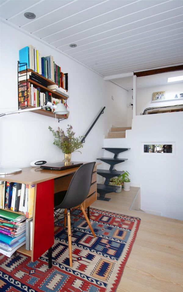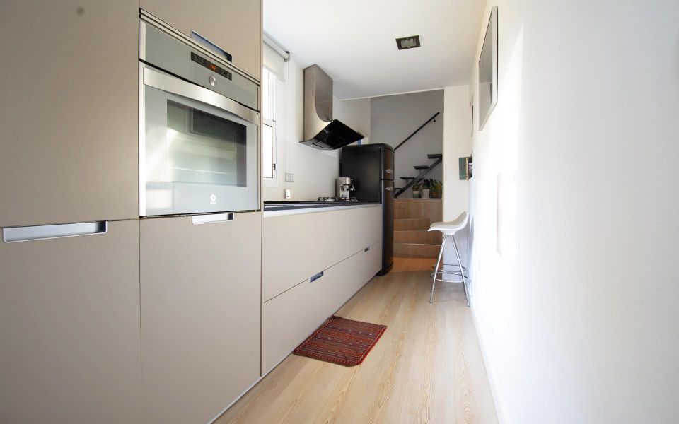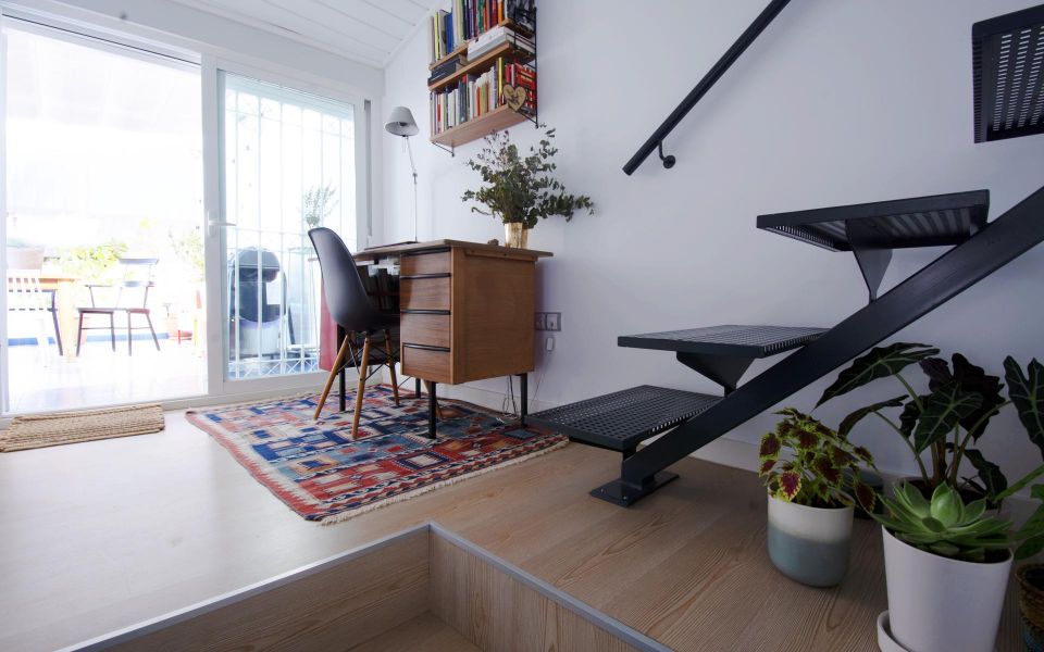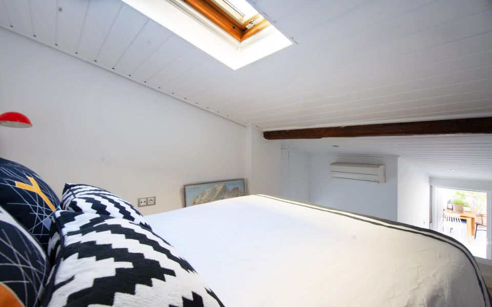 The flat is distributed in a living room with high and sloping ceilings, a modern kitchen, a full bathroom with a shower, a single bedroom with built-in wardrobes, stairs leading to the office area, exit to the spectacular 35 m² terrace, and stairs leading to the master bedroom with a skylight in the sloping ceiling.