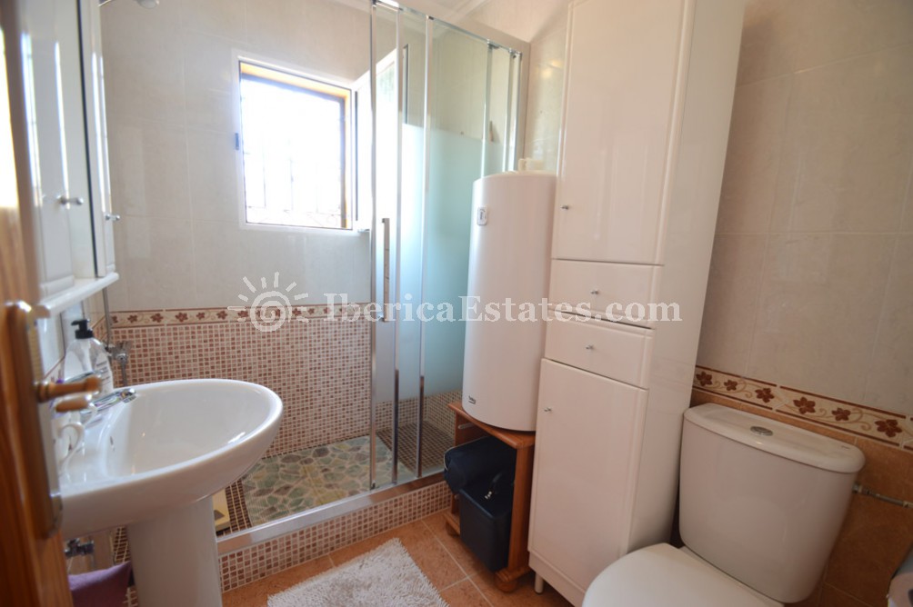 This beautiful Spanish home features 3 bedrooms, one of them on ground floor level. There is also a guest toilet on ground floor level with a small shower. The other two bedrooms are located on the first floor next to a complete bathroom with walk-in shower.