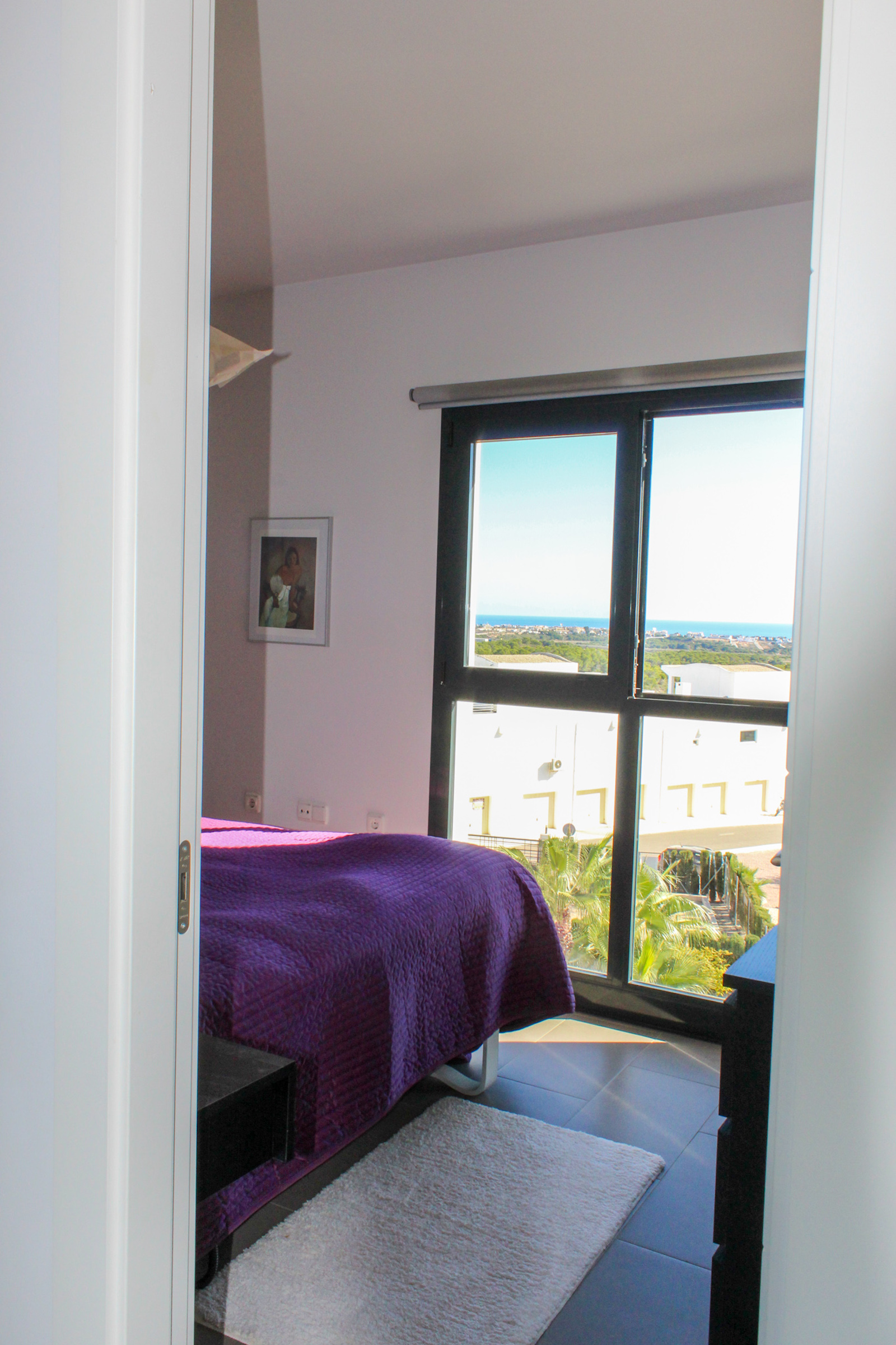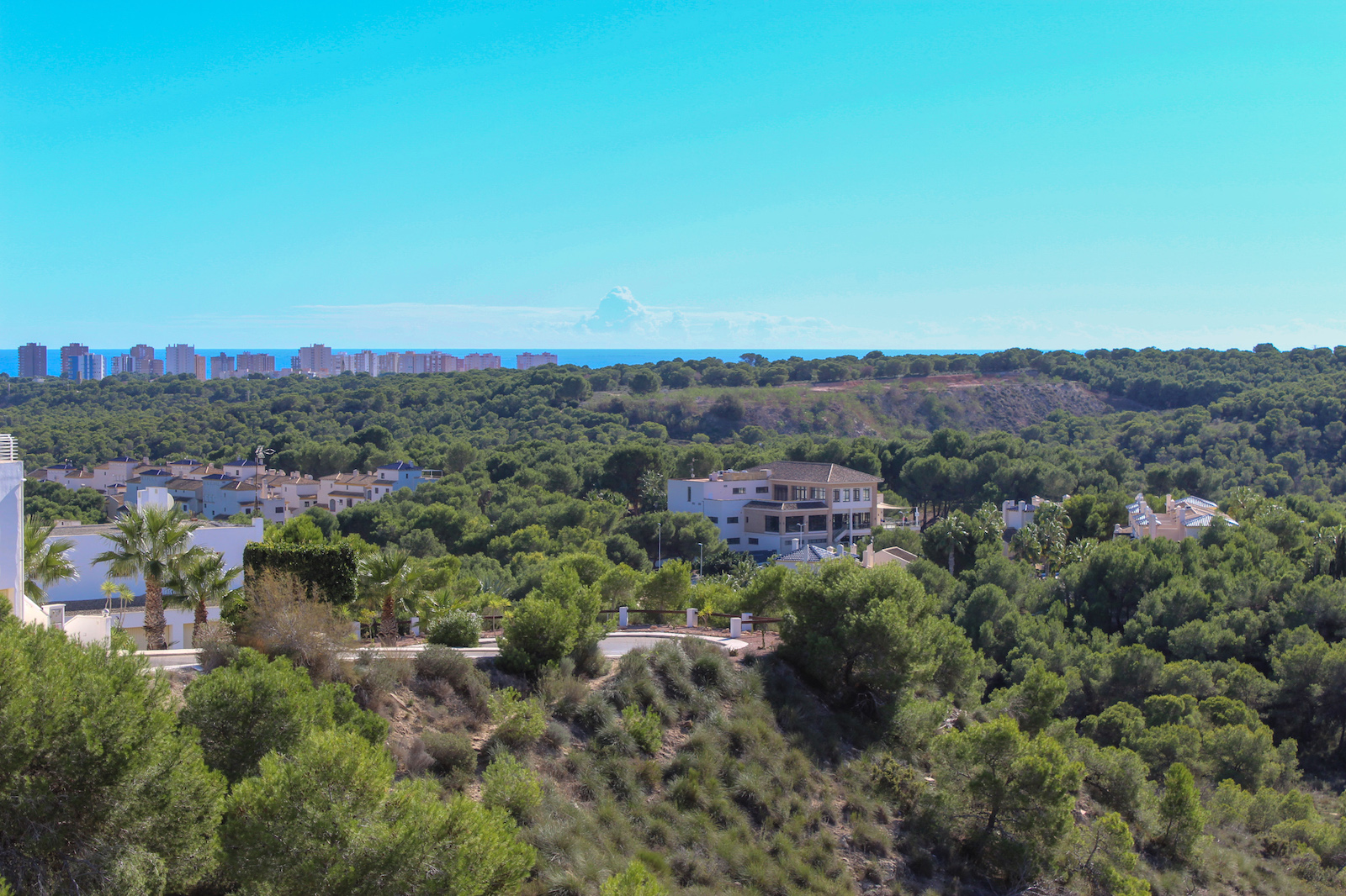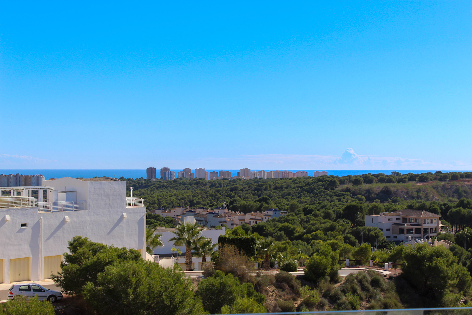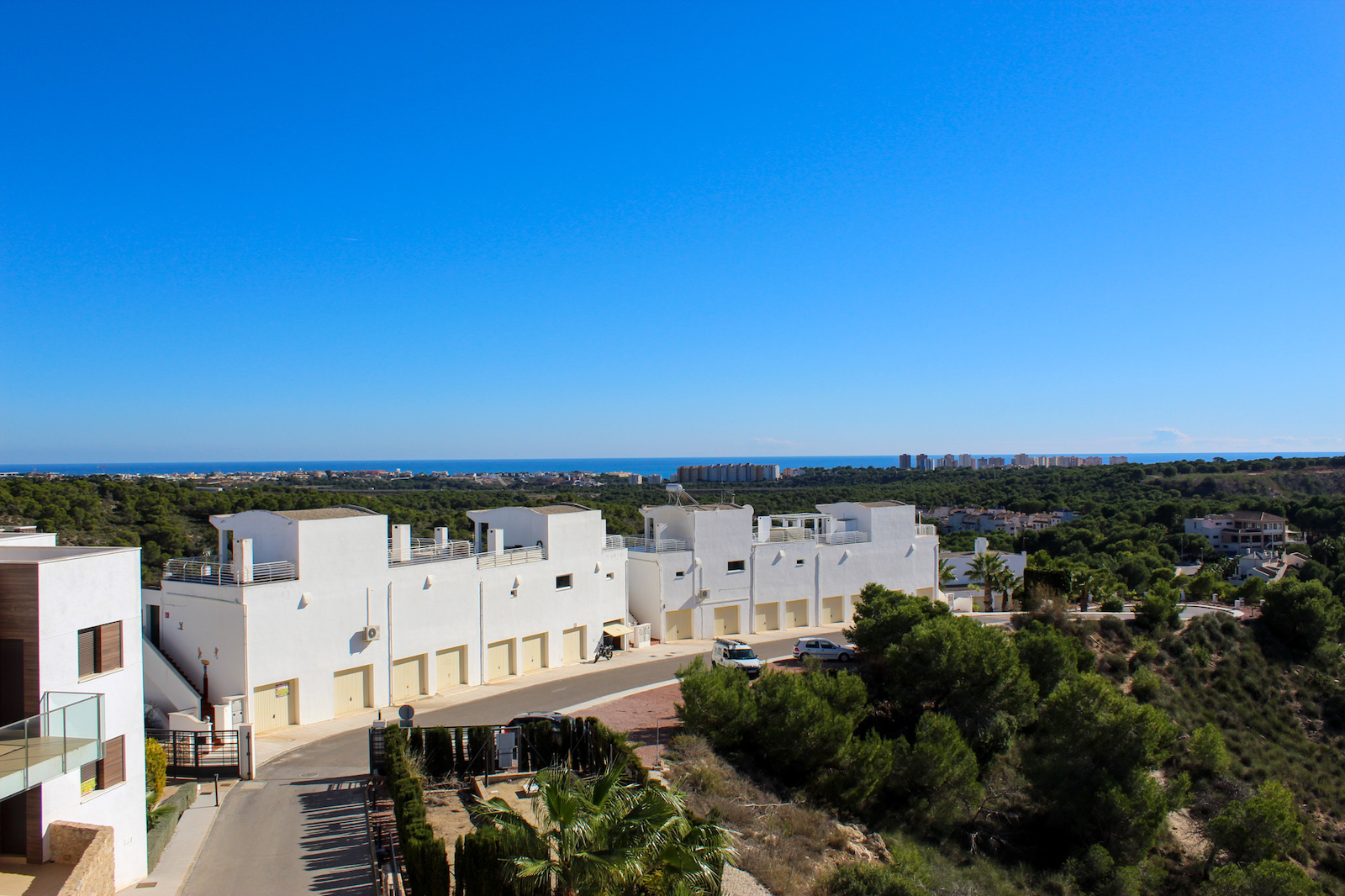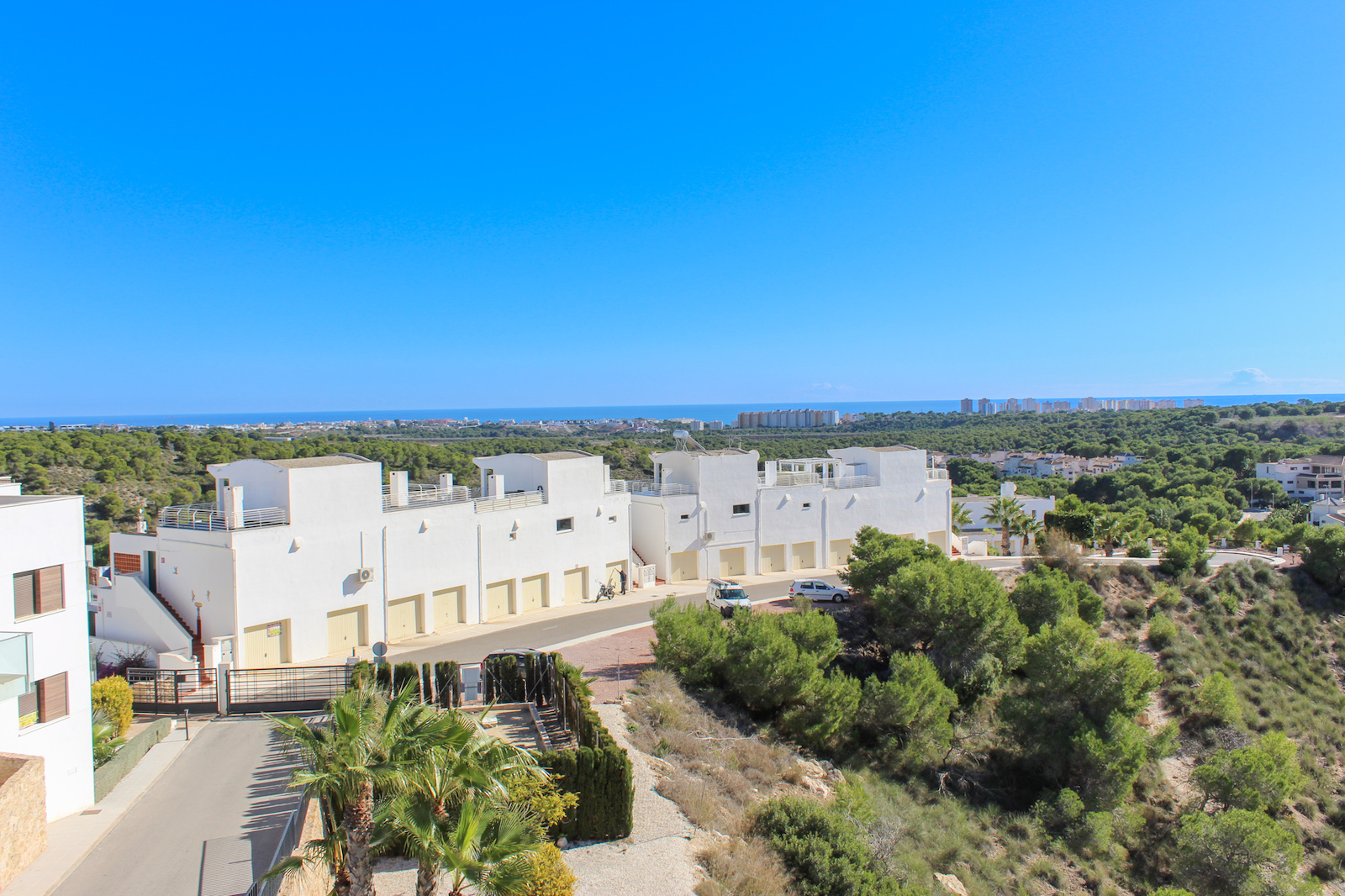 The complex is part of a gated community, which consists of several complexes, but this specific complex is distinguished by simply consisting of 15 units, which are common to the large infinity pool as well as the green garden area. From the pool there is a completely stunning and open view of the grove of pine trees and the coast as well as the Mediterranean in the background. The house is also within walking distance of several restaurants and bars; there are only 10 min. walk to the restaurant at Las Ramblas Golf, as well as 20 min. walk to La Fuente, which is a ‘center’ with many different restaurants, bars, and cafes. In the same area there is an Aldi and a Mercadona, so there are good shopping opportunities. Just 10 minutes’ drive from the house, you will also find a pearl of good beaches.