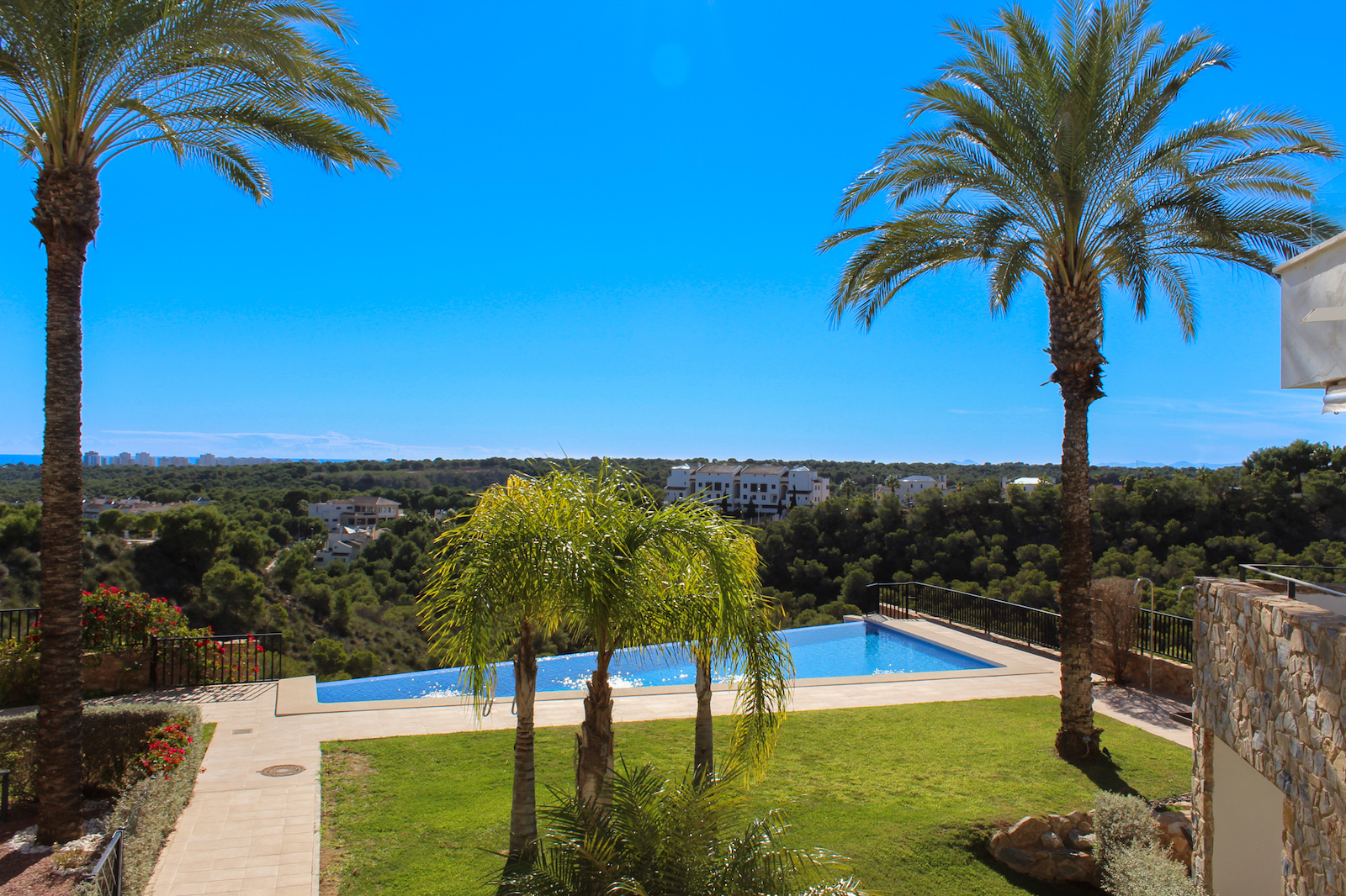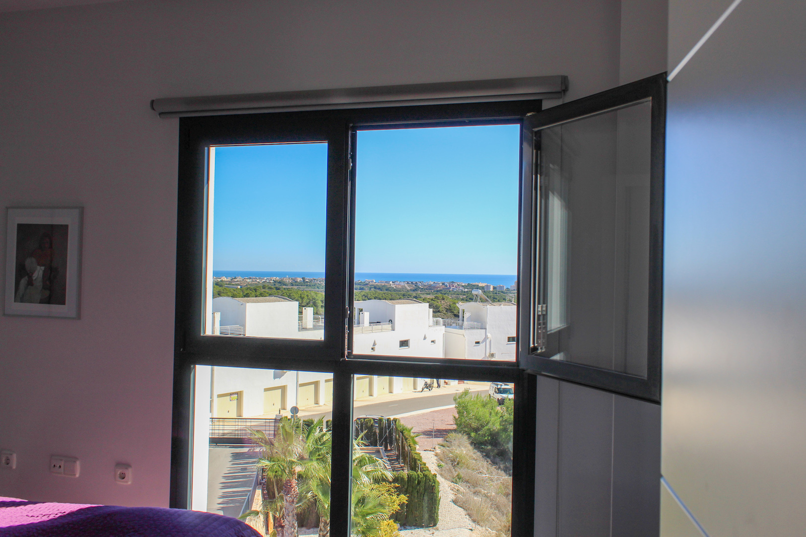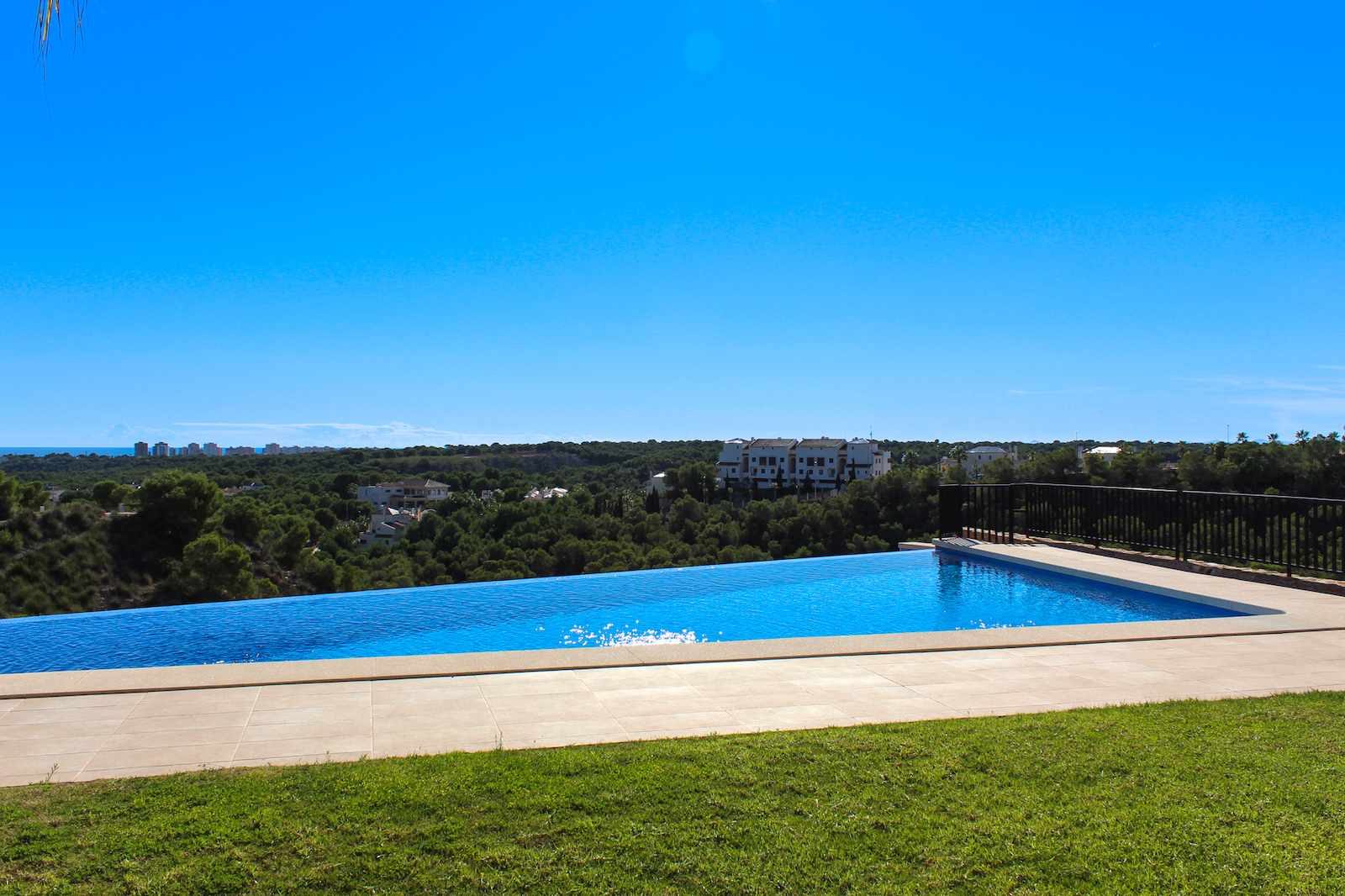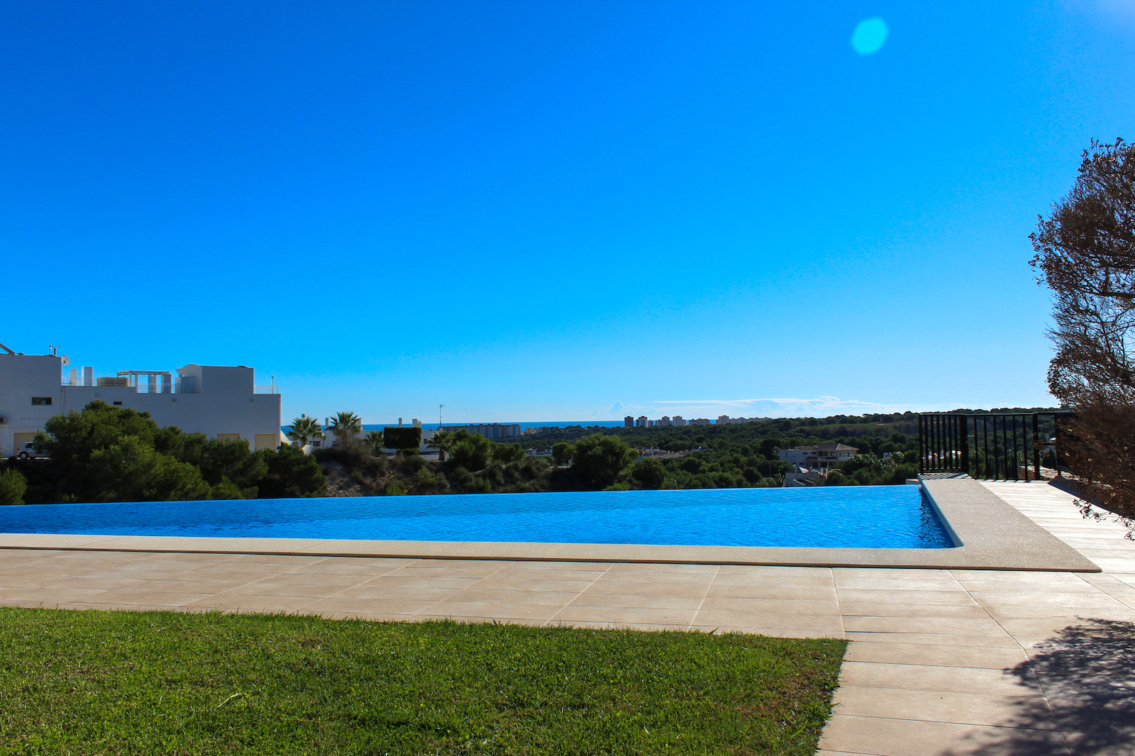 The complex is part of a gated community, which consists of several complexes, but this specific complex is distinguished by simply consisting of 15 units, which are common to the large infinity pool as well as the green garden area. From the pool there is a completely stunning and open view of the grove of pine trees and the coast as well as the Mediterranean in the background. The house is also within walking distance of several restaurants and bars; there are only 10 min. walk to the restaurant at Las Ramblas Golf, as well as 20 min. walk to La Fuente, which is a ‘center’ with many different restaurants, bars, and cafes. In the same area there is an Aldi and a Mercadona, so there are good shopping opportunities. Just 10 minutes’ drive from the house, you will also find a pearl of good beaches.