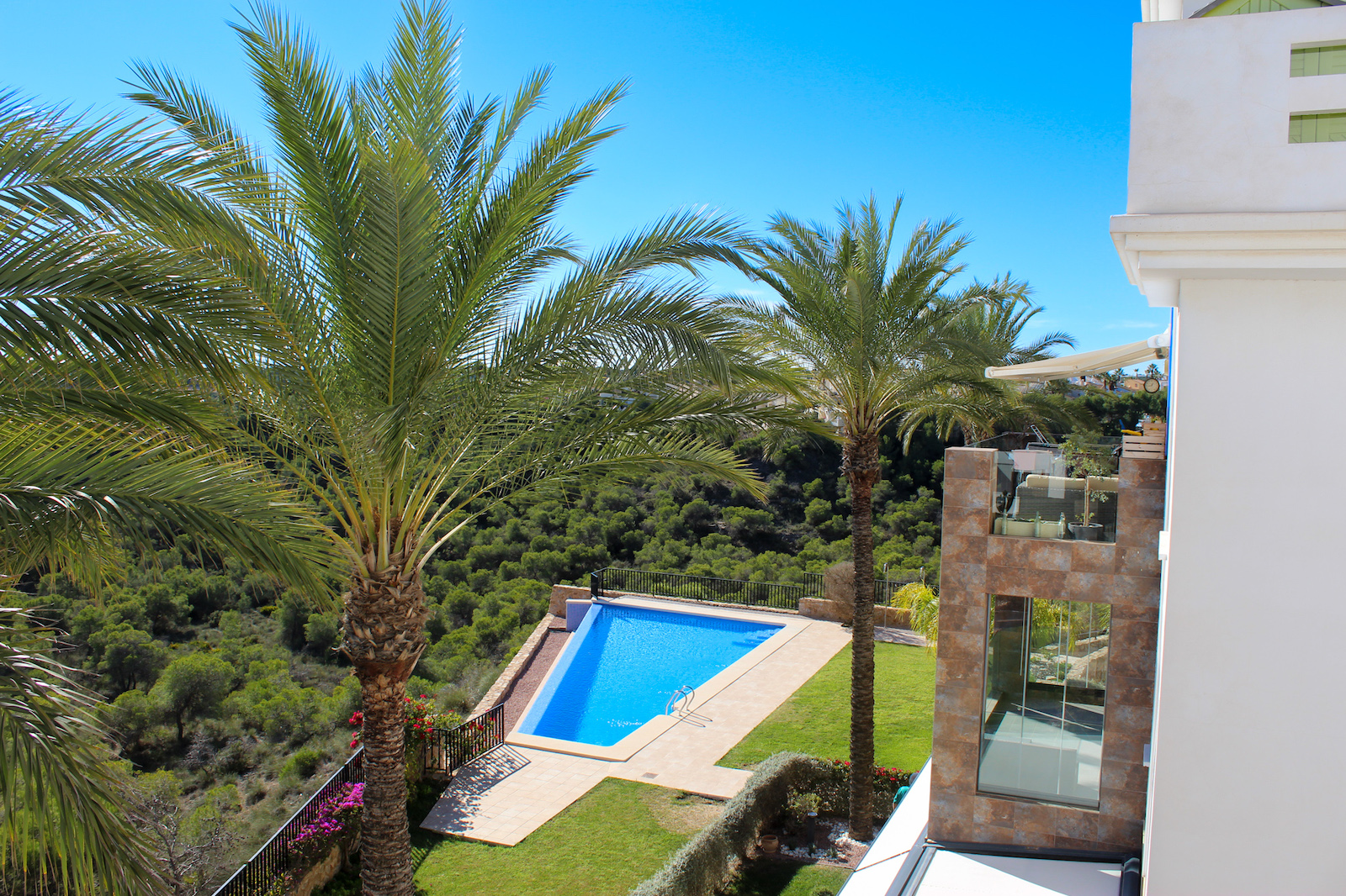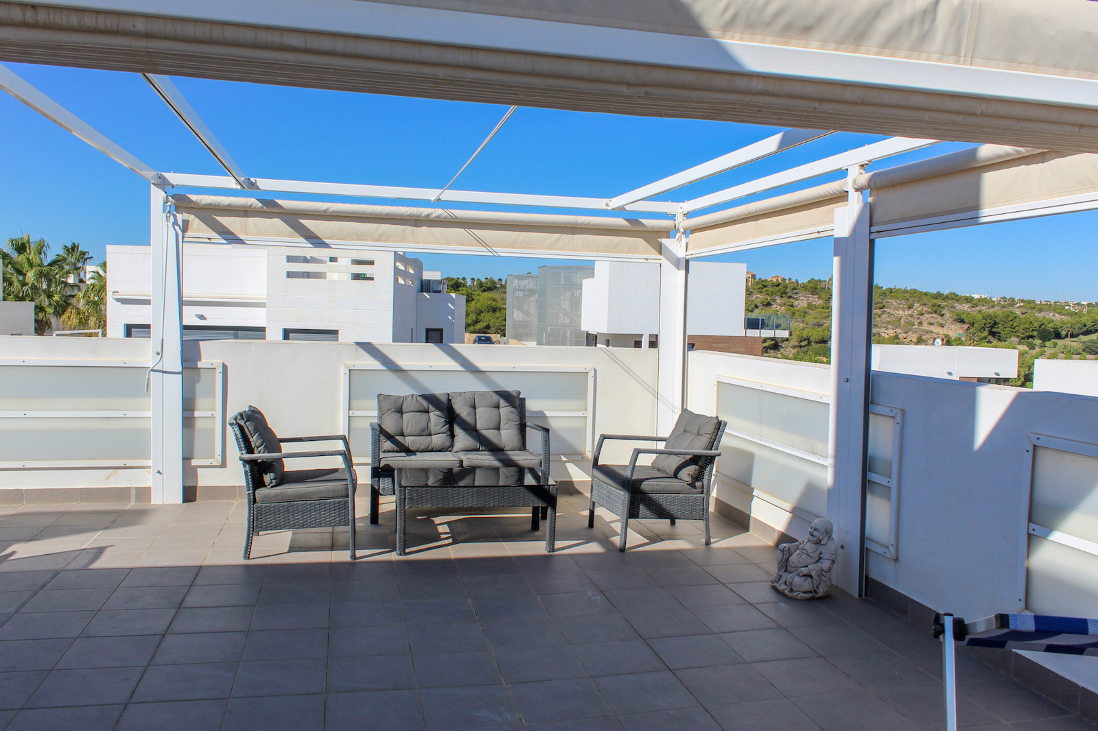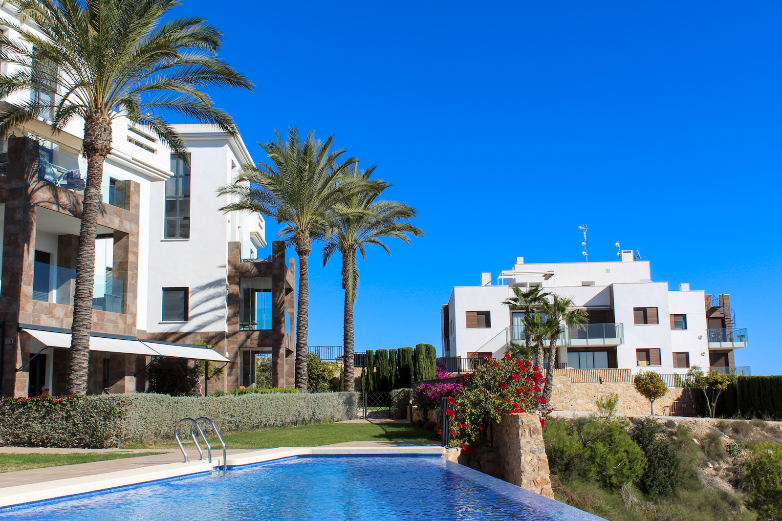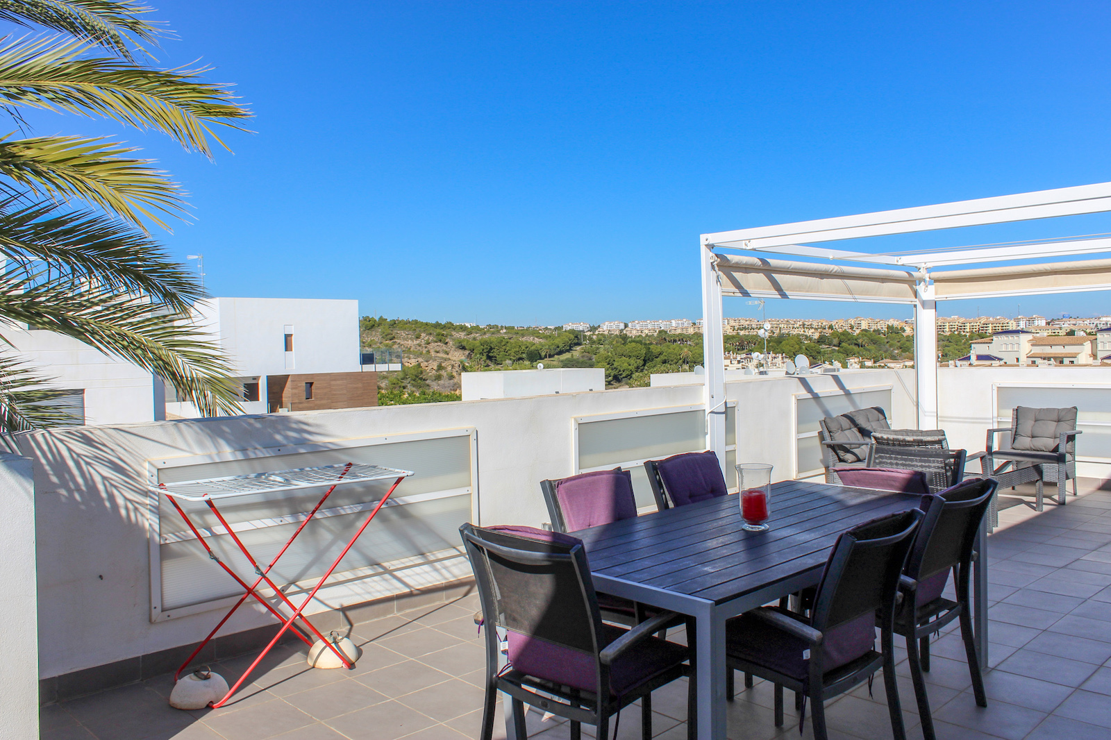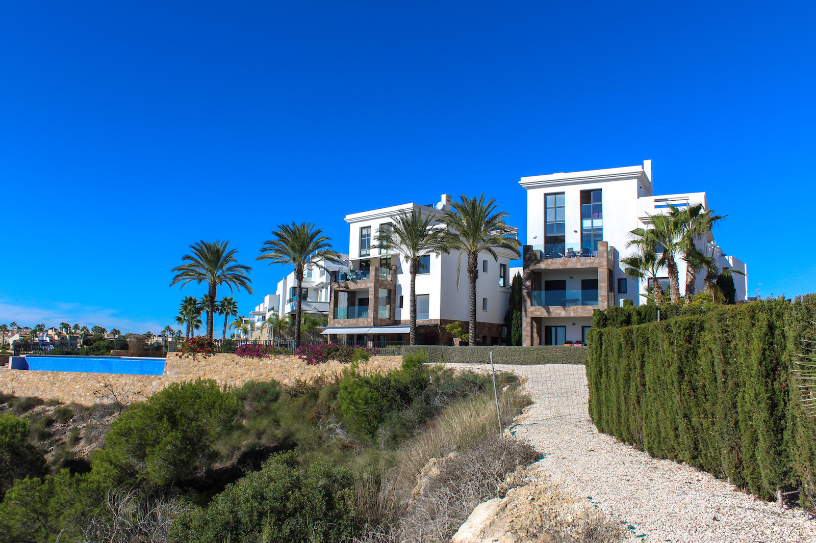 The complex is part of a gated community, which consists of several complexes, but this specific complex is distinguished by simply consisting of 15 units, which are common to the large infinity pool as well as the green garden area. From the pool there is a completely stunning and open view of the grove of pine trees and the coast as well as the Mediterranean in the background. The house is also within walking distance of several restaurants and bars; there are only 10 min. walk to the restaurant at Las Ramblas Golf, as well as 20 min. walk to La Fuente, which is a ‘center’ with many different restaurants, bars, and cafes. In the same area there is an Aldi and a Mercadona, so there are good shopping opportunities. Just 10 minutes’ drive from the house, you will also find a pearl of good beaches.
