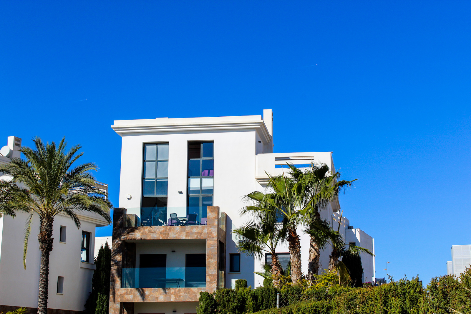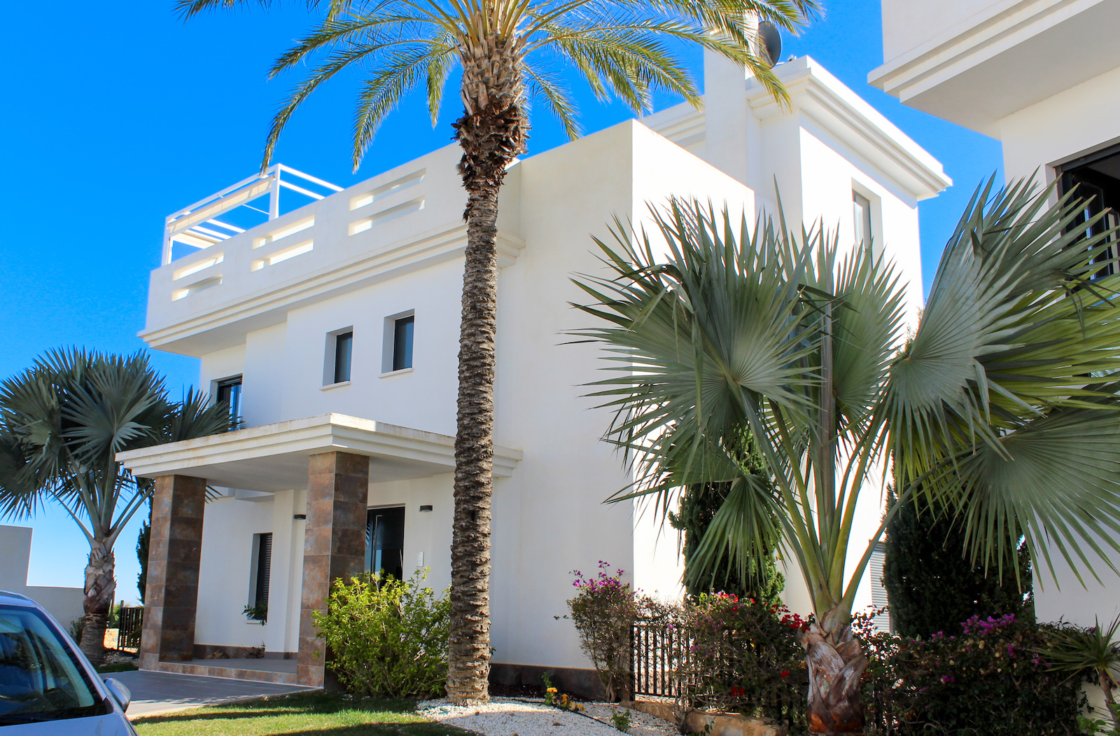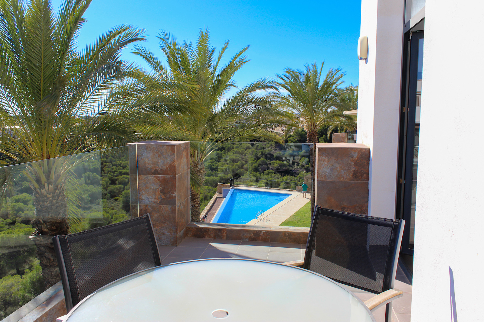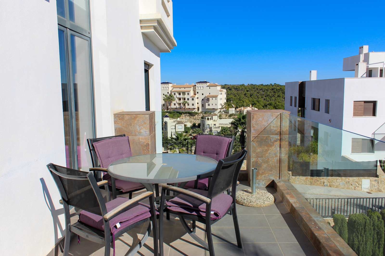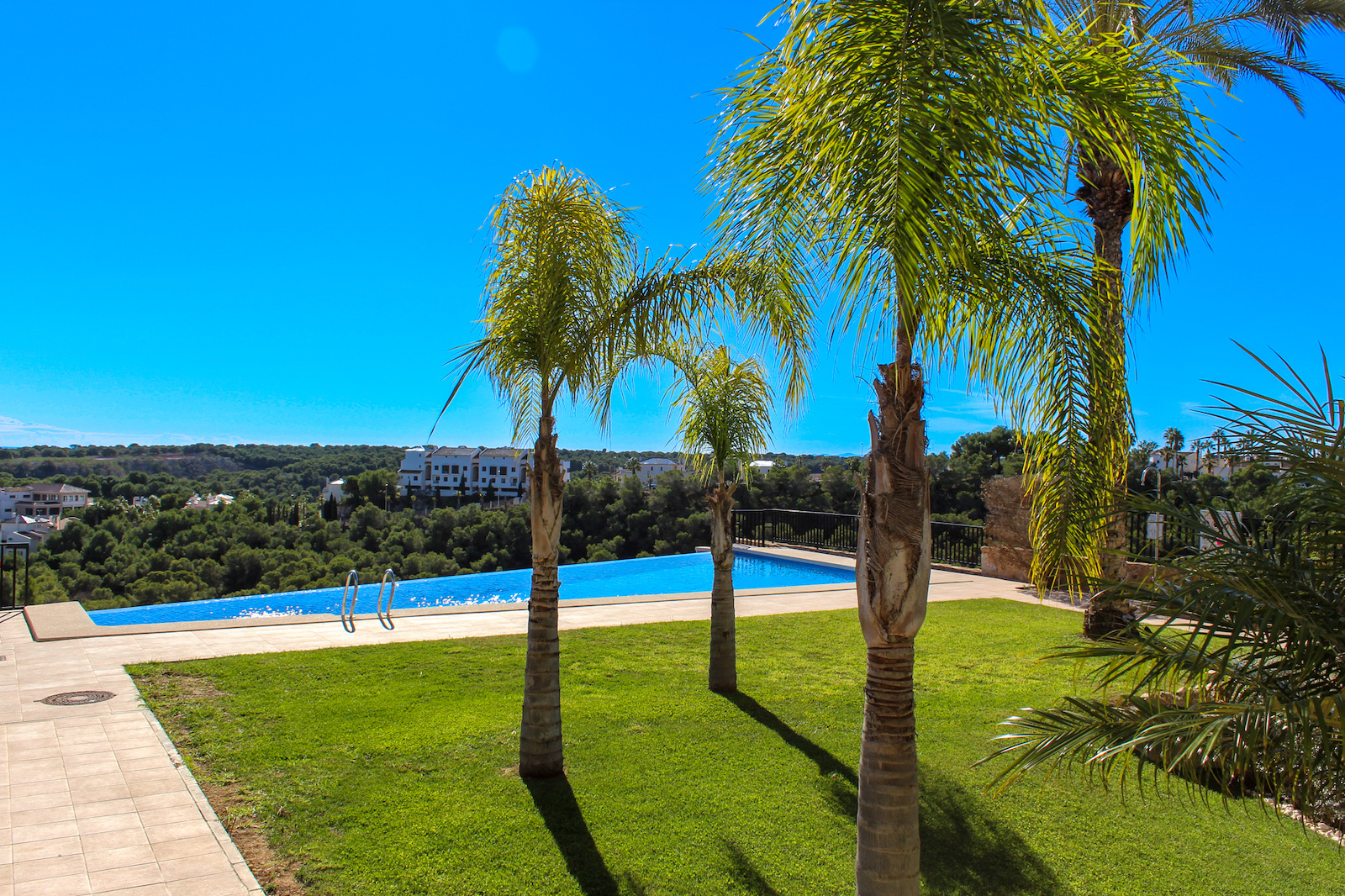 The complex is part of a gated community, which consists of several complexes, but this specific complex is distinguished by simply consisting of 15 units, which are common to the large infinity pool as well as the green garden area. From the pool there is a completely stunning and open view of the grove of pine trees and the coast as well as the Mediterranean in the background. The house is also within walking distance of several restaurants and bars; there are only 10 min. walk to the restaurant at Las Ramblas Golf, as well as 20 min. walk to La Fuente, which is a ‘center’ with many different restaurants, bars, and cafes. In the same area there is an Aldi and a Mercadona, so there are good shopping opportunities. Just 10 minutes’ drive from the house, you will also find a pearl of good beaches.