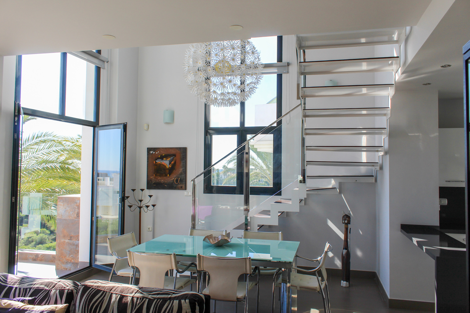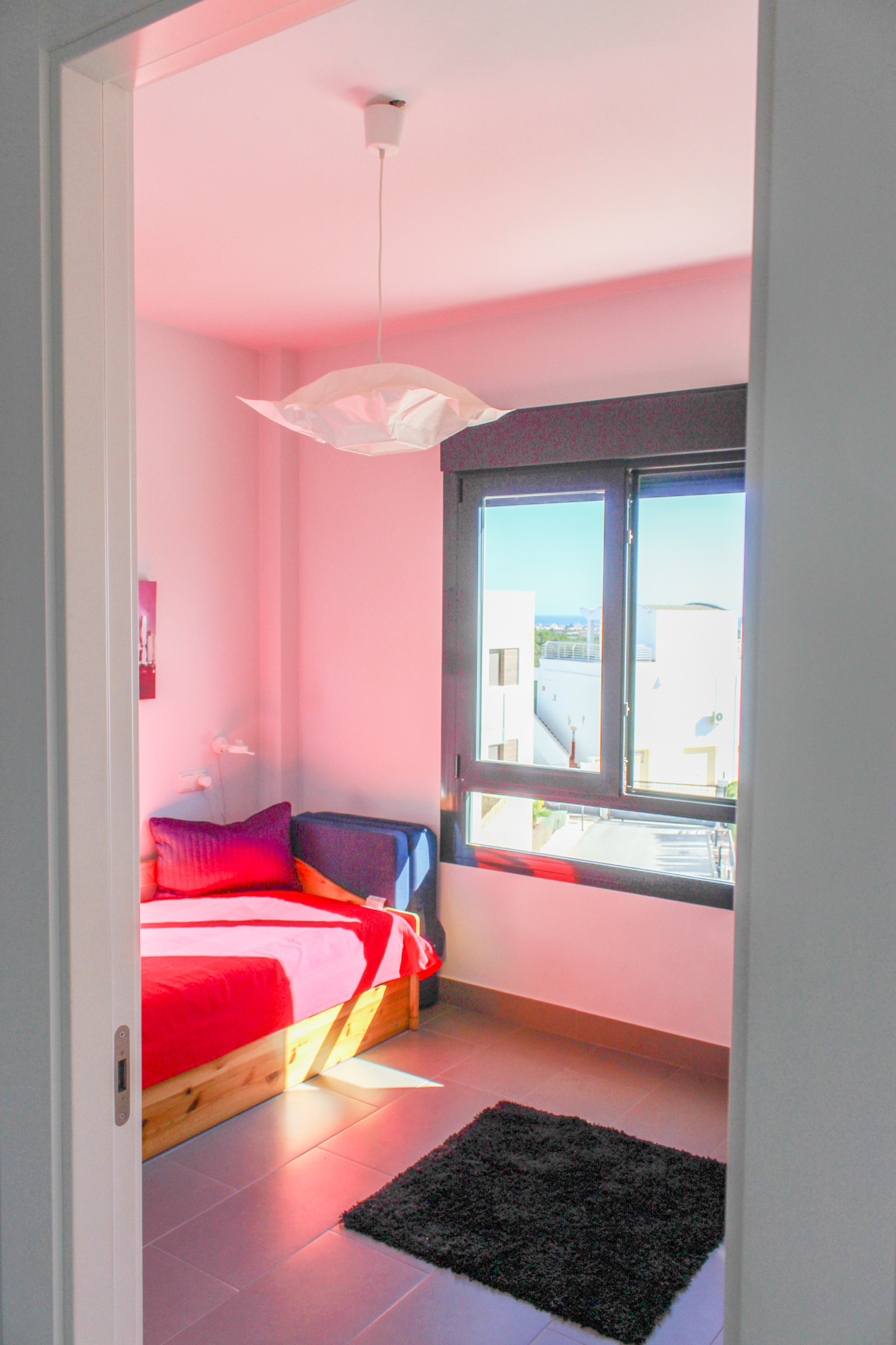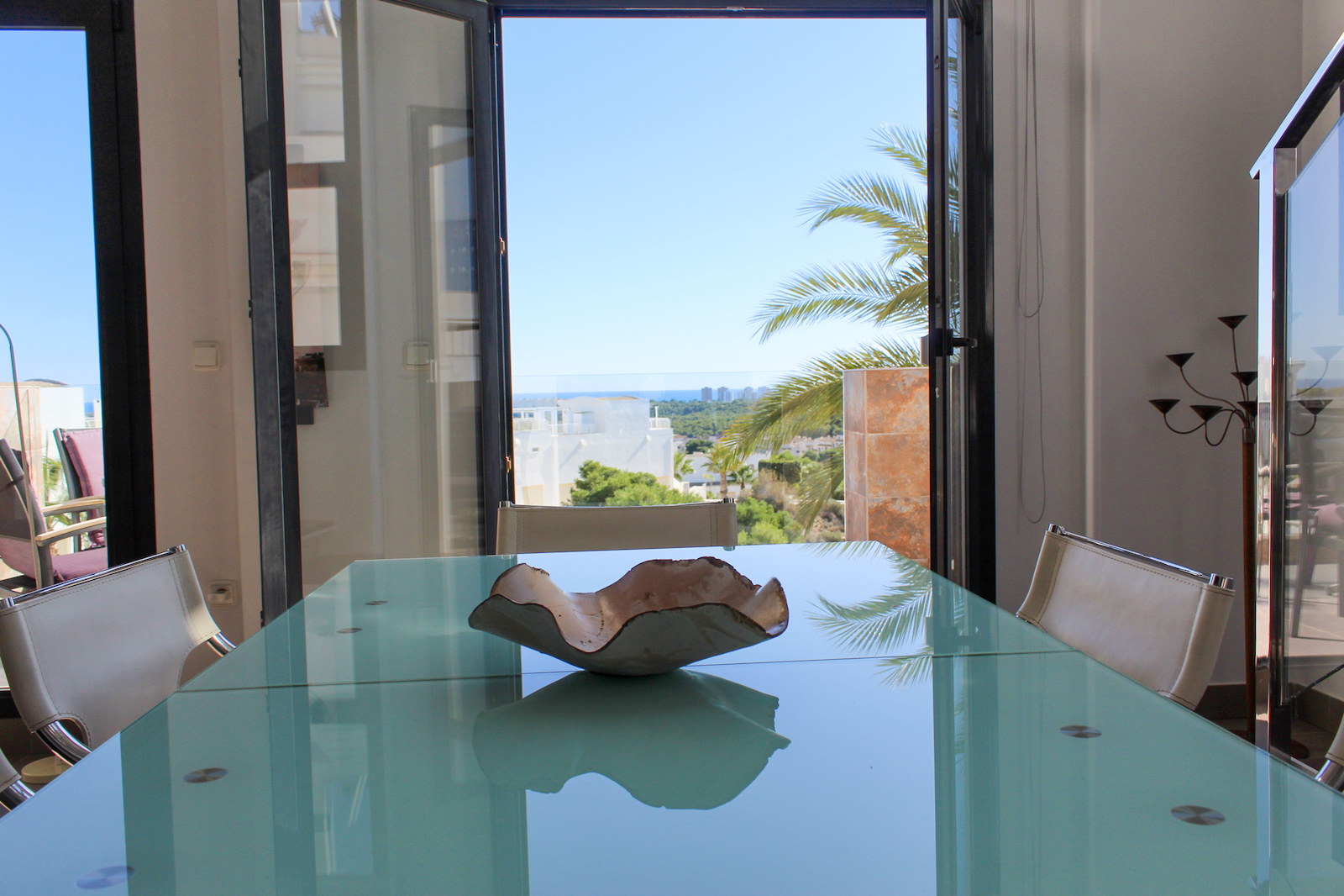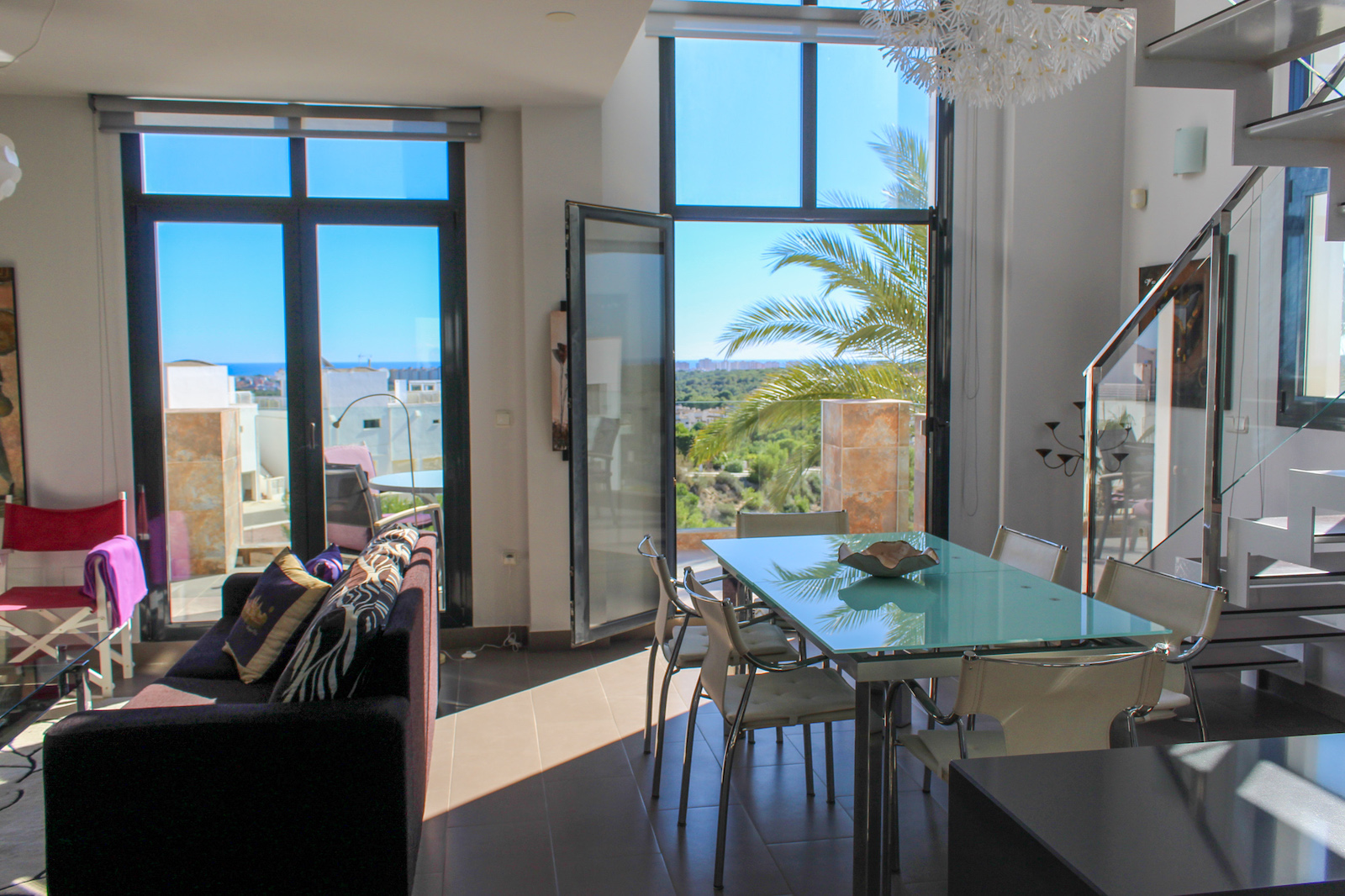 The home is located on the first floor and when you come up the stairs, there is a large landing which is used for storage of, for example, golf bags and entrance, where jackets and footwear are placed before entering the home. On the ground floor of the home, you have a large, bright kitchen/living room with a modern kitchen, dining room and living room. In this room, as previously mentioned, there is a fantastic amount of light, as well as a ceiling height that gives a fantastic feeling of space. From the kitchen / family room there is access to a 12 m2 large south-facing terrace from which you can enjoy the view of the pool area, the golf course, the Mediterranean Sea, and the beautiful lights down on the coast in the evening. In addition to the kitchen/living room, there are 2 good bedrooms with fitted wardrobes and a bathroom.