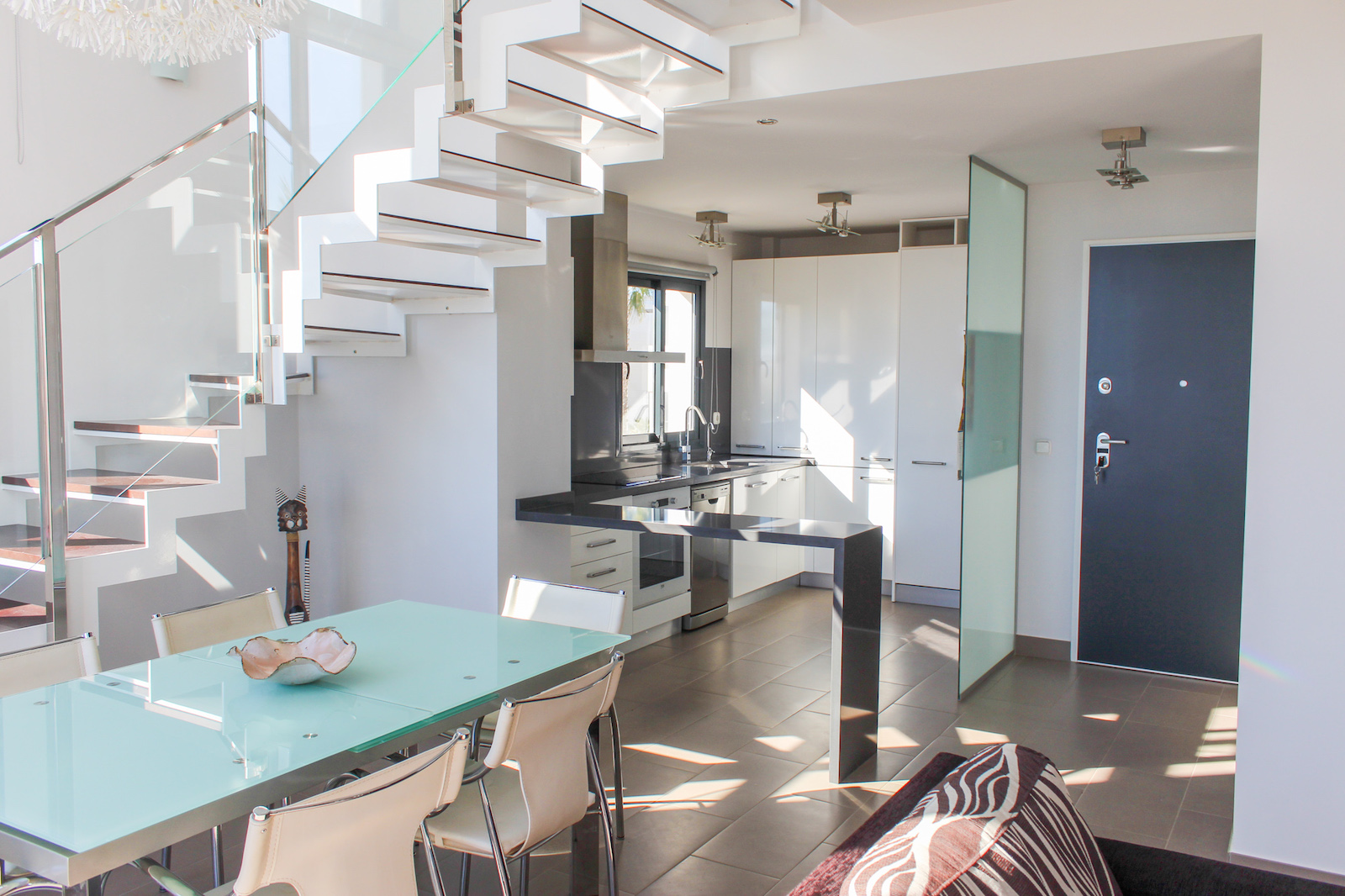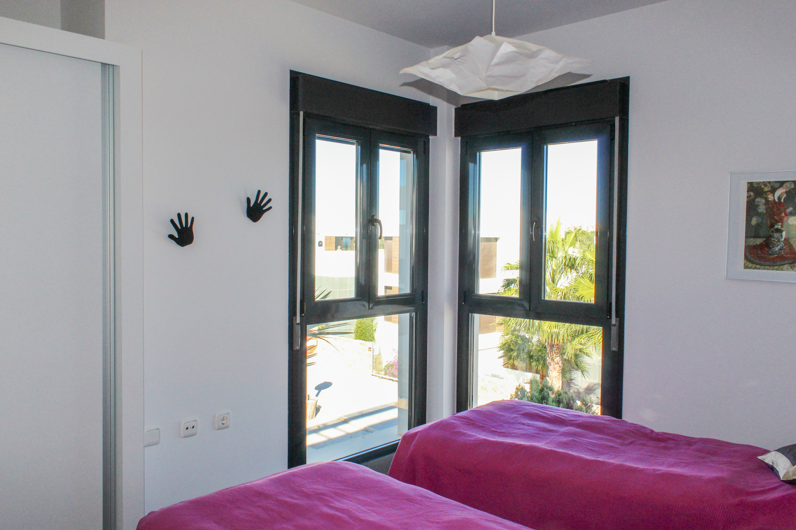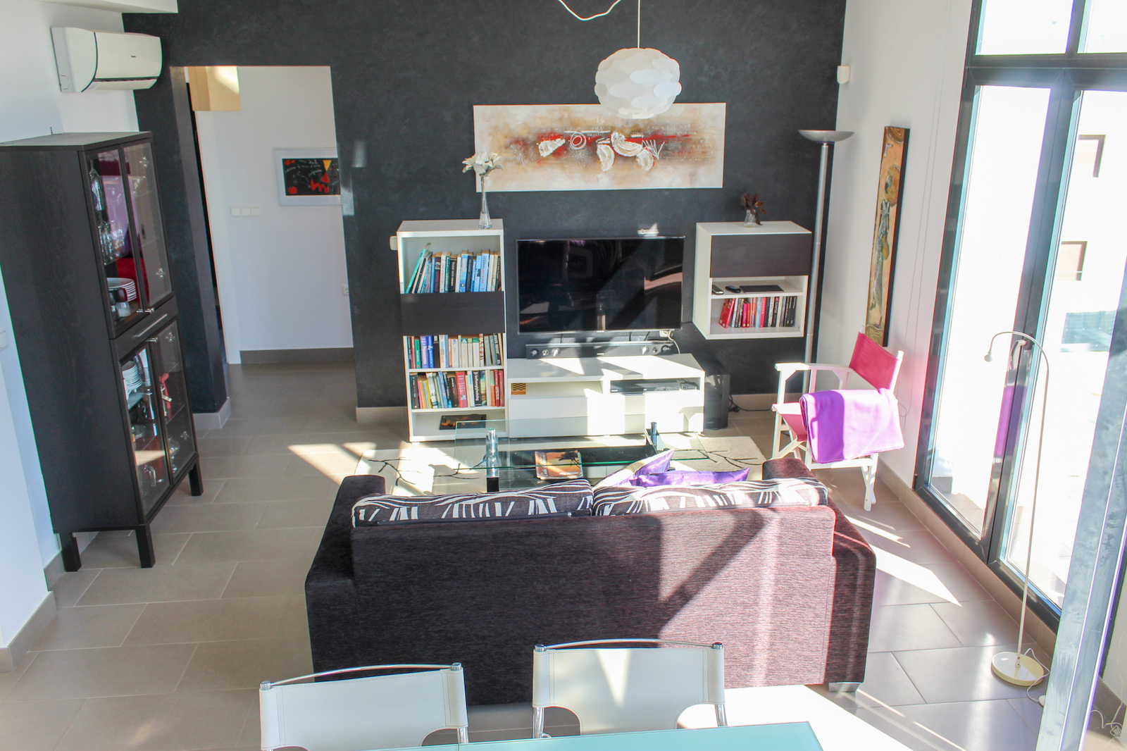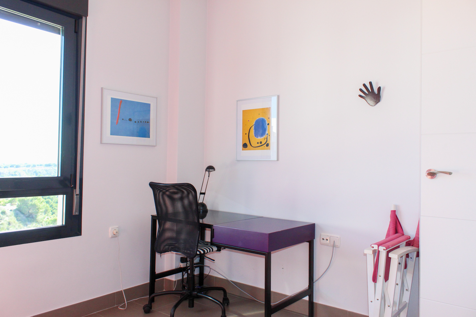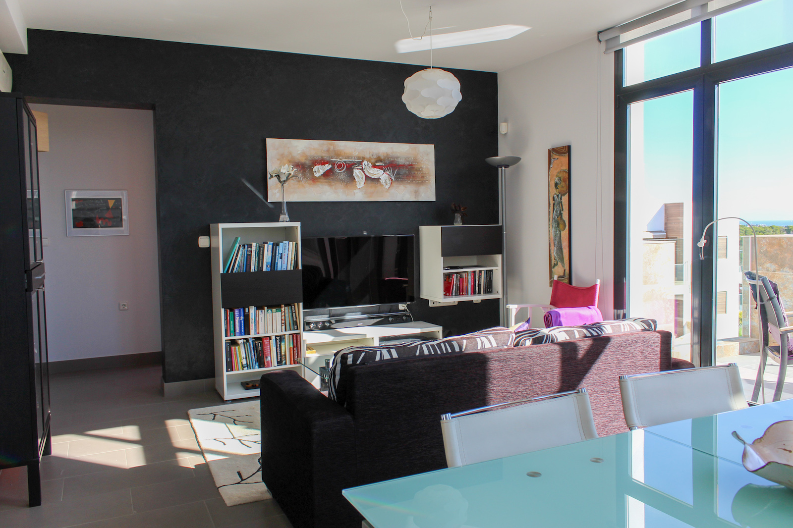 The home is located on the first floor and when you come up the stairs, there is a large landing which is used for storage of, for example, golf bags and entrance, where jackets and footwear are placed before entering the home. On the ground floor of the home, you have a large, bright kitchen/living room with a modern kitchen, dining room and living room. In this room, as previously mentioned, there is a fantastic amount of light, as well as a ceiling height that gives a fantastic feeling of space. From the kitchen / family room there is access to a 12 m2 large south-facing terrace from which you can enjoy the view of the pool area, the golf course, the Mediterranean Sea, and the beautiful lights down on the coast in the evening. In addition to the kitchen/living room, there are 2 good bedrooms with fitted wardrobes and a bathroom.