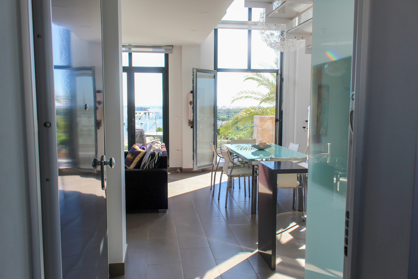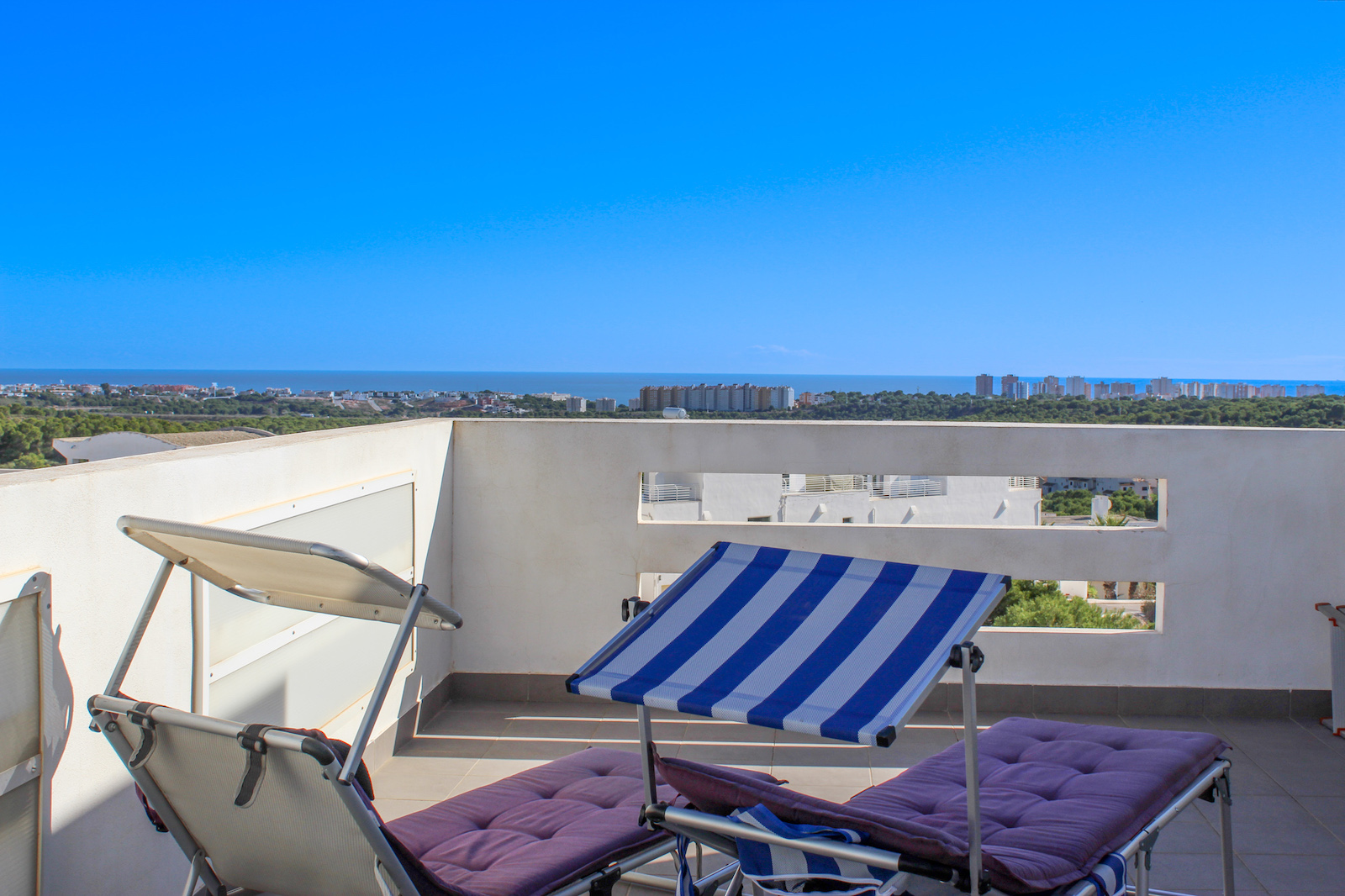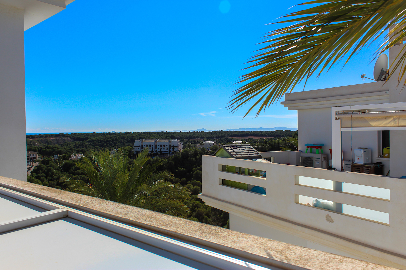 This fine and well-distributed bungalow apartment with 3 rooms and 2 bathrooms, is located in a true oasis between respectively Villamartín, Campoamor, Las Ramblas and Las Colinas golf courses. In addition to the view of a protected grove of pine trees, as well as the Las Ramblas golf course, there is also a fantastic, undisturbed sea view; you can even see the Mediterranean as you enter the home, thanks to the large windows in the kitchen/living room that go from floor to ceiling.
