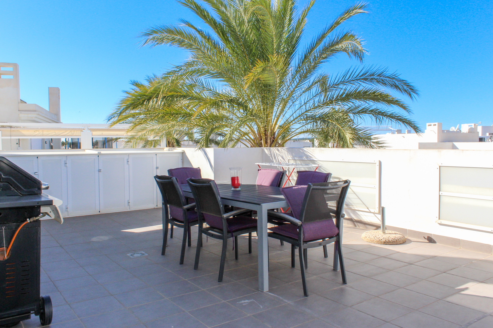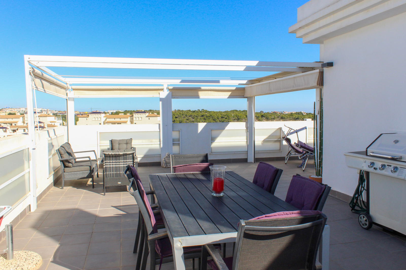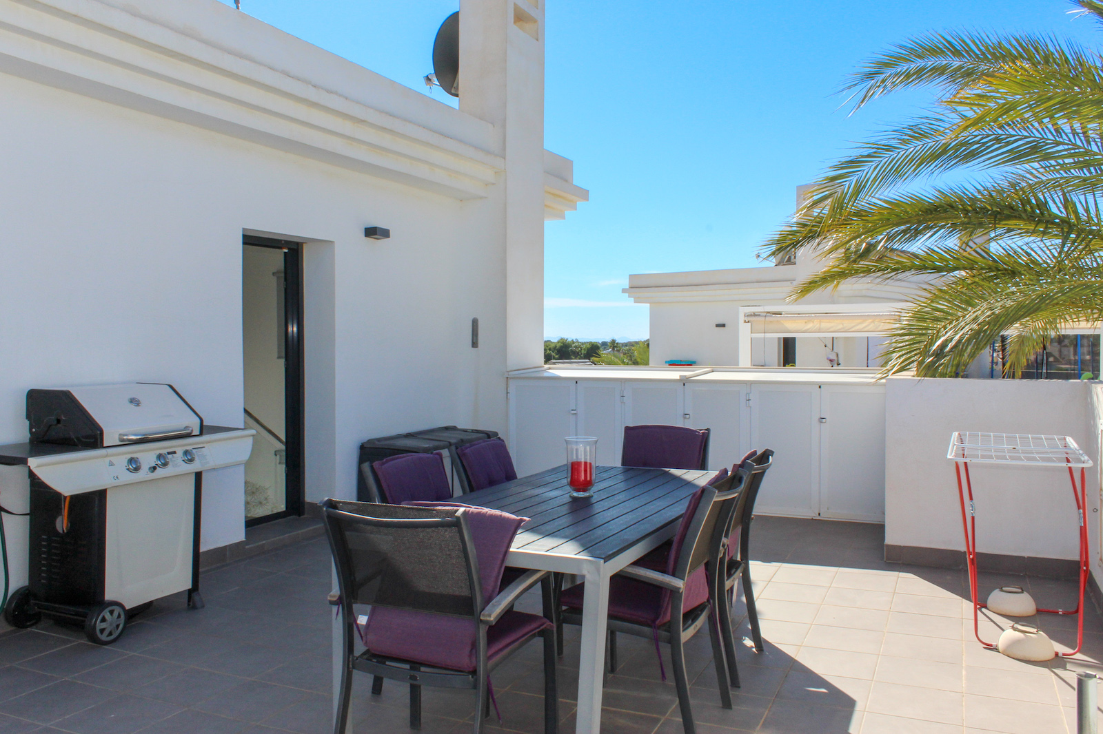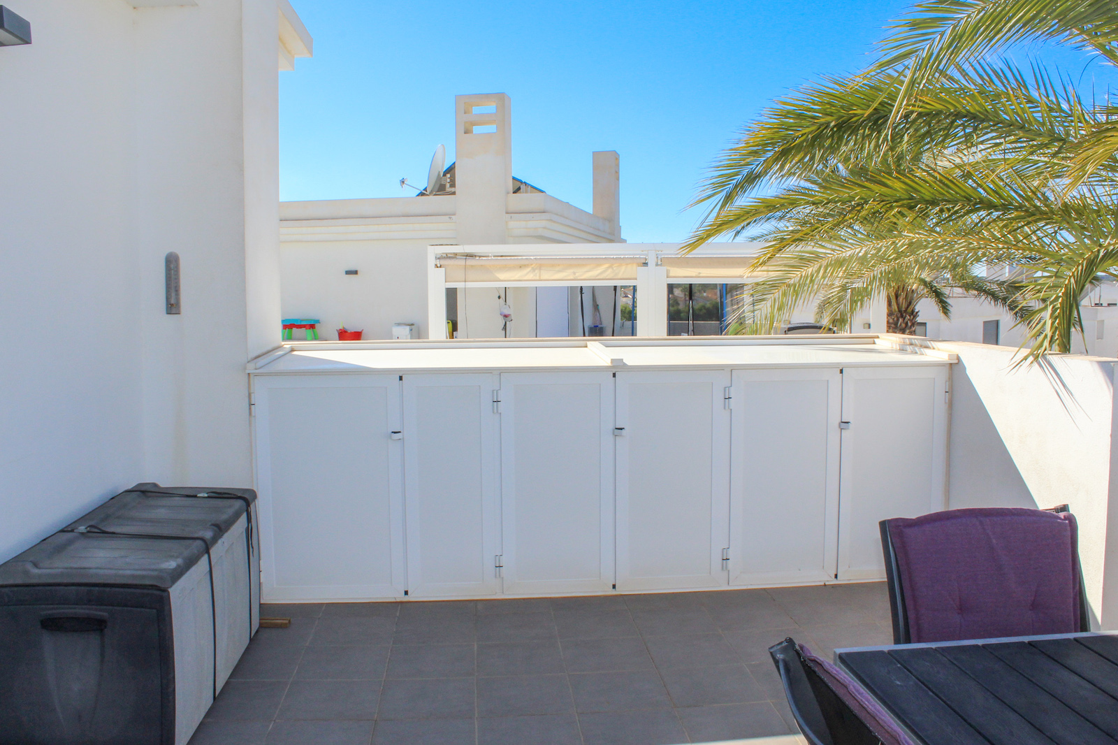 On the first floor you will find the home's master bedroom, from which you also have a fantastic view of the Mediterranean, as well as a bathroom and the 69 m2 large roof terrace. On the roof terrace, the seller has made storage space along the entire one side, where a refrigerator is also installed. They have also installed a pergola, which allows you to close both the sides and the top when you need shade from the back sun - or shelter from the wind. This means that the roof terrace can be used all year round. There is air conditioning throughout the home, and it is sold furnished and is therefore completely ready to move in!