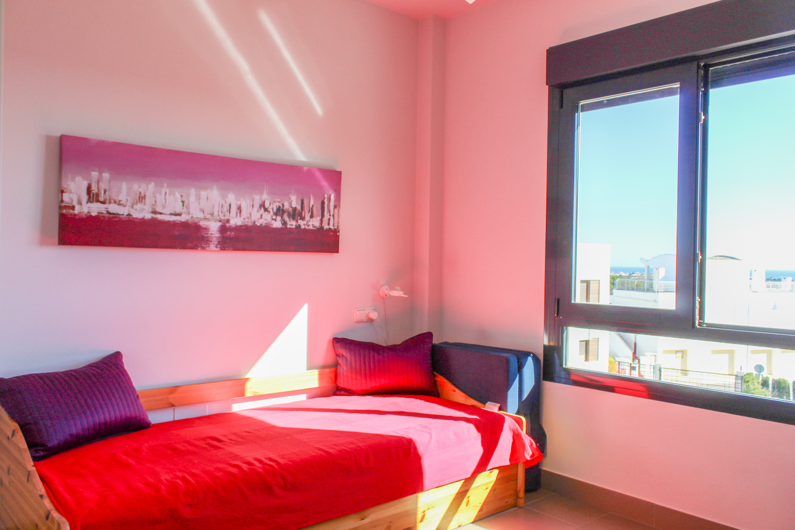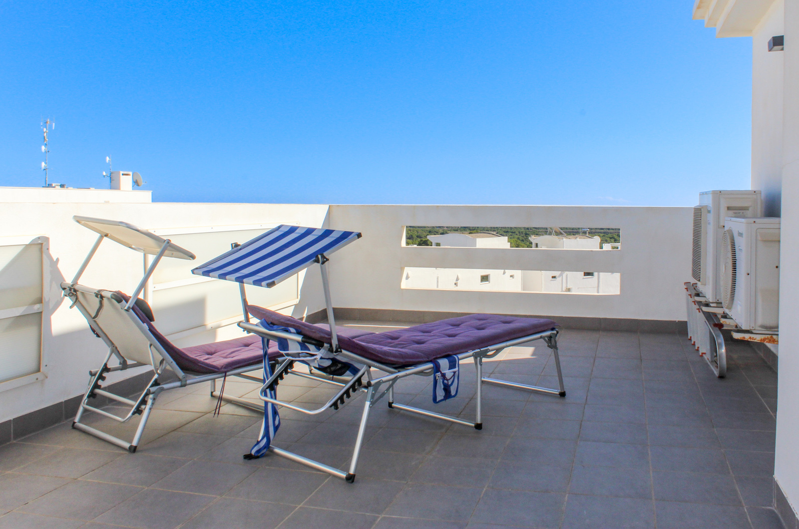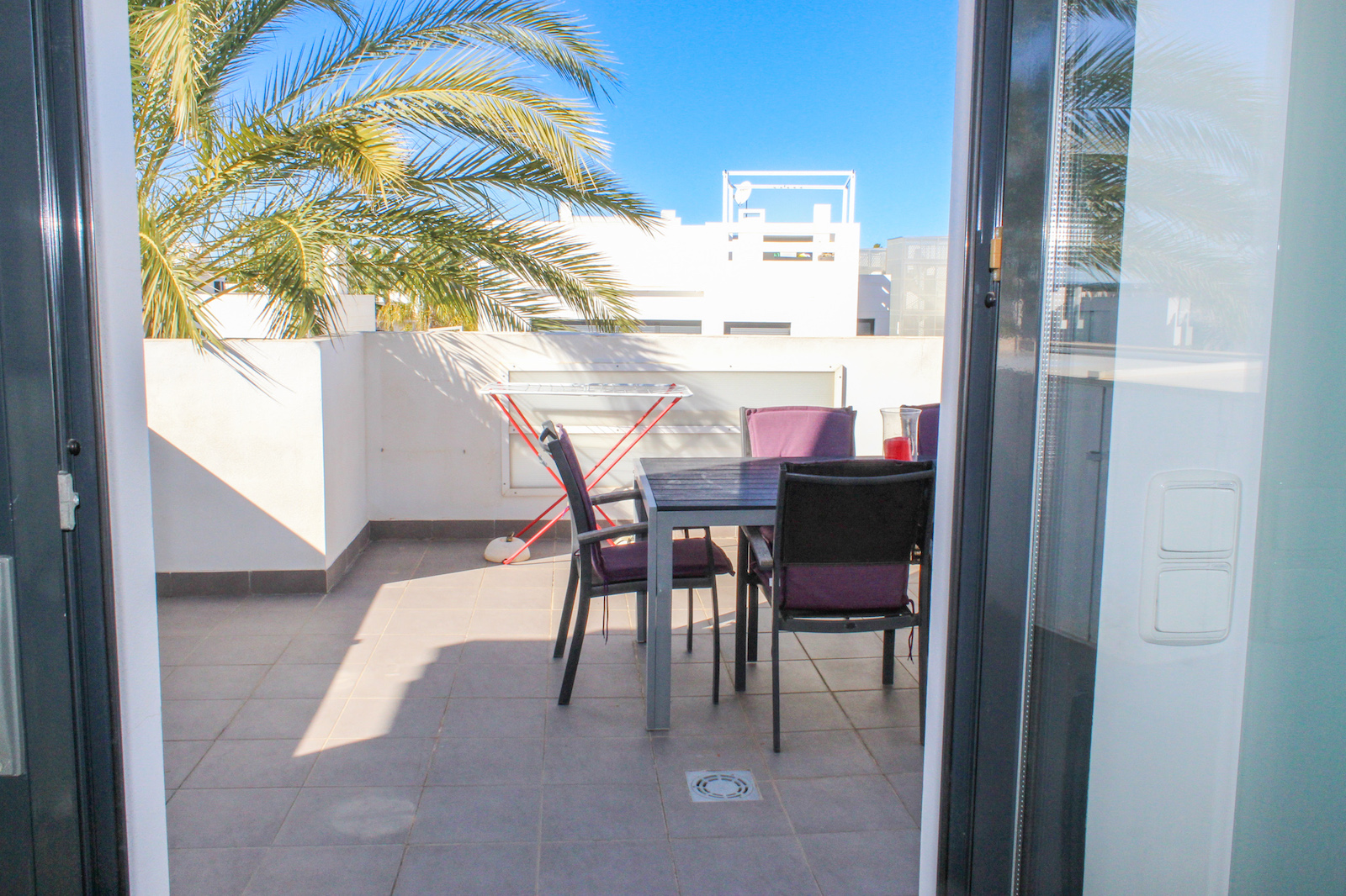 On the first floor you will find the home's master bedroom, from which you also have a fantastic view of the Mediterranean, as well as a bathroom and the 69 m2 large roof terrace. On the roof terrace, the seller has made storage space along the entire one side, where a refrigerator is also installed. They have also installed a pergola, which allows you to close both the sides and the top when you need shade from the back sun - or shelter from the wind. This means that the roof terrace can be used all year round. There is air conditioning throughout the home, and it is sold furnished and is therefore completely ready to move in!