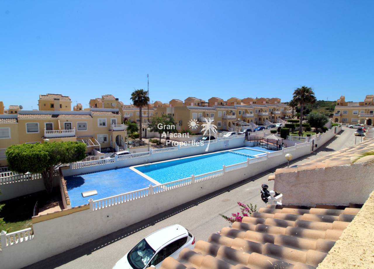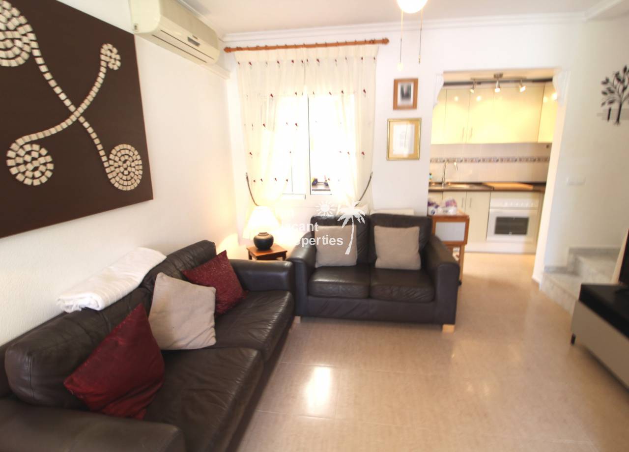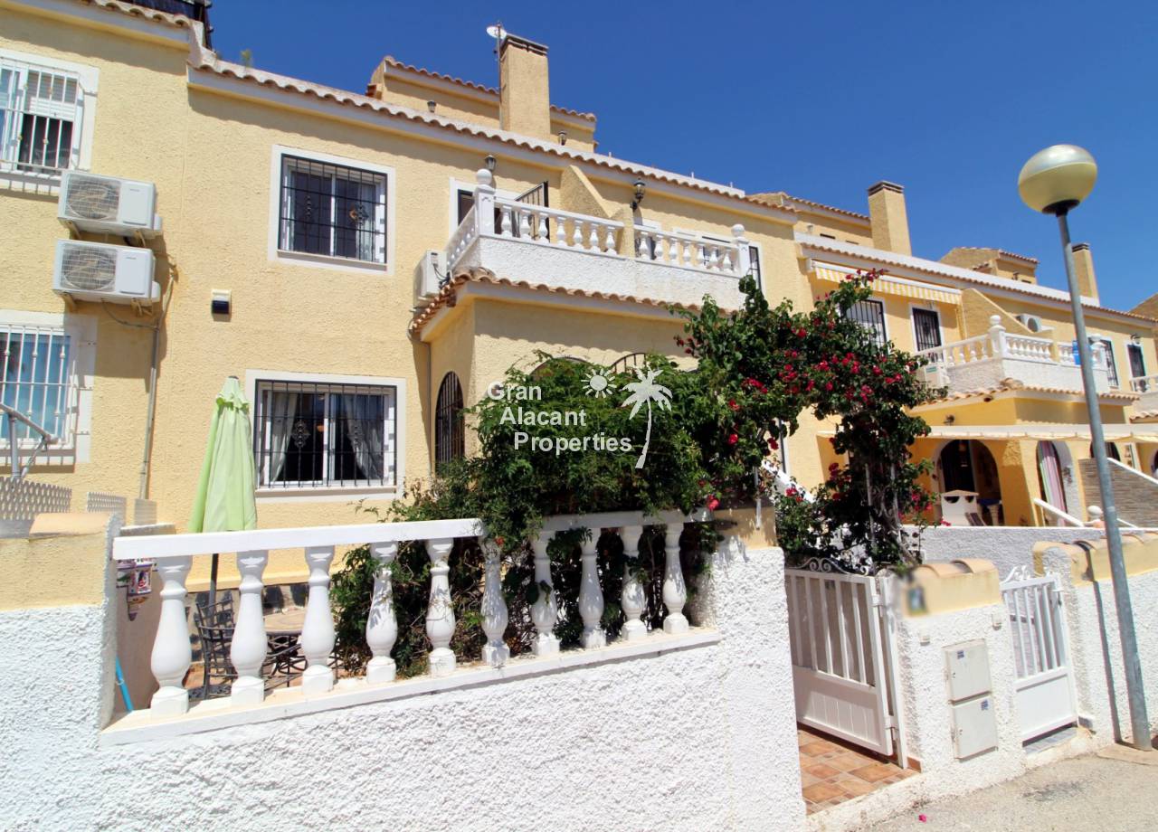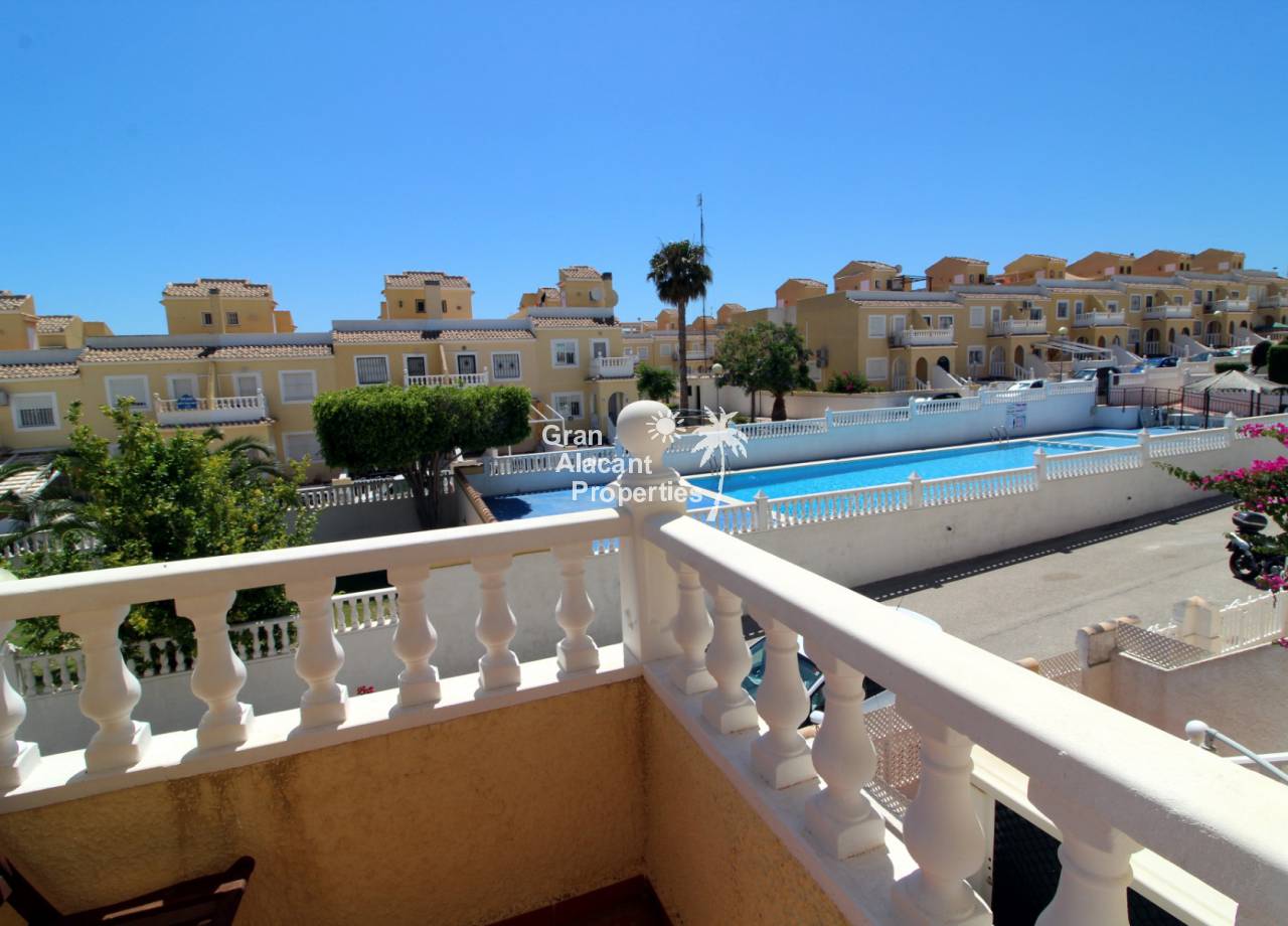 Immaculate south-east facing Gran Alacant townhouse in a great location for sale! We are proud to offer this well presented 2/3 bed townhouse on a sought after community in the lower part of Gran Alacant (zona colegio). Walk to the beach, shops, bars and more. On the ground floor, there is a large open plan air-conditioned living and dining space with an American-style kitchen which has been extended into the covered galleria and a bathroom. On the first floor, there is an air-conditioned master bedroom with built-in his and her wardrobes and private balcony overlooking the pool and community gardens, a second double bedroom with built-in wardrobe and a family bathroom. Located in the lower level of the house, there is a large basement with a window, which has been set up by the current owner as an additional bedroom, lounge and storage area. There are security bars and the property is sold fully furnished including all white goods (not including personal items) so the house move-in ready. Unpack your suitcase and enjoy.