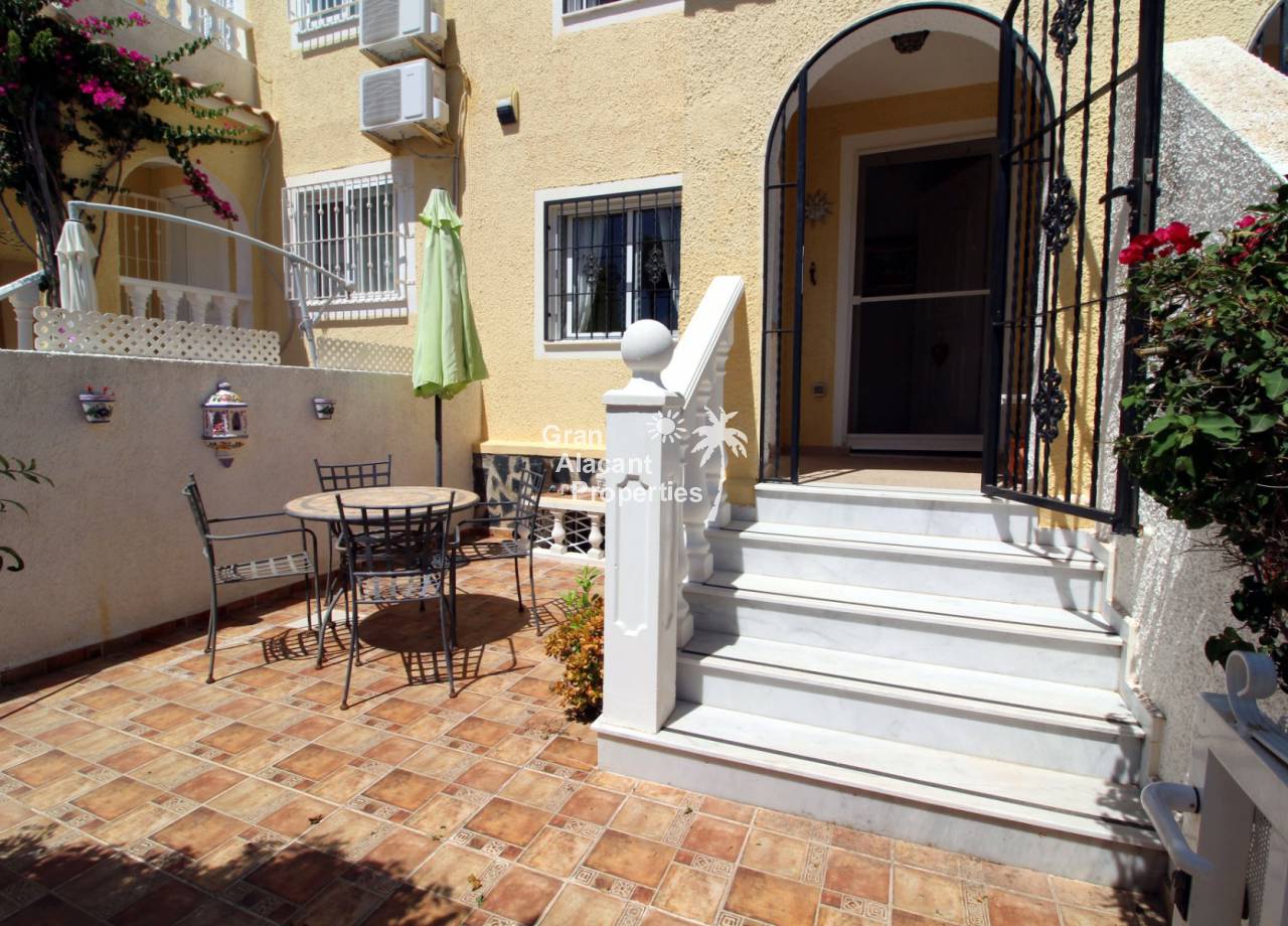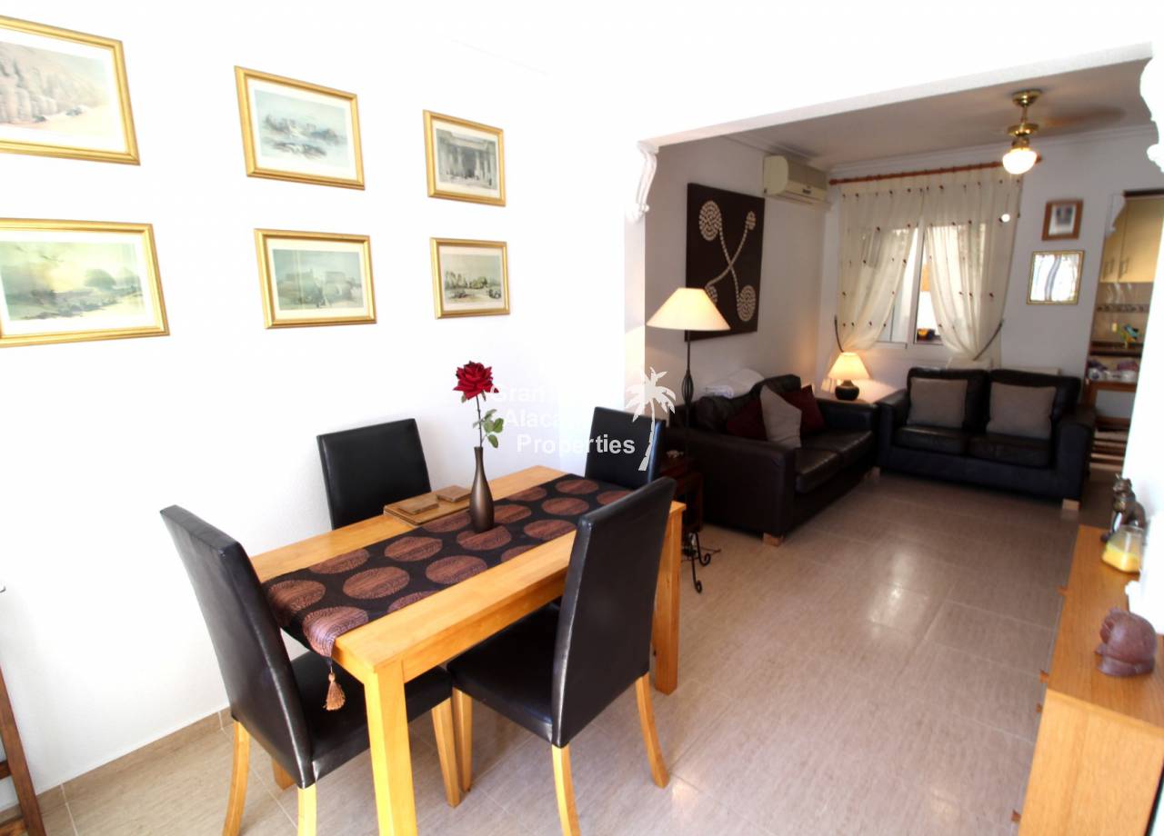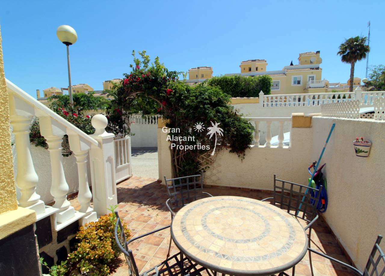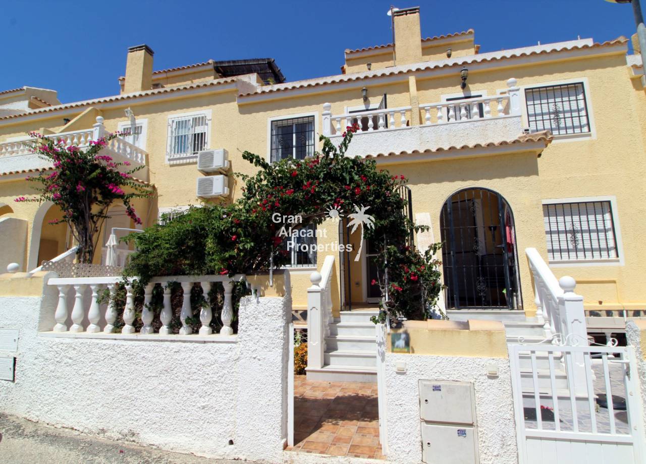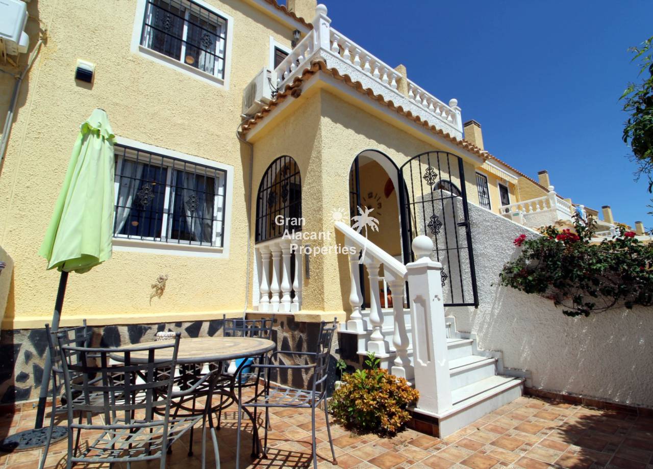 Immaculate south-east facing Gran Alacant townhouse in a great location for sale! We are proud to offer this well presented 2/3 bed townhouse on a sought after community in the lower part of Gran Alacant (zona colegio). Walk to the beach, shops, bars and more. On the ground floor, there is a large open plan air-conditioned living and dining space with an American-style kitchen which has been extended into the covered galleria and a bathroom. On the first floor, there is an air-conditioned master bedroom with built-in his and her wardrobes and private balcony overlooking the pool and community gardens, a second double bedroom with built-in wardrobe and a family bathroom. Located in the lower level of the house, there is a large basement with a window, which has been set up by the current owner as an additional bedroom, lounge and storage area. There are security bars and the property is sold fully furnished including all white goods (not including personal items) so the house move-in ready. Unpack your suitcase and enjoy.