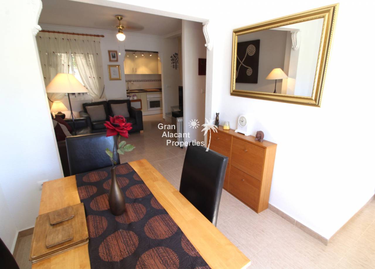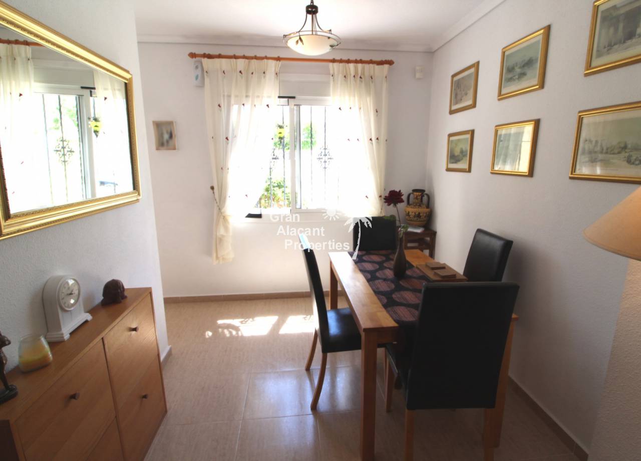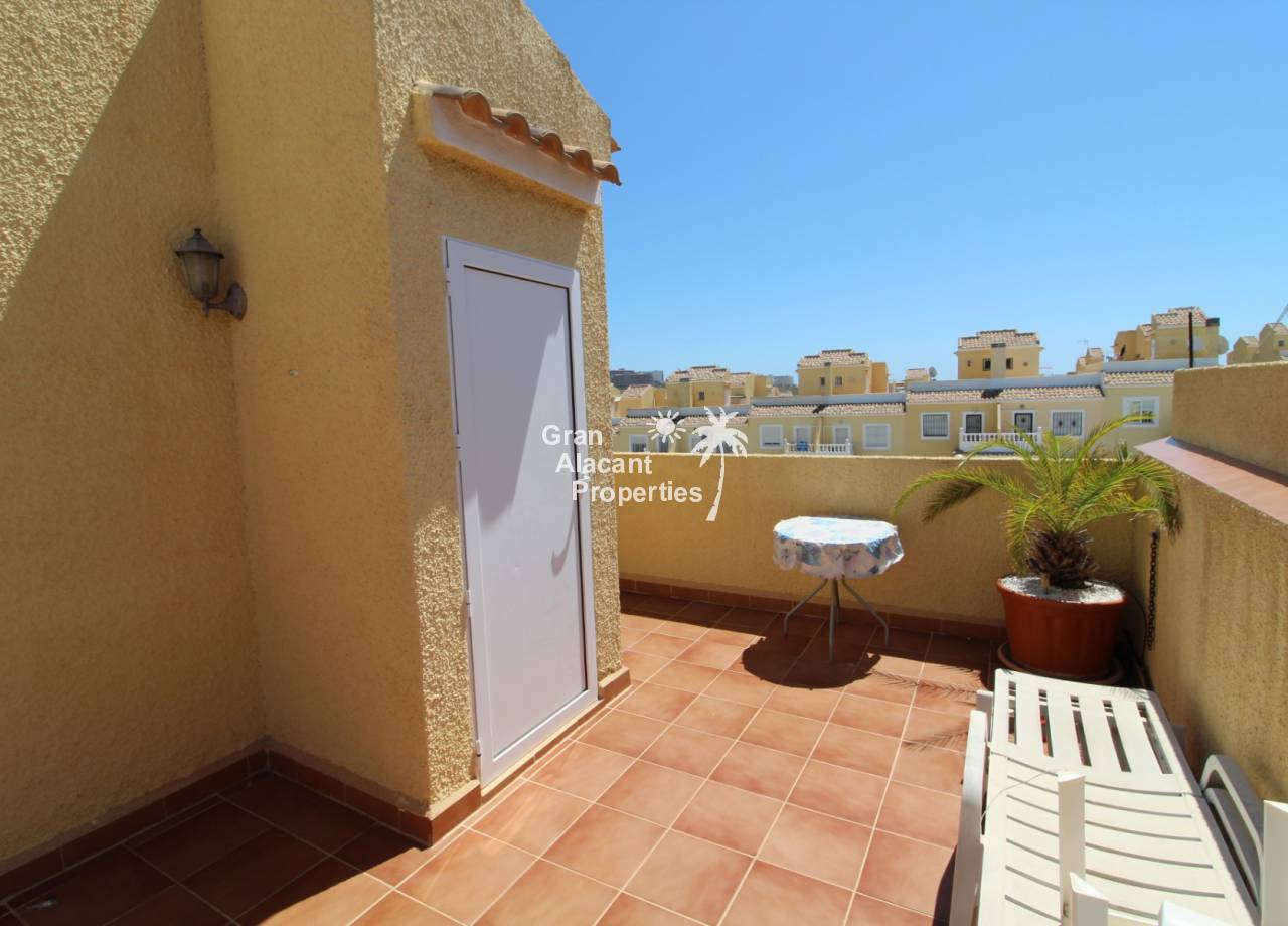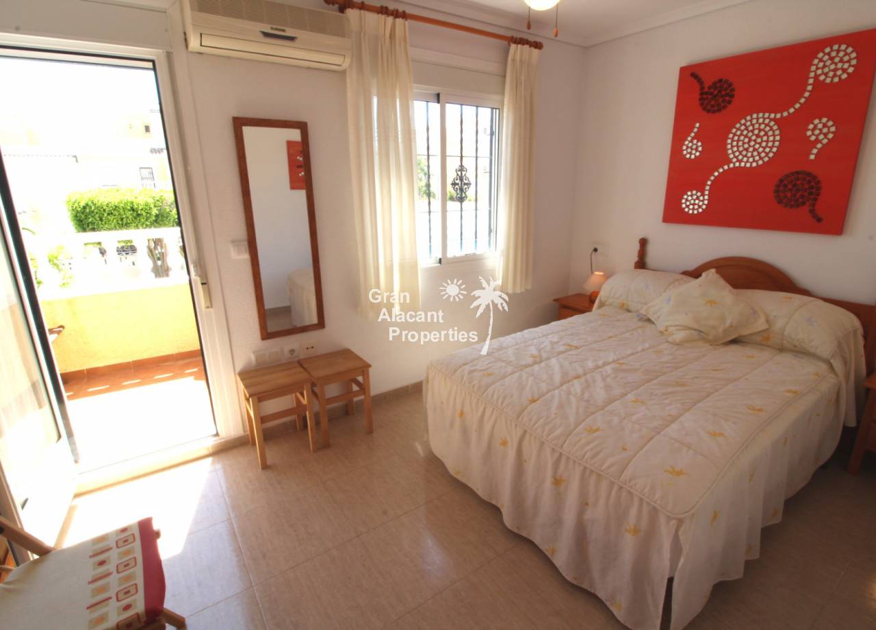 Immaculate south-east facing Gran Alacant townhouse in a great location for sale! We are proud to offer this well presented 2/3 bed townhouse on a sought after community in the lower part of Gran Alacant (zona colegio). Walk to the beach, shops, bars and more. On the ground floor, there is a large open plan air-conditioned living and dining space with an American-style kitchen which has been extended into the covered galleria and a bathroom. On the first floor, there is an air-conditioned master bedroom with built-in his and her wardrobes and private balcony overlooking the pool and community gardens, a second double bedroom with built-in wardrobe and a family bathroom. Located in the lower level of the house, there is a large basement with a window, which has been set up by the current owner as an additional bedroom, lounge and storage area. There are security bars and the property is sold fully furnished including all white goods (not including personal items) so the house move-in ready. Unpack your suitcase and enjoy.