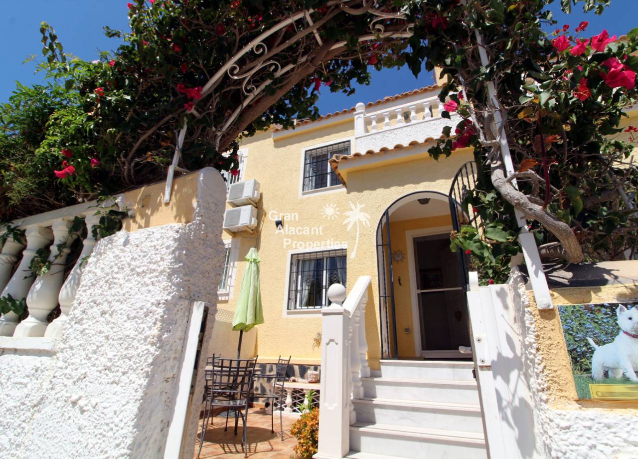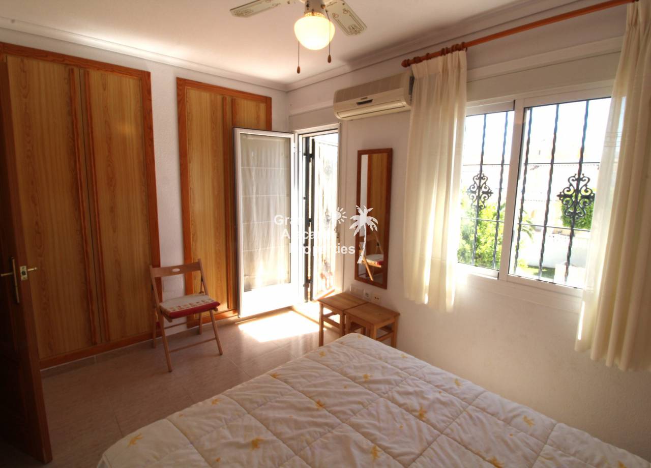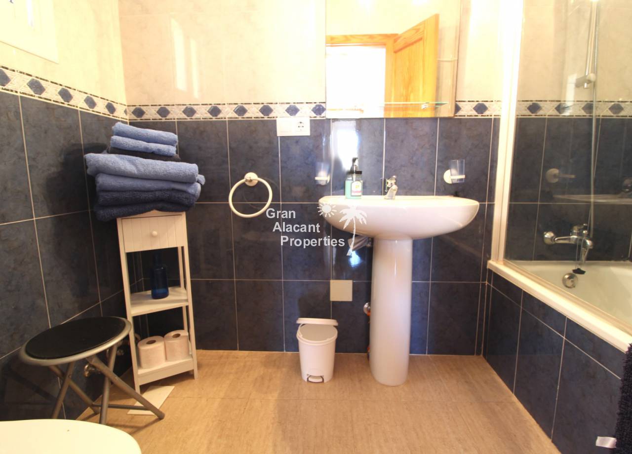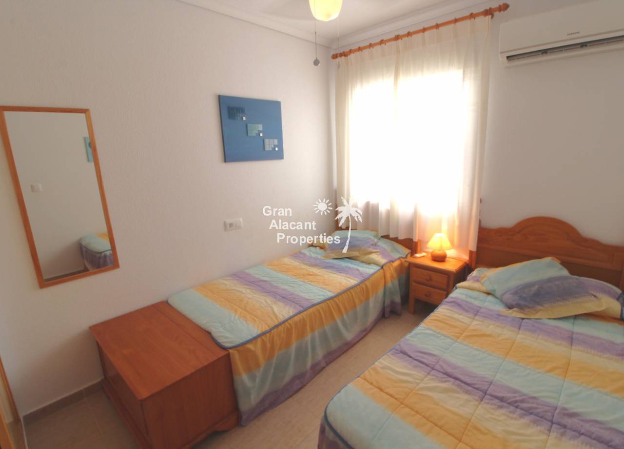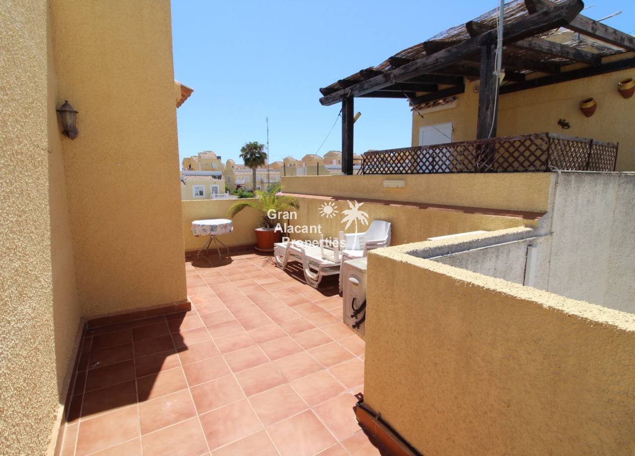 Immaculate south-east facing Gran Alacant townhouse in a great location for sale! We are proud to offer this well presented 2/3 bed townhouse on a sought after community in the lower part of Gran Alacant (zona colegio). Walk to the beach, shops, bars and more. On the ground floor, there is a large open plan air-conditioned living and dining space with an American-style kitchen which has been extended into the covered galleria and a bathroom. On the first floor, there is an air-conditioned master bedroom with built-in his and her wardrobes and private balcony overlooking the pool and community gardens, a second double bedroom with built-in wardrobe and a family bathroom. Located in the lower level of the house, there is a large basement with a window, which has been set up by the current owner as an additional bedroom, lounge and storage area. There are security bars and the property is sold fully furnished including all white goods (not including personal items) so the house move-in ready. Unpack your suitcase and enjoy.