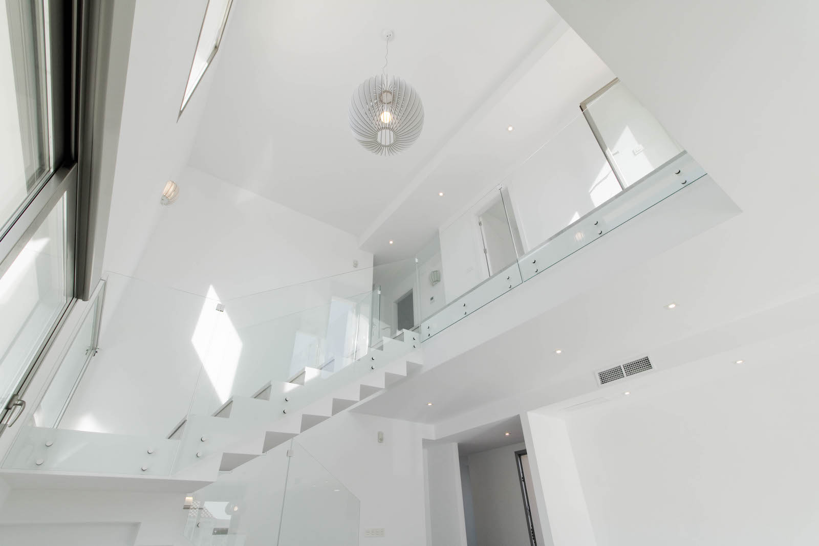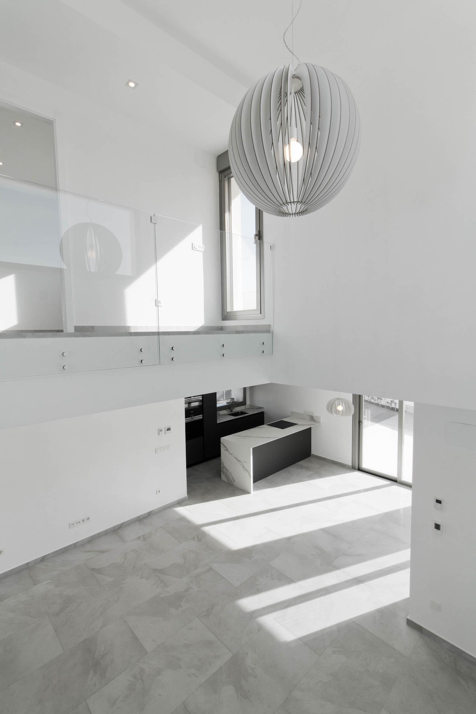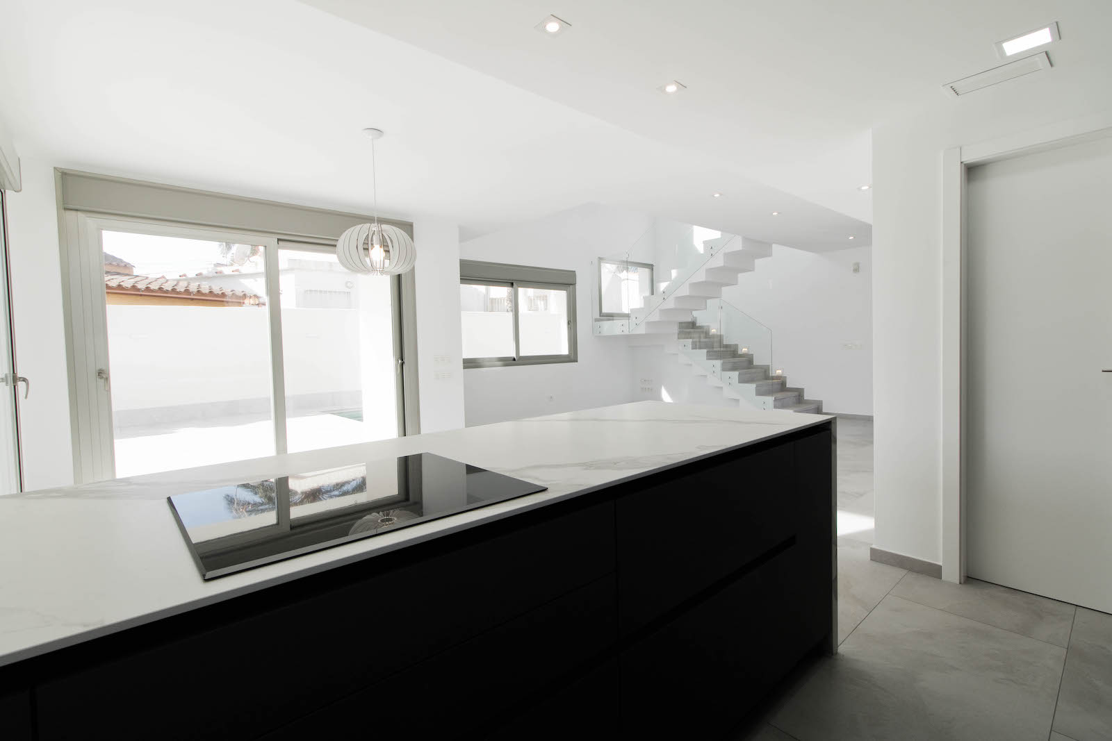 On the ground floor you will find a spacious kitchen-dining room with direct access to the pool area and double ceiling height with a view to the first floor, which gives a nice light to the kitchen and dining area. The kitchen is equipped with Siemens appliances. From the kitchen there is also access to a utility room. In addition, on the ground floor, there is a bedroom en-suite as well as a guest toilet.