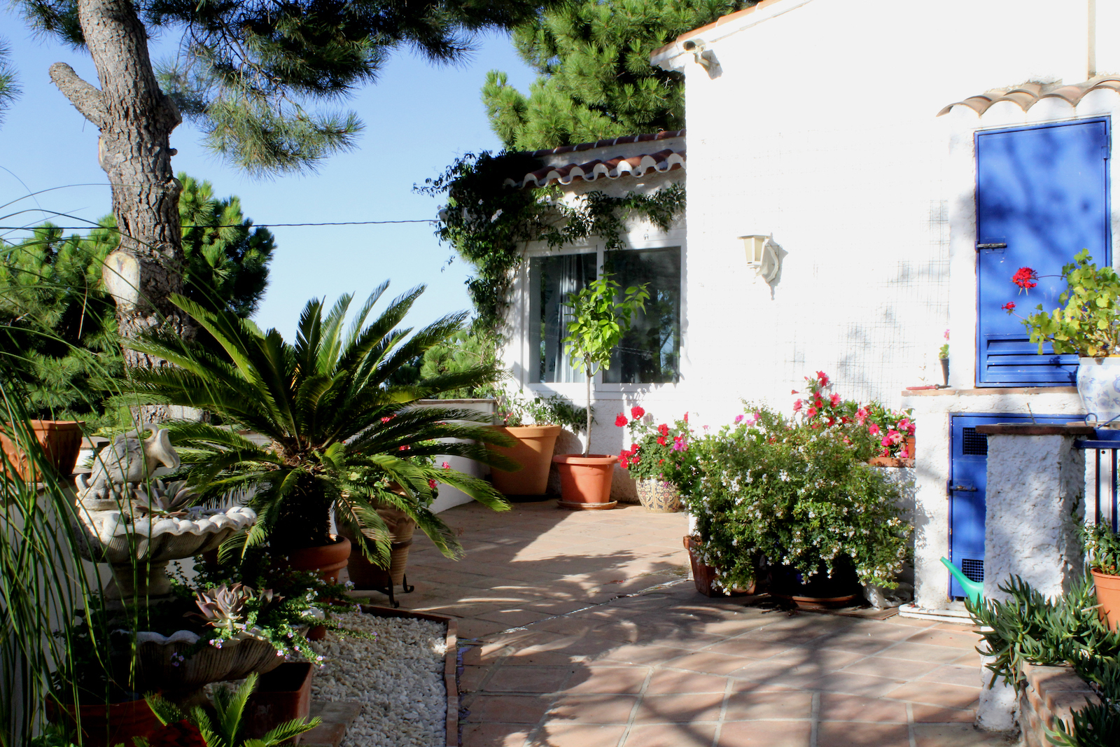 There is access to both sides of the house from here with each side enjoying sea views with the added benefit of the morning sun from one side and the afternoon sun from the other, so there is always a terrace in the sun. The living room has high ceilings with wood beams and a huge, lovely wood burner that can heat up the whole house during the winter months. The kitchen is more contemporary and yet retains its rustic style and is open to the living room. From the living room there is access to the two double bedrooms with fitted wardrobes, wood beams and extra storage. These bedrooms share a spacious bathroom with plenty of light. The end of the hall leads to the private master suite comprising bedroom, bathroom and a dressing room, which could double up as a nursery or small office. The master bedroom has access directly to one of the terraces and from this terrace a staircase leads to the guest room with its own bathroom. From this lovely room the guests have panoramic views to the mountains and sea. At the foot of the guest room stairs there is a delightful terrace which has a covered area for a hand-tiled outdoor dining table. From here a path with a few steps leads to another sitting area where the views to the mountain and sea can be enjoyed. The outdoor area is landscaped with several good terraces, beautiful flowers and trees.