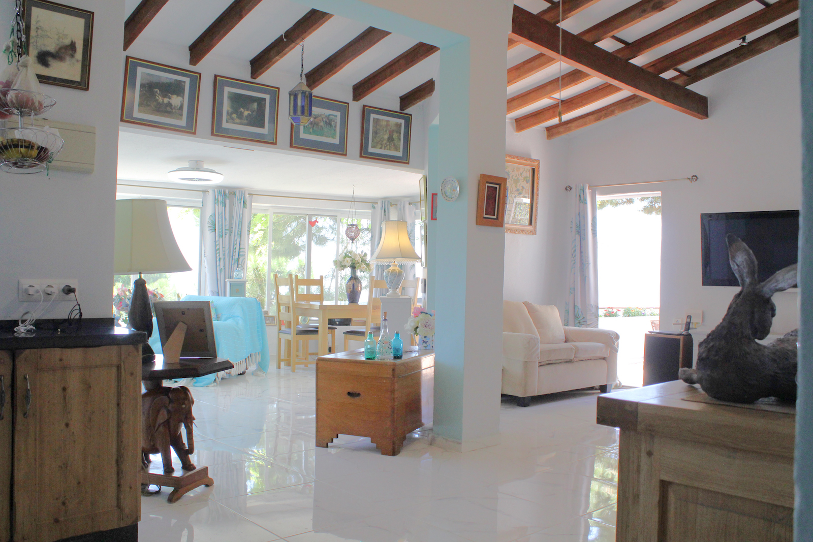 The villa has a private driveway, gate and parking with garage and a storage/laundry room. A path leads through the flowerbeds and garden to the entrance of the house through a hand-crafted wooden door that opens into the spacious living, dining, and kitchen area. This lovely room benefits from huge double-glazed glass windows that allow the stunning and beautiful sea and mountain views to come directly into the living room which can be enjoyed all the year round.