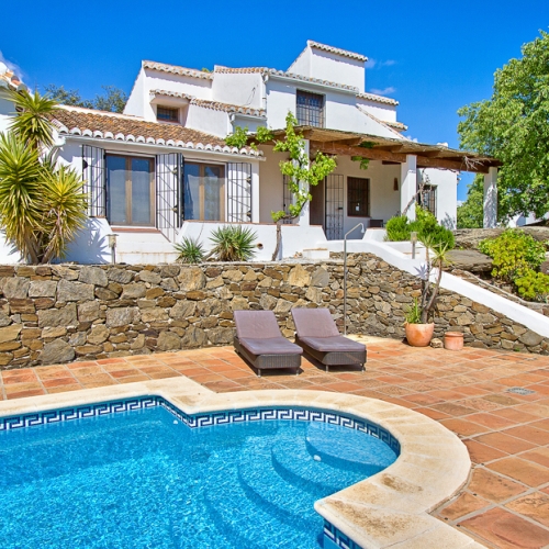 Poolområdena är mycket privat anlagda och omgivna av natur och fantastiska vyer. Från alla hörn. Garaget är täckt med vacker natursten, vilket också hjälper till att dekorera poolområdet och låta detta område utstråla spansk lantlig stil.
