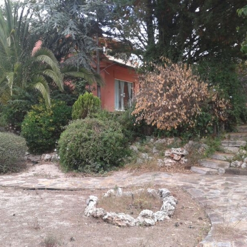 Vi tar trappan upp till andra våningen och kommer där in i det stora vardagsrummet, här finns även det andra badrummet. Vardagsrummet har både en vedkamin och air-condition, samt utgången till husets två härliga terrasser. På den första terrassen har ni morgonsol, underbart ställe att äta frukost. Vi går runt hörnet och tar utomhustrappan upp till den översta terrassen, här har ni sol och härlig havsutsikt hela dagen.
