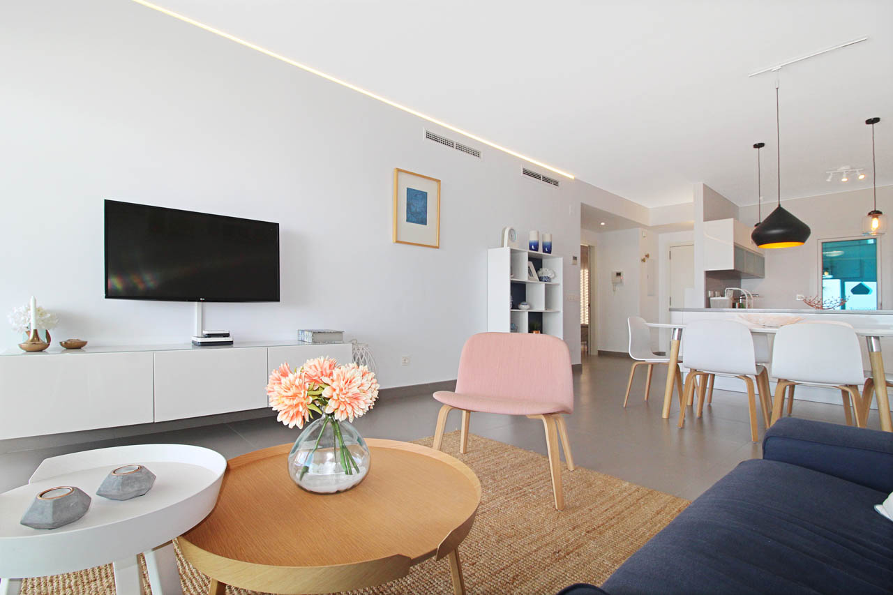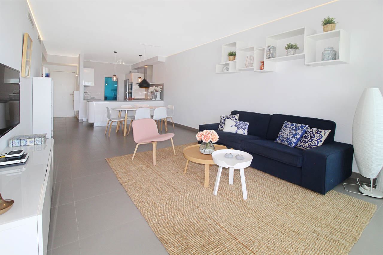 From the open kitchen into the livingroom, you have big glass doors out to the terrace as well and from here you have a nice view to the pool, garden and sea.