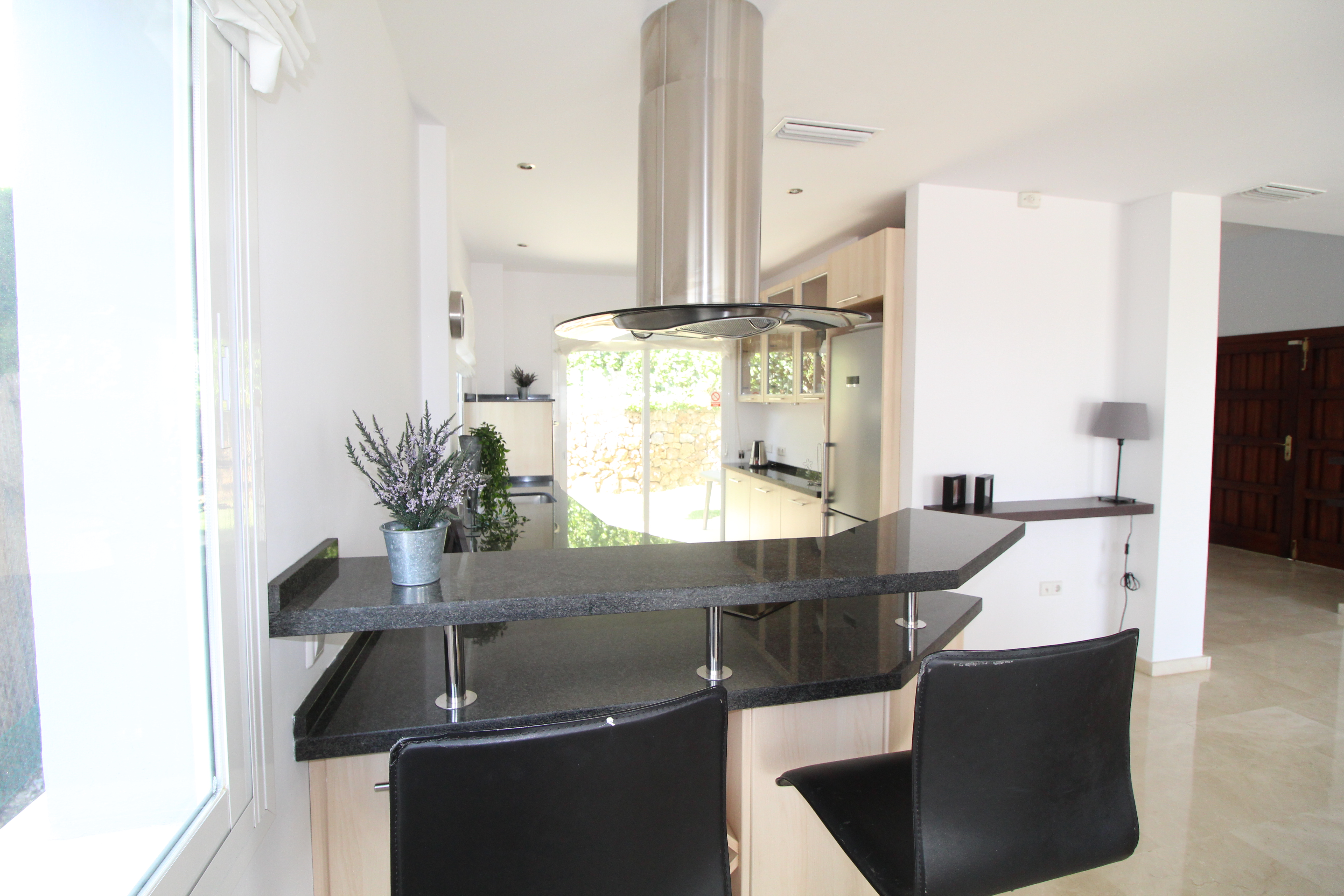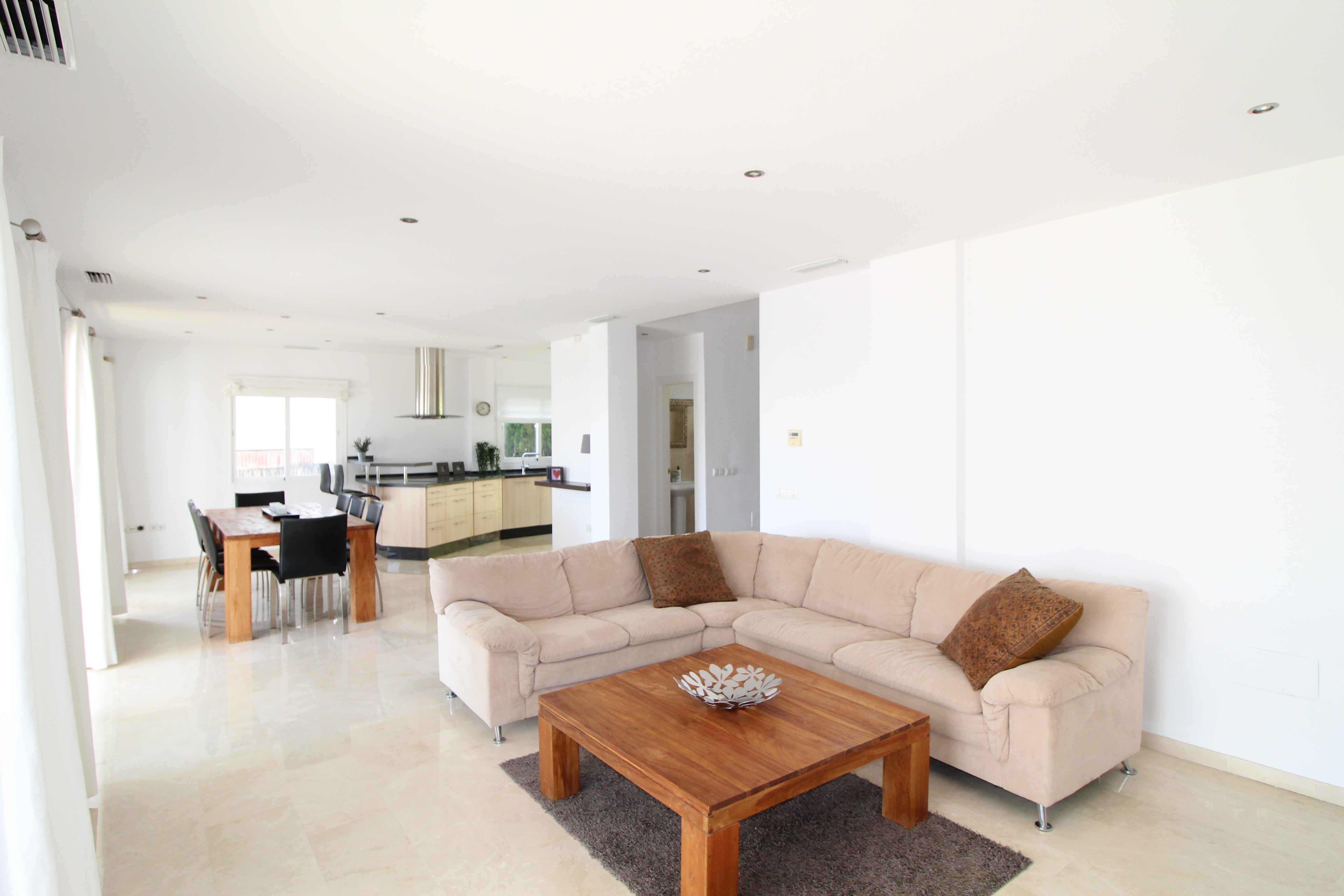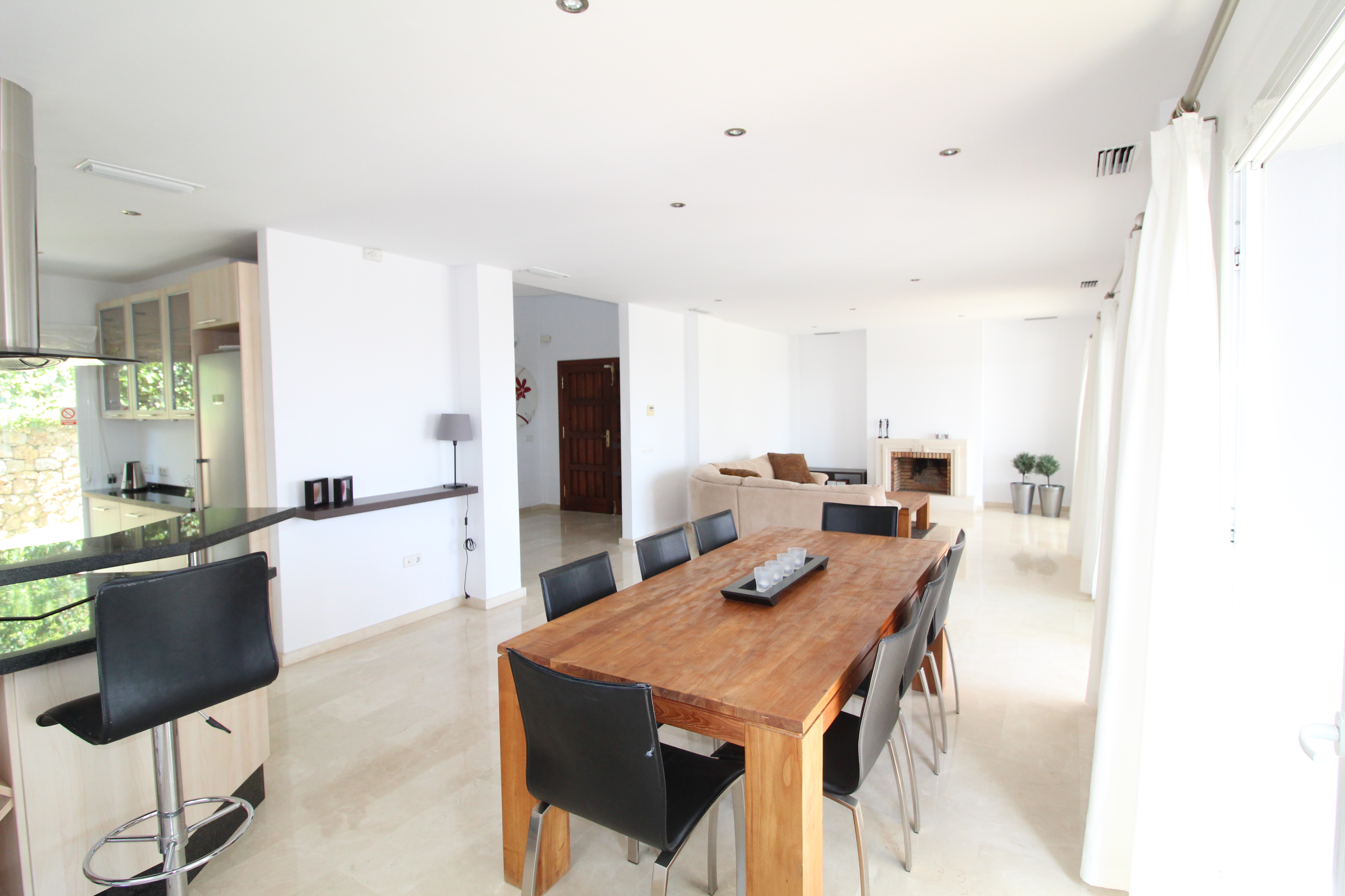 The villa is distributed over 3 floors - ground floor you have a scandinavian style open plan kitchen and livingroom with a guest toilet. From the kitchen and livingroom you have 4 accesses to the terrace, where you find the infinity pool looking over the mountains.